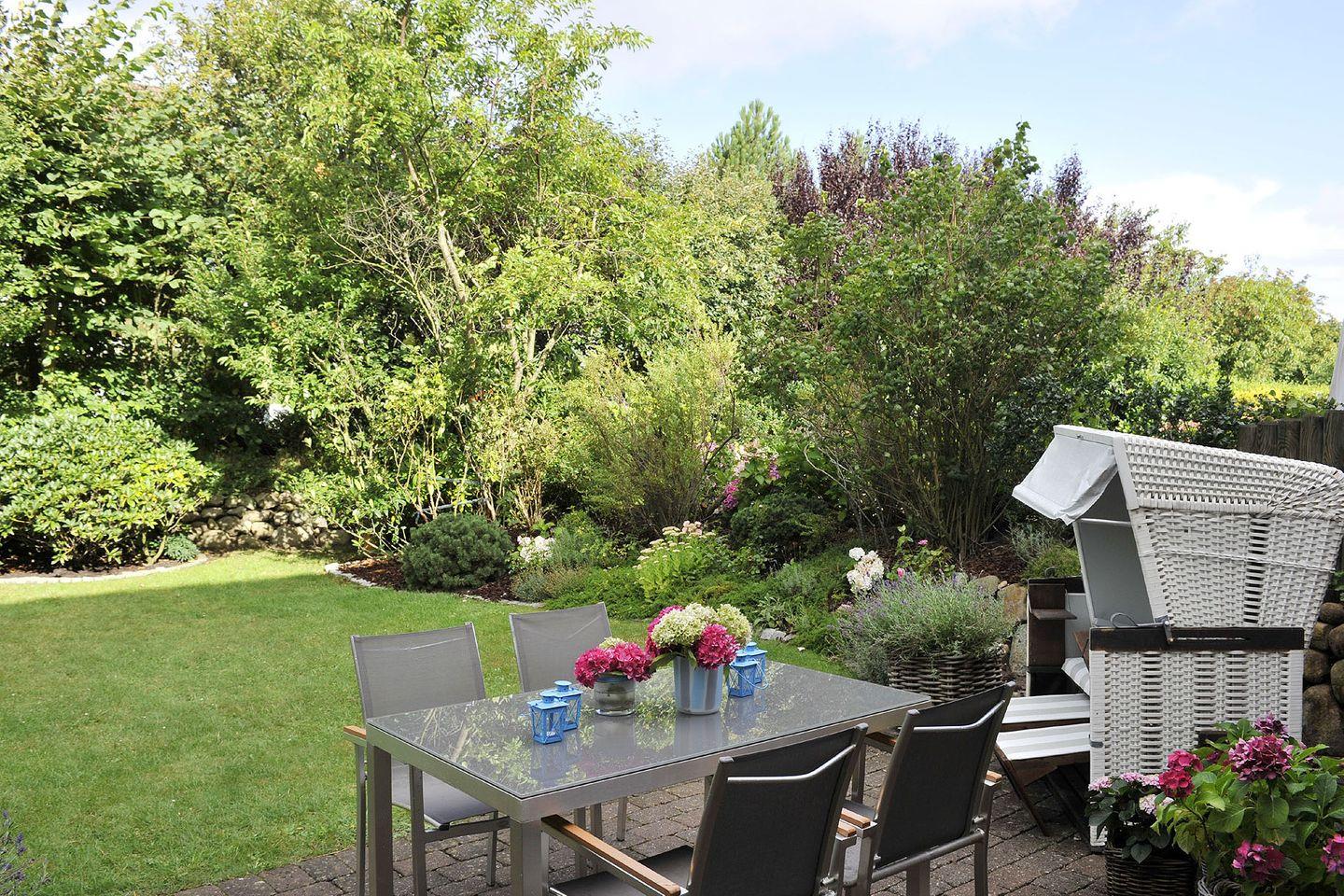 Erdgeschoss: Flur, Gäste-WC, komplett eingerichtete offene Küche mit Nespresso-Maschine, Wohnzimmer mit Esstisch, Gaskamin und TV, ruhiger, eingewachsener Garten mit West-Terrasse, Gartenmöbeln und Strandkorb