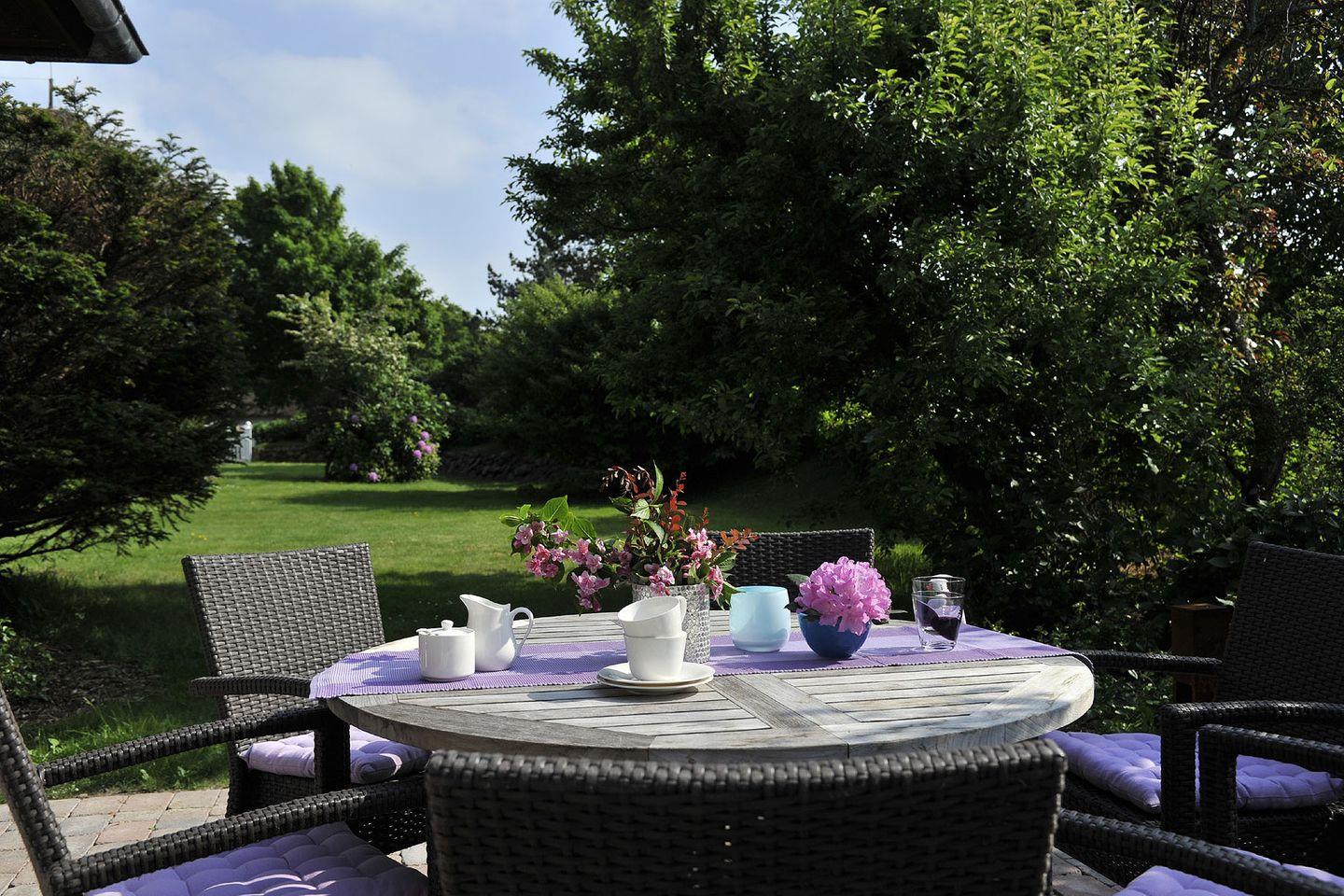 Erdgeschoss: Flur, Badezimmer mit Dusche und WC, komplett eingerichtete, offener Küche, Esstisch, Ethanol Kaminwandbild, Wohnzimmer mit TV, offener Garten, Südwest-Terrasse mit Gartenmöbeln und Strandkorb