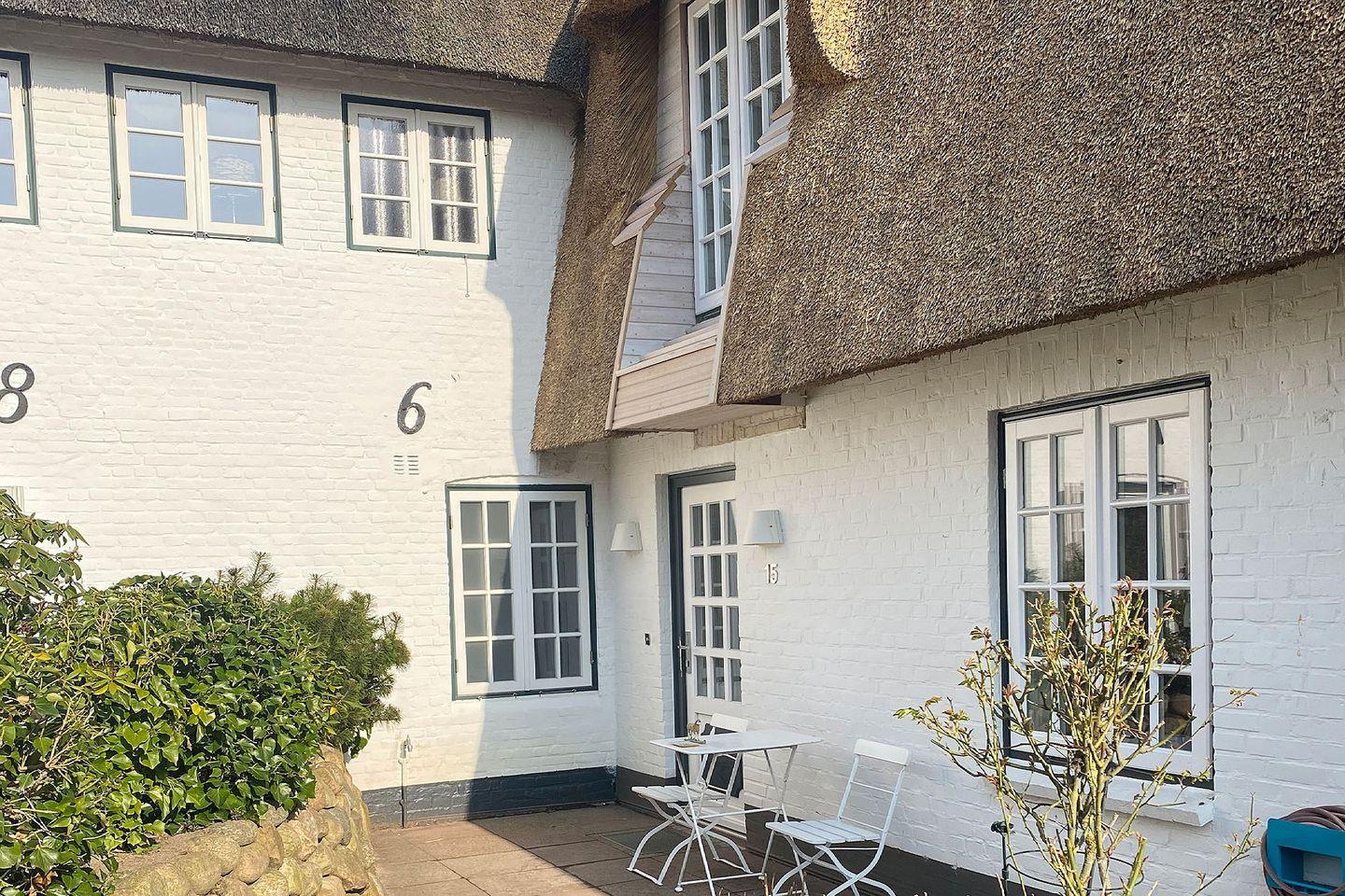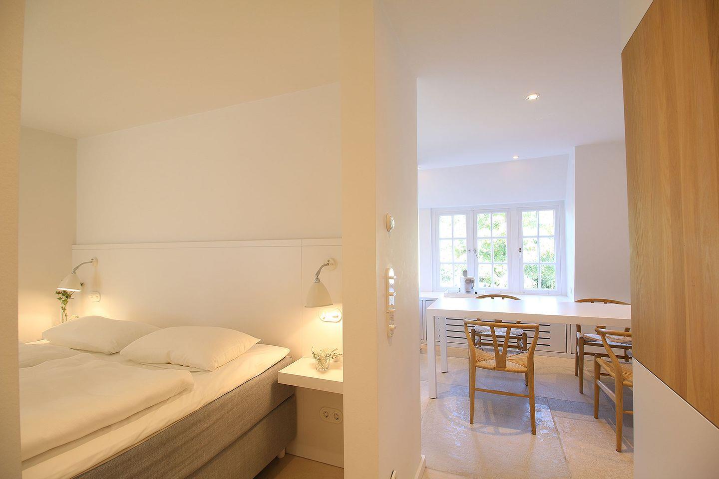 Das exklusive 4-Sterne Ferien Domizil Stutenhof 15 liegt am Gurtstig mitten in Keitum. Im 1. Obergeschoss ist alles auf einer Ebene zusammengefügt und bietet auf 40 m² Platz für ein oder zwei Personen zum Schlafen, Essen, Wohnen und Leben. Das Ferien Domizil wurde im Jahr 2018 umfassend renoviert und ist puristisch und reduziert eingerichtet. In der gesamten Wohnung befinden sich hochwertige Tischlerarbeiten. Eine besondere Atmosphäre schaffen die als Bodenbelag verwendeten handgefertigten Originalnachbildungen antiker Marmor- und Kalksteinplatten – Castle Stones Platten. Das Bad glänzt mit hochwertigen Sanitärobjekten von Laufen und Armaturen und einer Regendusche von Dornbracht. Der offene Schlafraum ist mit einem exklusiven Treca Bett ausgestattet. Im Wohnraum mit integrierter Teeküche befindet sich ein großer Tisch mit Y-Chairs von Hans Wegner/Tondern und einem Sofa. Die kleine Küche ist ausgestattet mit Produkten der Firmen Gunther Lambert und Le Creuset. Da bewusst mit wenig Stoffen gearbeitet wurde, eignet sich die Wohnung sehr gut für Allergiker. Sie erhält durch einen separaten Eingang den Charme und den Charakter eines eigenen Hauses. Der Sitzplatz vor dem Haus wartet auf mit einem wunderbaren Blick auf den Randershof. Im hinteren Teil des Gartens lädt eine Liegefläche zum Verweilen ein.