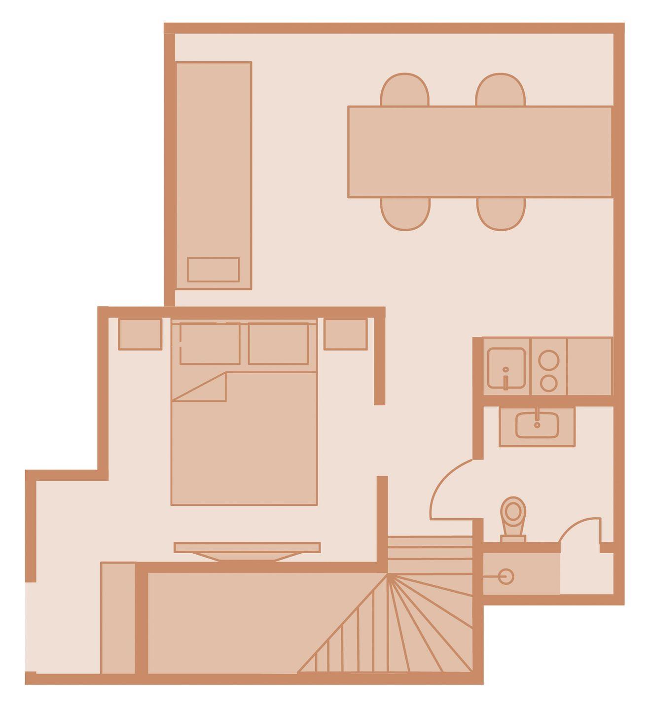 Obergeschoss: Wohnraum mit Esstisch und Daybed, hochwertig ausgestattete Teeküche mit Kühlschrank, Geschirrspüler und 2 Herdplatten (Grillbackofen kann angefragt werden), offenes Doppelzimmer mit TV, Badezimmer mit Regendusche und WC.