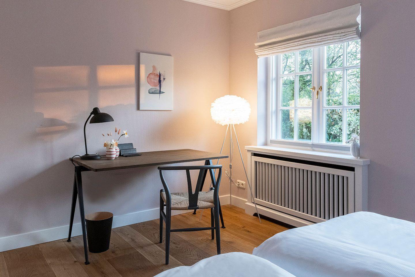 Das im »Nordisch-Skandi-Style« eingerichtete Ferien Domizil »Vogelgezwitscher« befindet sich im Erdgeschoss des Groot‘s Hu¨s und bietet mit 60 m² und einer Ebene ausreichend Platz fu¨r zwei Personen. Die nach Su¨den ausgerichtete Terrasse mit Strandkorb und Gartenmöbeln erweitert den Wohnbereich zum Gemeinschaftsgarten. Die Farben der Nordsee – Luft-, Sand-, Seen- und Wälderfarben – sind die Inspirationsquelle fu¨r die neue Farbwelt des Groot‘s Hu¨s. Sie finden sich in den Wandtönen und tragen so schöne Namen wie »Light Sand«, »Powder Nude« und »Ocean«. Klare Linien und Formen, helles und dunkles Holz, Felle und Naturtextilien schaffen ein harmonisches Miteinander. Neben nordischen Designklassikern wie z.B. die Schreibtischlampe »Kaiser Idell« von Fritz Hansen, konzipiert 1933 vom Bauhaus-Designer Christian Dell, wurden moderne Klassiker fu¨r die Inneneinrichtung ausgewählt. Der Wohn-Essraum ist mit einer modernen, kompakten Ku¨chenzeile ausgestattet. Leben im Ferien Domizil »Vogelgezwitscher« verspricht anspruchsvolles Wohnen in luftigen Räumen.
