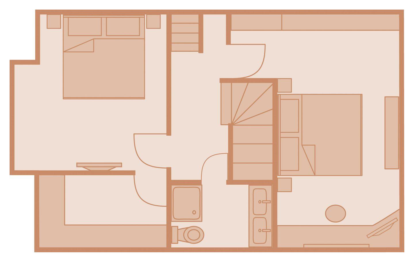 Obergeschoss:1 Doppelzimmer mit TV, 1 Doppelzimmer mit TV und Ankleideraum, 1 Badezimmer mit Dusche und WC