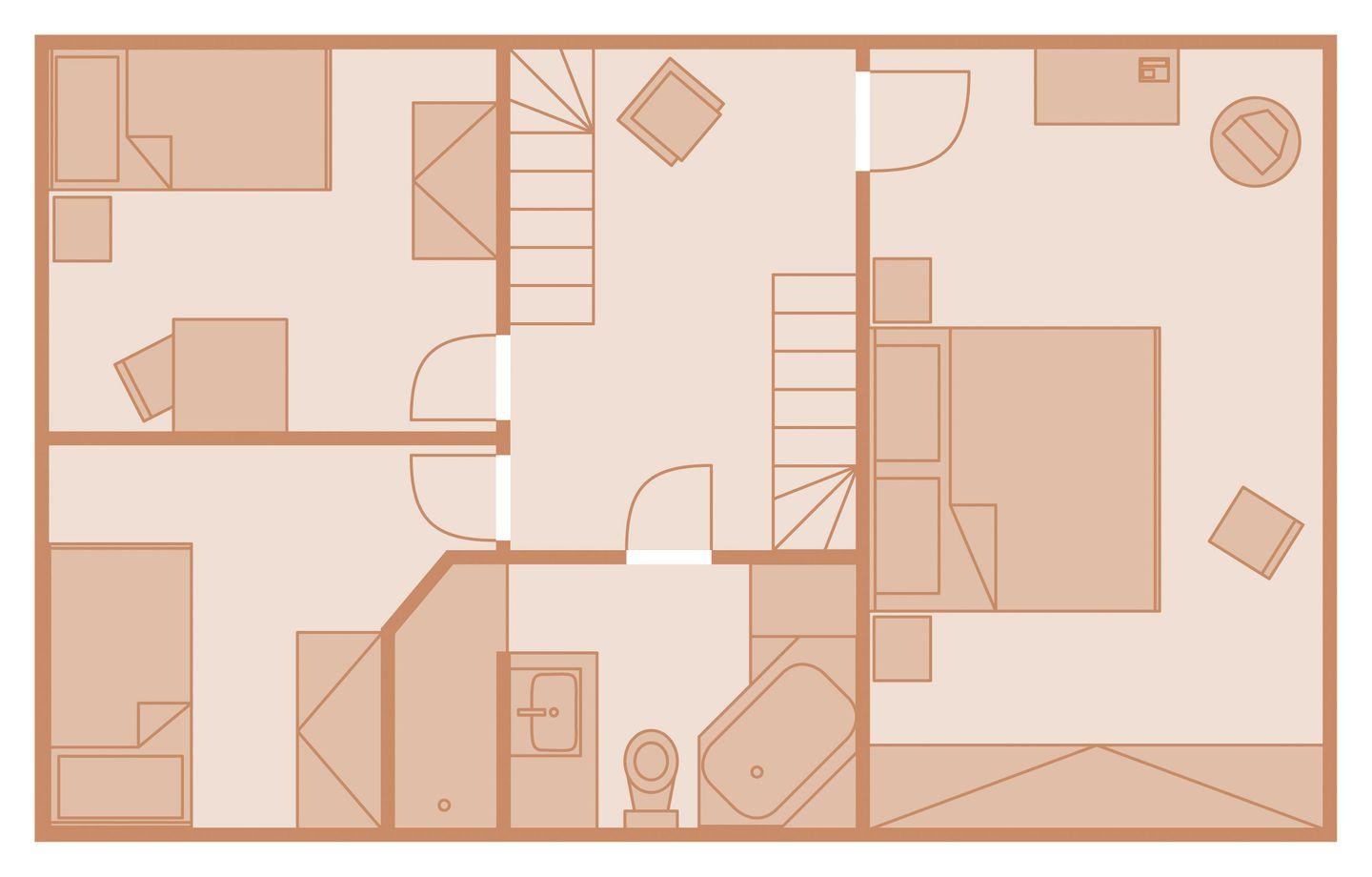 Obergeschoss: 1 Doppelzimmer mit TV, 2 Einzelzimmer, Badezimmer mit Dusche und WC