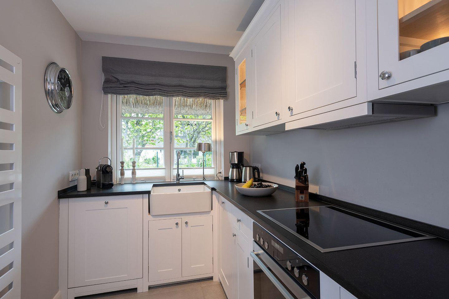 Erdgeschoss: Flur, komplett eingerichtete, separate Küche mit Nespresso-Maschine und Waschmaschine in der Abstellkammer, Badezimmer mit Dusche und WC, Wohnzimmer mit Esstisch, Holzkamin und TV, eingewachsener, ruhiger Garten, Südwest-Terrasse mit Gartenmöbeln und Sonnenkuhle mit Strandkorb