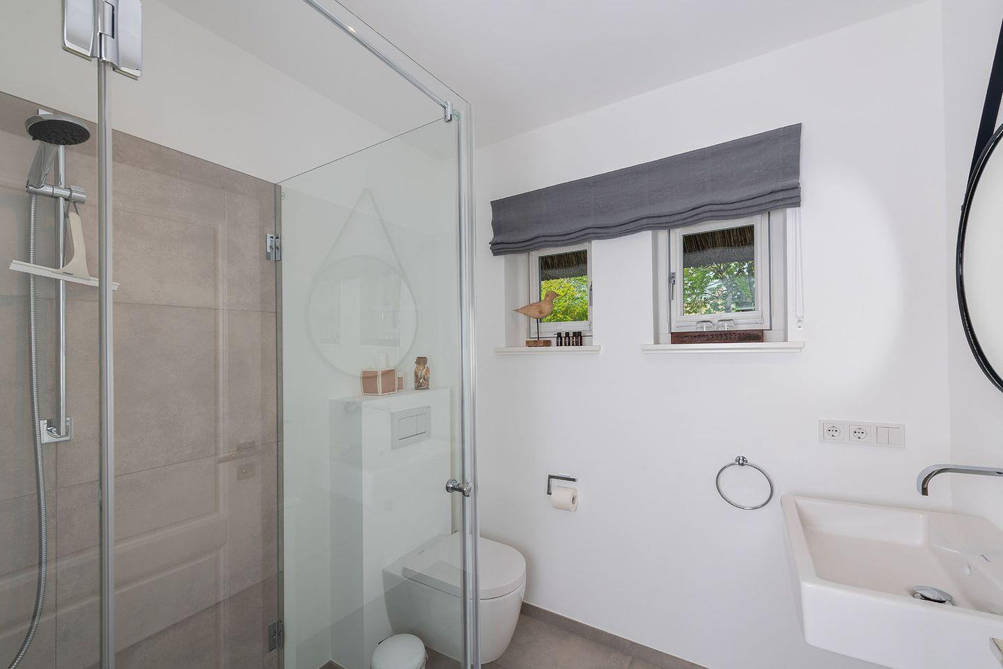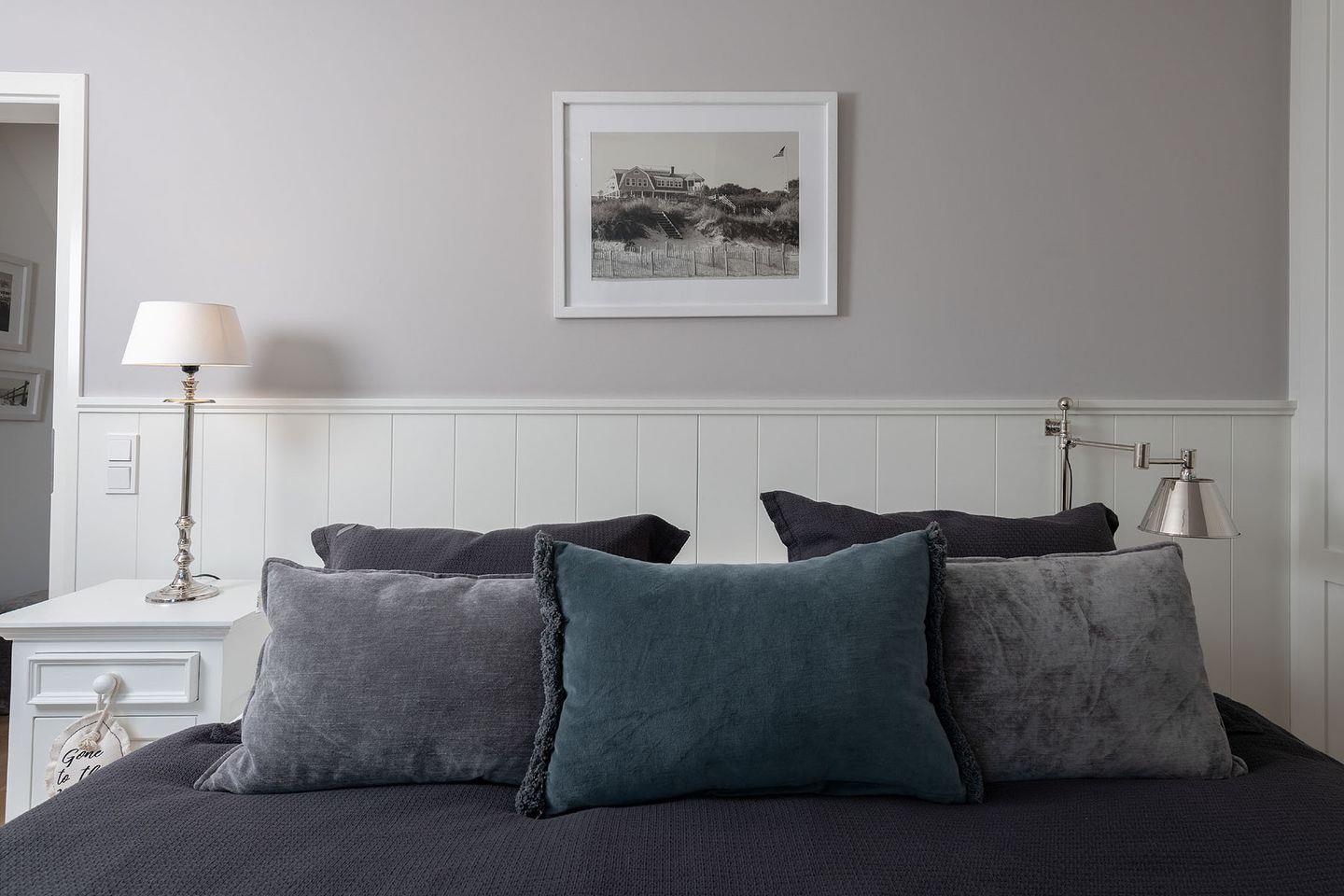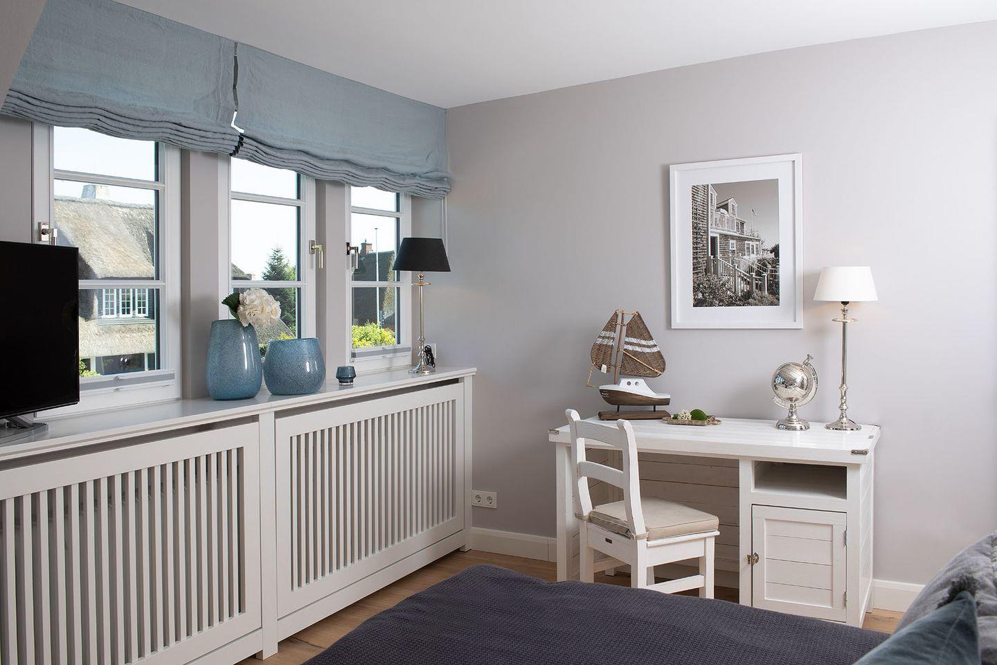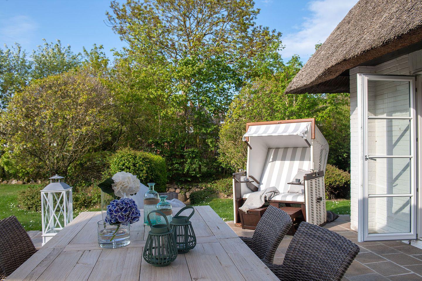 Das exklusive 5-Sterne Ferien Domizil an der Keitumer Süderstraße 13 erstreckt sich über zwei Ebenen und bietet auf 100 m² ausreichend Platz für bis zu vier Personen. Das Ferien Domizil unter Reet wurde im Jahr 2018 umfassend und hochwertig renoviert. Das Blau und Grau der Wände in den oberen Schlafräumen und der mit viel Liebe zum Detail ausgesuchten Wohnaccessoires schaffen eine entspannende und beruhigende Wohlfühlatmosphäre. Im lichten, offenen Wohn- und Esszimmer befindet sich ein großzügiger Esstisch und eine kuschelige Wohnlandschaft. Nach einem ausgiebigen Strandspaziergang laden an kalten Tagen der Kamin im Wohnzimmer sowie die Sauna im Obergeschoss zum Entspannen und Wohlfühlen ein. Ein ideales Domizil auch für die ruhigere Jahreszeit. Die nach Süd-Westen ausgerichtete in Naturstein ausgeführte Terrasse öffnet den Wohnbereich zu den Sonnenplätzen im 750 m² großen Garten. Es ist ein wunderbarer, sonnenbeschienener Rückzugsort mit Gartenmöbeln und Strandkorb. Hier lässt sich die Freiheit, die eines großen Gartens zu eigen ist, finden und intensiv genießen.