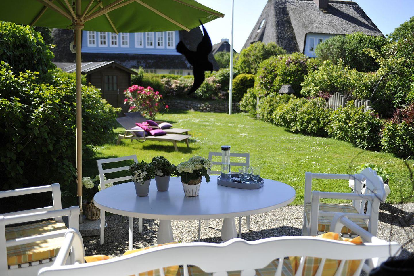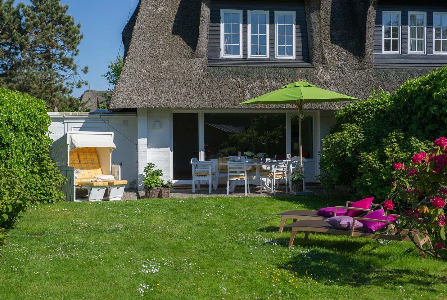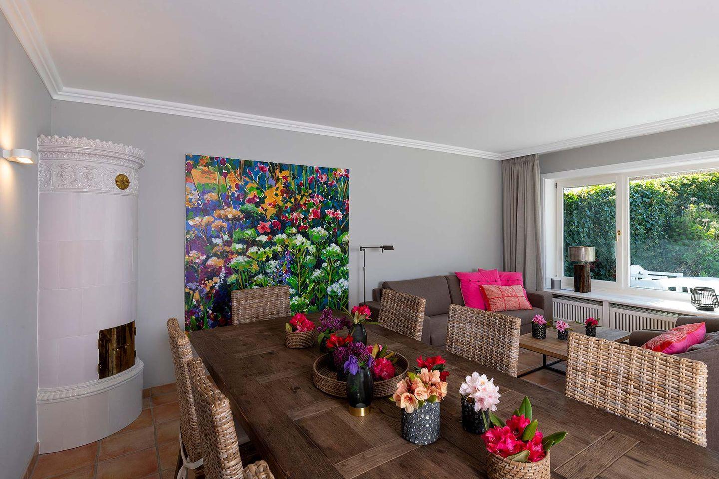 Das exklusive 5-Sterne Ferien Domizil ist ein großzügiger Ort. Auf 125 m² verteilt auf drei Ebenen, bietet es für maximal sechs Personen viele Möglichkeiten, sich zu versammeln, gemeinsam zu essen, ausgiebige Gespräche am langen Esstisch zu führen oder sich einfach nur zurück zu ziehen. Von klarer Hand und mit einer Vorliebe für warme und leuchtende Farben, wurde das Domizil im Winter 2014 neu konzipiert und ausgestattet. Während die Räume des Obergeschosses und des Spitzgiebels mit ihren pastelligen Tönen ein angenehmes und ausgleichendes Wohnklima vermitteln, wirken die warmen Rot- und Violetttöne des Erdgeschosses belebend auf seine Bewohner. Das helle Wohnzimmer mit seinem großen Essplatz und gemütlichen Loungebereich spiegelt den Anspruch zeitgemäßen Wohnens. Warme Rottöne werden hier kombiniert mit Erdfarben und Naturtönen. Im Eingangsbereich, zwischen Küche und Wohnzimmer, findet sich ein weiterer großer Tisch mit umlaufender Sitzbank. Dieser Platz ist bereits avanciert zum Lieblingsplatz der jüngsten Bewohner, denn hier hat man alles im Blick. Die große Terrasse erweitert den Wohnbereich zu den Sonnenplätzen im Garten. Schöne Gartenmöbel laden zum Entspannen und Wohlfühlen im eingewachsenen Garten ein.