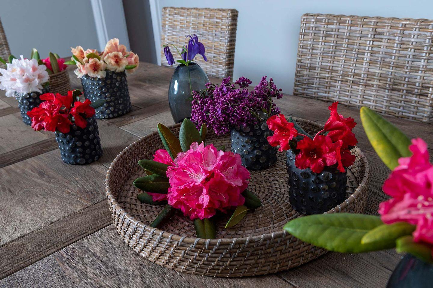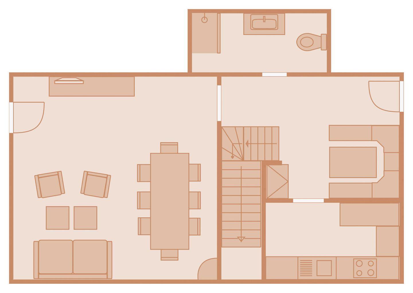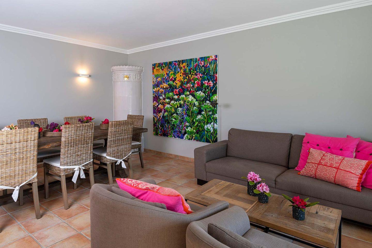 Das exklusive 5-Sterne Ferien Domizil ist ein großzügiger Ort. Auf 125 m² verteilt auf drei Ebenen, bietet es für maximal sechs Personen viele Möglichkeiten, sich zu versammeln, gemeinsam zu essen, ausgiebige Gespräche am langen Esstisch zu führen oder sich einfach nur zurück zu ziehen. Von klarer Hand und mit einer Vorliebe für warme und leuchtende Farben, wurde das Domizil im Winter 2014 neu konzipiert und ausgestattet. Während die Räume des Obergeschosses und des Spitzgiebels mit ihren pastelligen Tönen ein angenehmes und ausgleichendes Wohnklima vermitteln, wirken die warmen Rot- und Violetttöne des Erdgeschosses belebend auf seine Bewohner. Das helle Wohnzimmer mit seinem großen Essplatz und gemütlichen Loungebereich spiegelt den Anspruch zeitgemäßen Wohnens. Warme Rottöne werden hier kombiniert mit Erdfarben und Naturtönen. Im Eingangsbereich, zwischen Küche und Wohnzimmer, findet sich ein weiterer großer Tisch mit umlaufender Sitzbank. Dieser Platz ist bereits avanciert zum Lieblingsplatz der jüngsten Bewohner, denn hier hat man alles im Blick. Die große Terrasse erweitert den Wohnbereich zu den Sonnenplätzen im Garten. Schöne Gartenmöbel laden zum Entspannen und Wohlfühlen im eingewachsenen Garten ein.