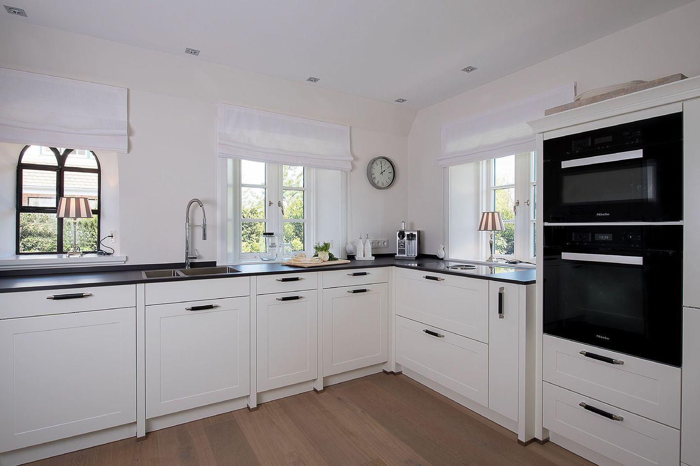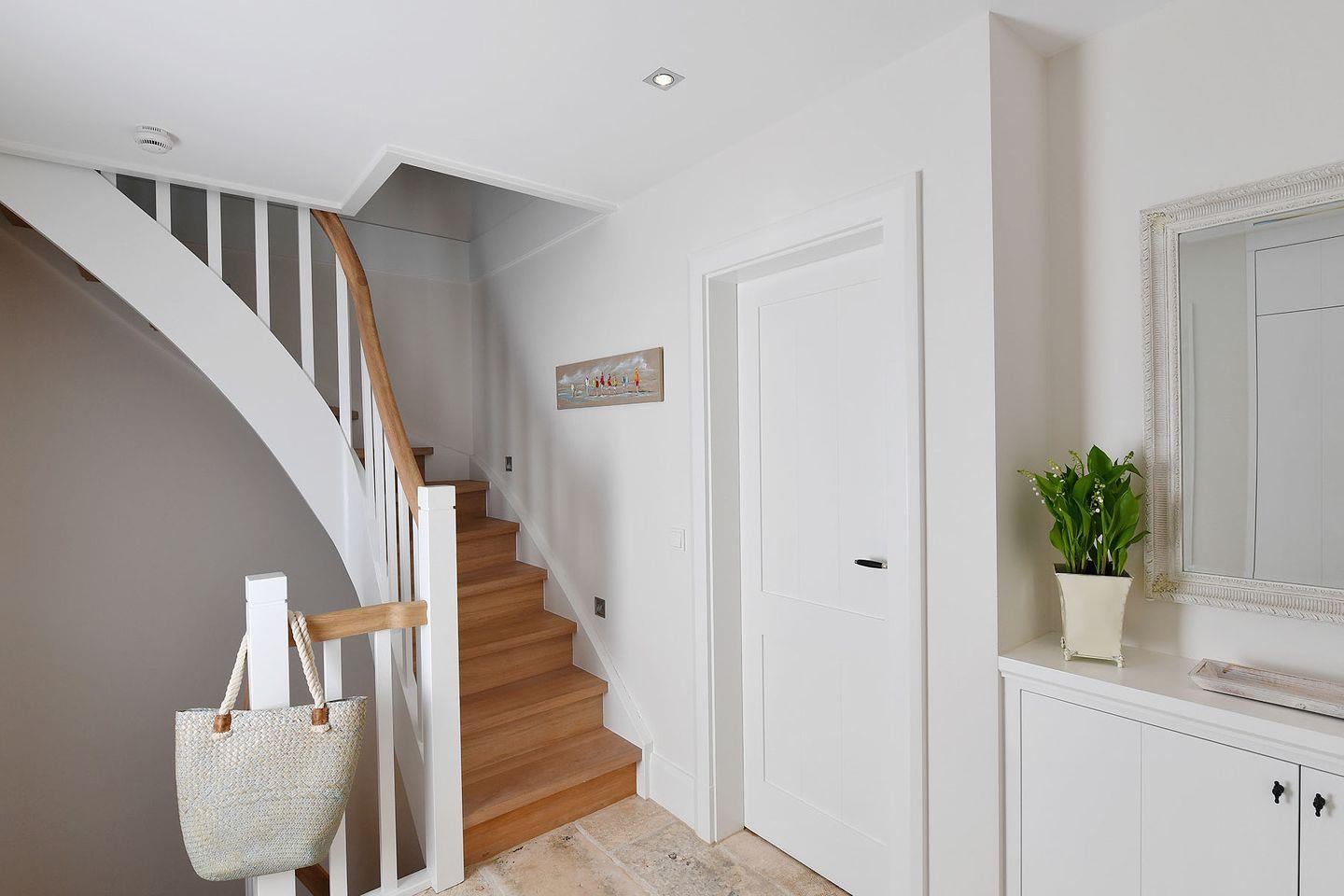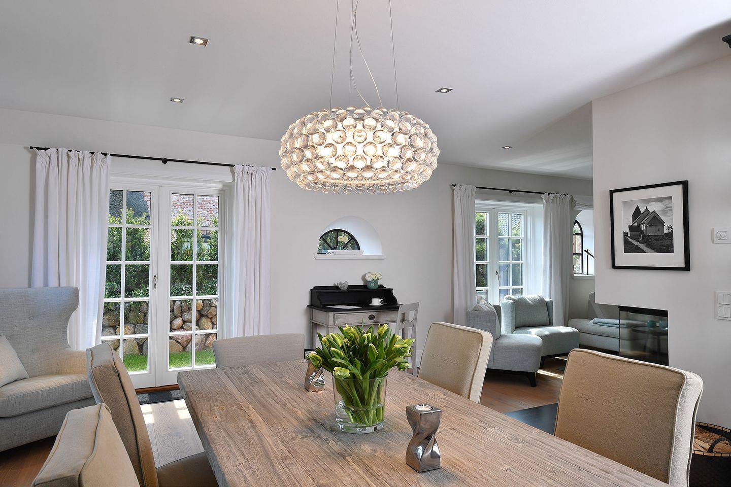 Erdgeschoss: Flur, Gäste-WC mit Dusche, komplett eingerichtete offene Küche mit Nespresso-Maschine und Filtermaschine, Essbereich, Wohnzimmer mit Kamin und TV, Garten, Ost-Terrasse mit Gartenmöbeln und Strandkorb