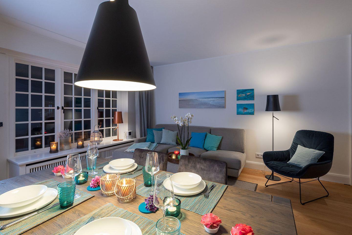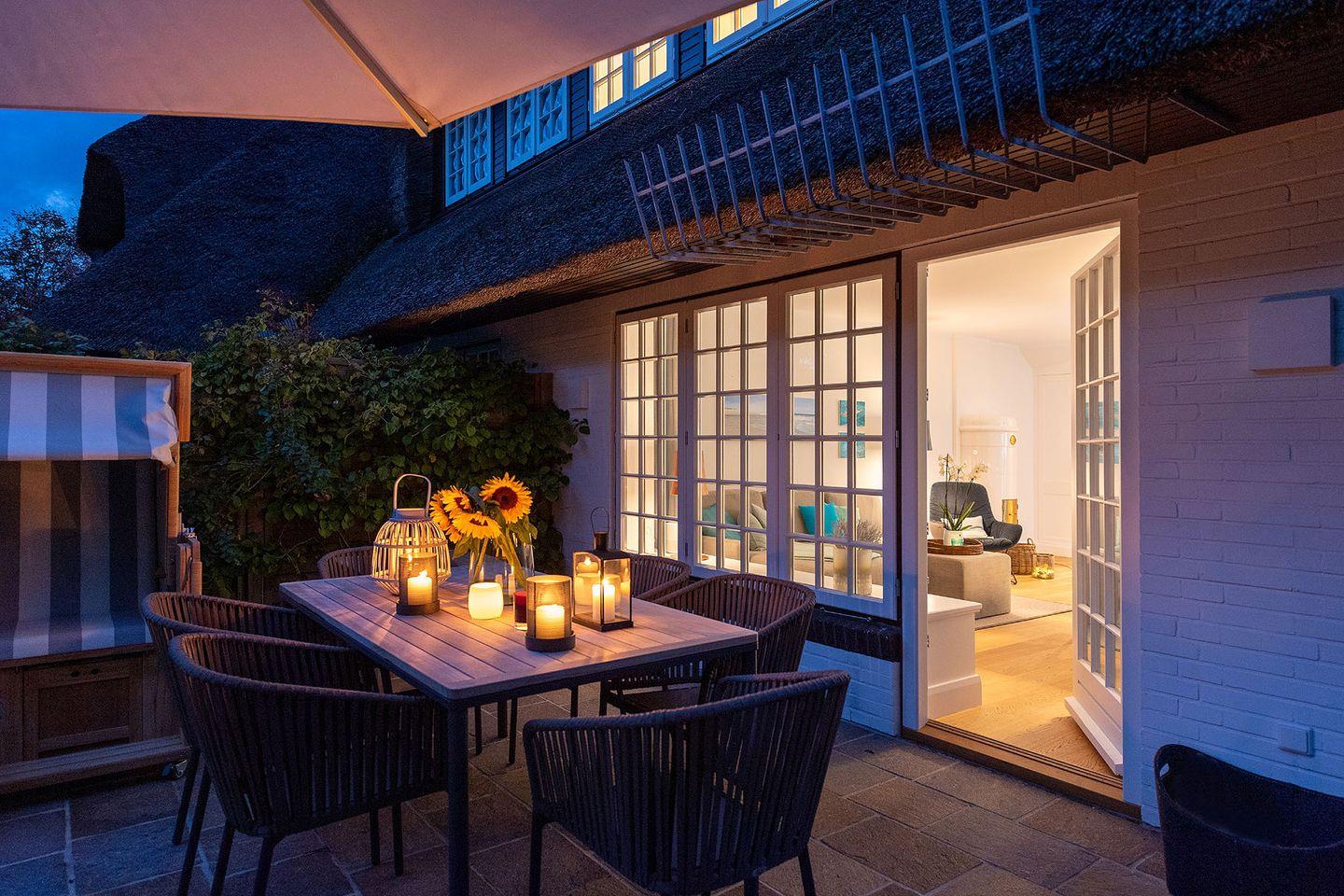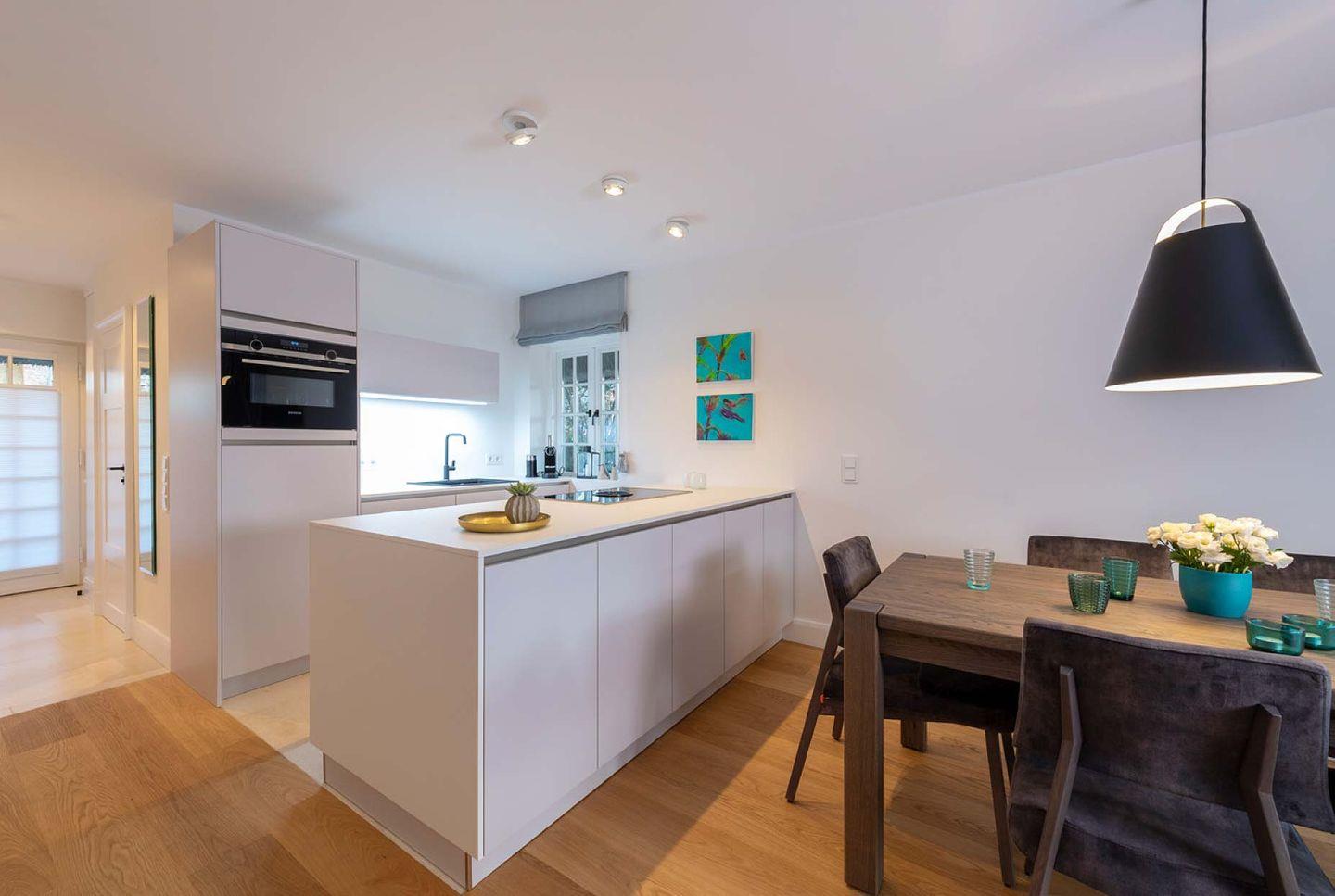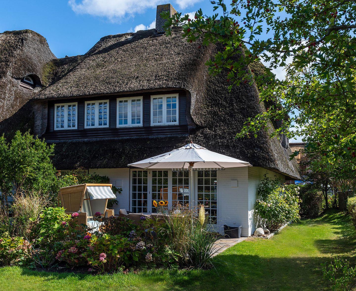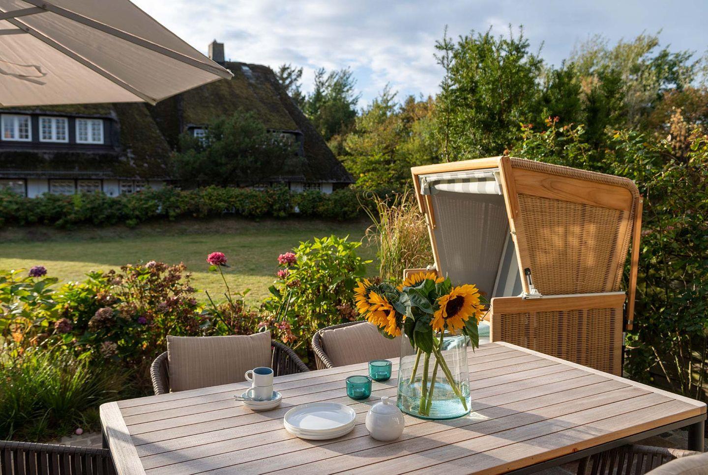 Das exklusive 5-Sterne Ferien Domizil im Westerhörn 16 in Keitum wurde im Sommer 2019 vollständig und hochwertig renoviert und gehört seitdem zum Portfolio des Benen-Diken-Hofs. Es bietet anspruchsvolle Wohnkultur kombiniert mit modernem Badambiente. Vier Personen finden auf drei Ebenen und 105 m² ausreichend Platz. Im sympathischen Ferien-Apartment hat alles seinen Platz. Es bietet mit einem durchdachten Raumsystem viel Platz für seine Bewohner und für Mitgebrachtes. Im offenen Wohn- und Essbereich befindet sich ein großzügiger Esstisch und eine kuschelige Wohnlandschaft. Die offene Küche zeugt von moderner Raumgestaltung und bietet mit ihrer Ausstattung alles für ein gemeinsames Kochvergnügen. An kalten Tagen spendet ein Kachelofen angenehme Wärme. Wände in pastelligen Türkis- und Blautönen verwandeln die Schlafräume in den beiden oberen Etagen in Inseln der Ruhe. Das klare und pure Raumkonzept setzt sich auch hier fort. Die nach Süd-Westen ausgerichtete in Naturstein ausgeführte Terrasse öffnet den Wohnbereich zu den Sonnenplätzen im 200 m² großen Garten. Es ist ein wunderbarer, sonnenbeschienener Rückzugsort mit Gartenmöbeln und Strandkorb. Hier lässt sich die Freiheit, die eines großen Gartens zu eigen ist, finden und intensiv genießen.
