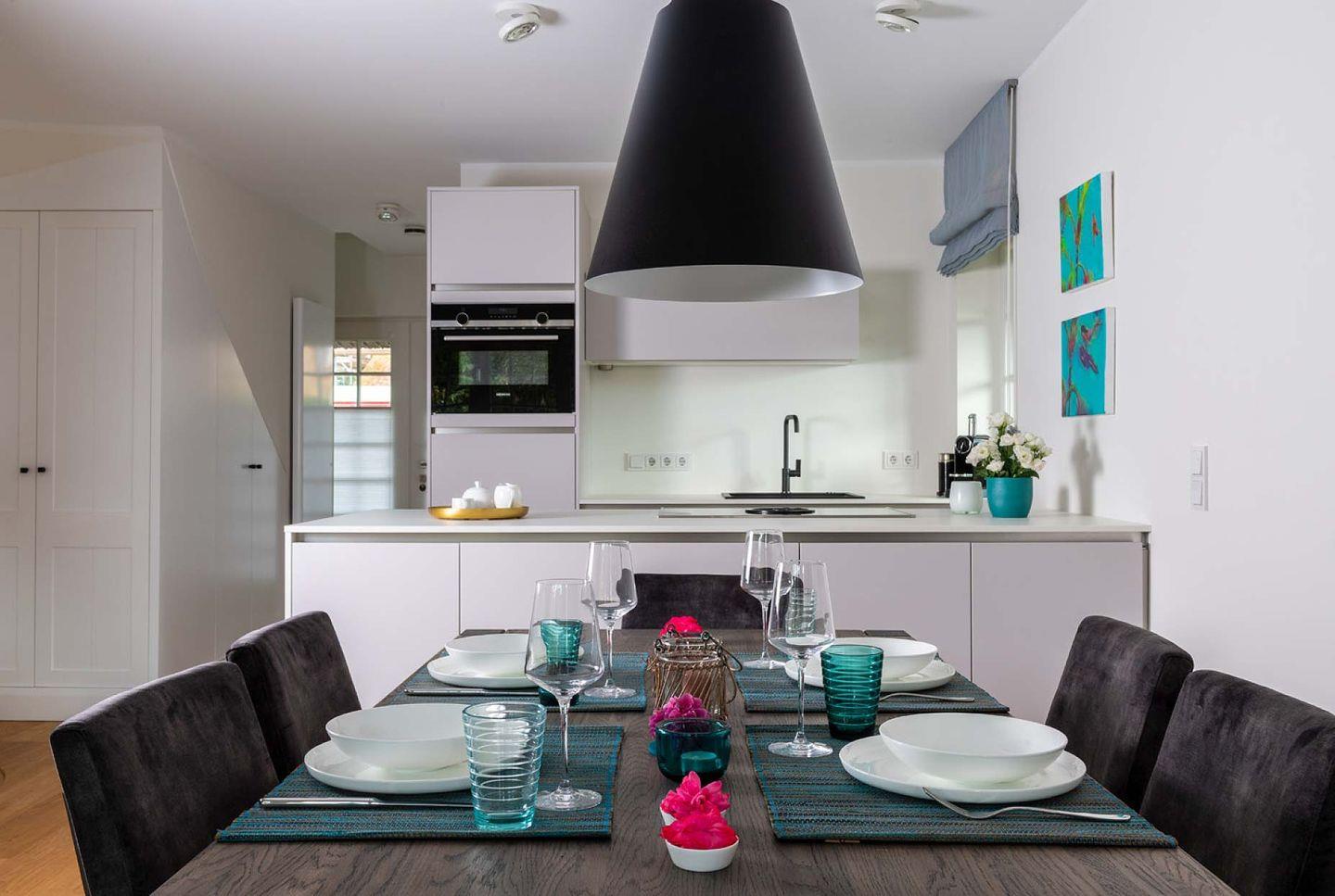 Erdgeschoss: Flur, Badezimmer mit Dusche und WC, komplett eingerichtete, offene Küche mit Nespresso-Maschine, Wohnzimmer mit Esstisch, Kamin und TV, offener Garten, Südwest-Terrasse mit Gartenmöbeln und Strandkorb