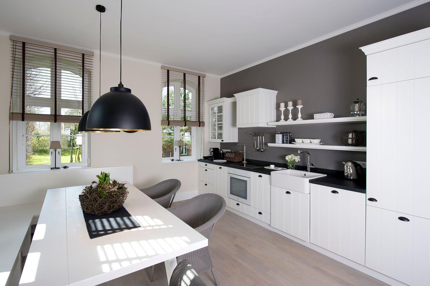 Die große und imposante, im Erdgeschoss gelegene, Wohnung Zollhaus 1 im Gurtstig 52 in Keitum bietet auf 111 m² ausreichend Platz für maximal sechs Personen. Von der Diele gelangt man über einen gemütlichen Wohnraum mit geräumiger Bücherwand und direktem Zugang zum Garten, zur großen Küche. Sie ist das Herzstück des Zollhauses. Zahlreiche Fenster schenken dem Raum ein wohliges Licht. Die integrierte Landhausküche, der ausladende Esstisch mit abgestimmter Eckbank, anspruchsvolle Schwarz-Weiß-Fotografien und die helle Farbgebung erzeugen eine Wohlfühl-Atmosphäre. Insgesamt gibt es drei großzügige und charmante Schlafräume und zwei hochwertig ausgestattete und helle Bäder. Zur Wohnung gehört eine großzügige Terrasse mit Sonnenplätzen am großen Gartentisch oder in einem der Teakholzsitzmöbel, eine komplette Küchenausstattung, TV, WLAN, Musikanlage und iPod Dockingstation sowie PKW-Stellplatz auf dem Grundstück. Damals noch unter dänischer Hoheit wurde das Königliche Zollhaus sowie ein kleines Stallgebäude mitten in Keitum errichtet. Bis 1902 diente das Haus als Zollamt, welches dann nach Westerland verlegt wurde. Mitte der 90er Jahre sind beide Gebäude in Zusammenarbeit mit Fachleuten der Denkmalpflege liebevoll restauriert worden. In 2012 folgte erneut eine vollständige Renovierung, der eigentliche Luxus des Hauses besteht darin, inmitten Keitums in historischer Kulisse auf großem und modernem Raum wohnen und leben zu können.