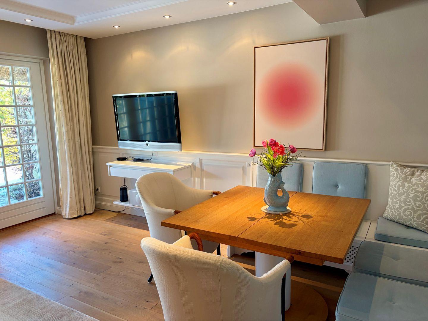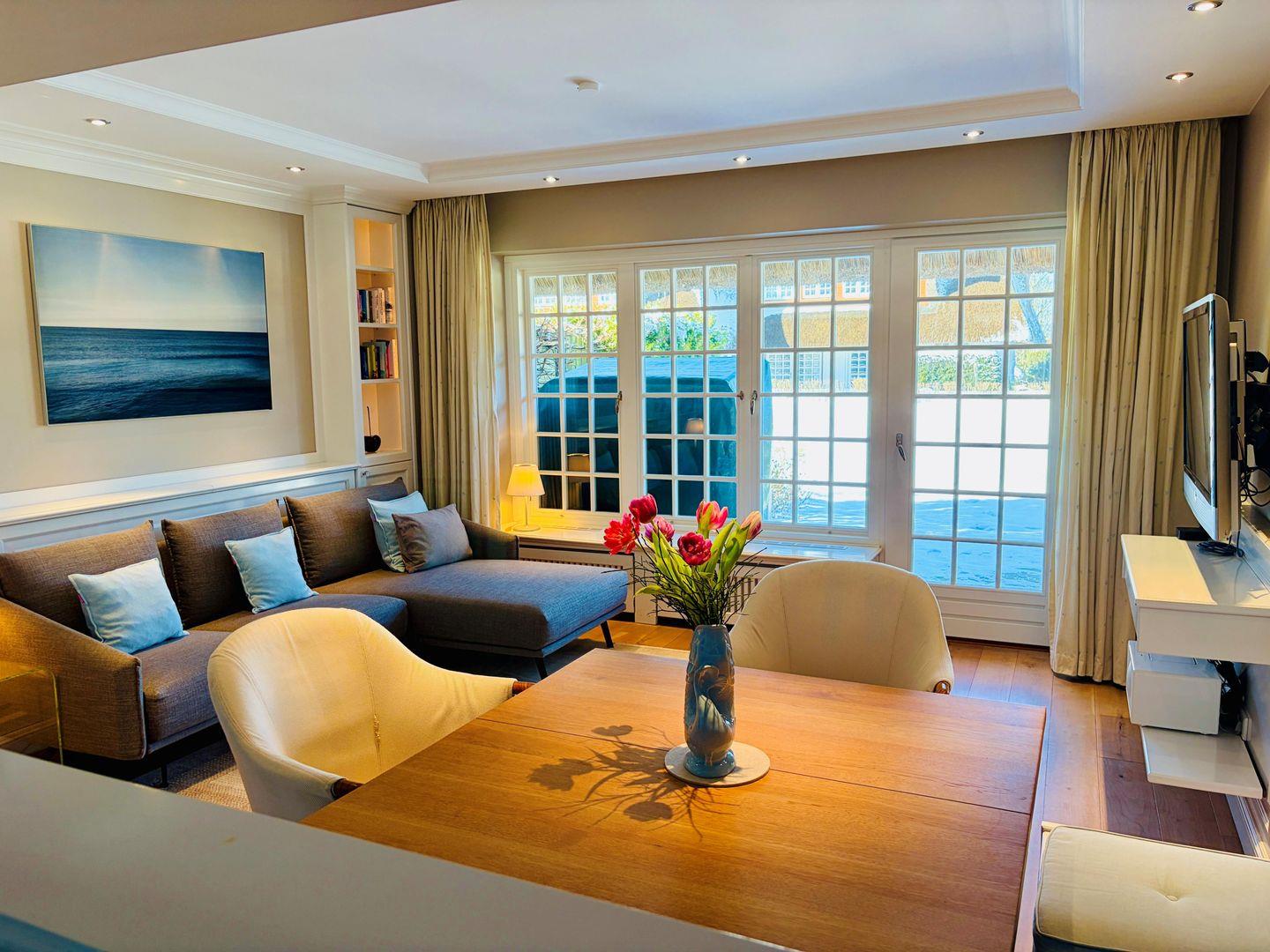 Die stilvolle Einrichtung in Sand-, Blau- und Koralltönen schafft eine ruhige, elegante Atmosphäre mit maritimem Flair. Der offene Wohn- und Essbereich mit moderner Küche lädt zum Entspannen und geselligen Beisammensein ein; eine Schiebetür ermöglicht bei Bedarf eine optische Trennung. Landschaftsfotografien von Sylt unterstreichen die Verbundenheit zur Insel und bringen nordischen Flair ins Haus.