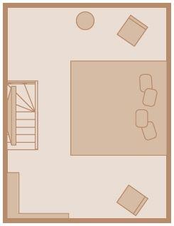 Obergeschoss: 1 Doppelzimmer mit TV; 1 Schlafzimmer mit getrennt stehenden Einzelbetten; 1 Badezimmer mit Duschbadewanne und WC.