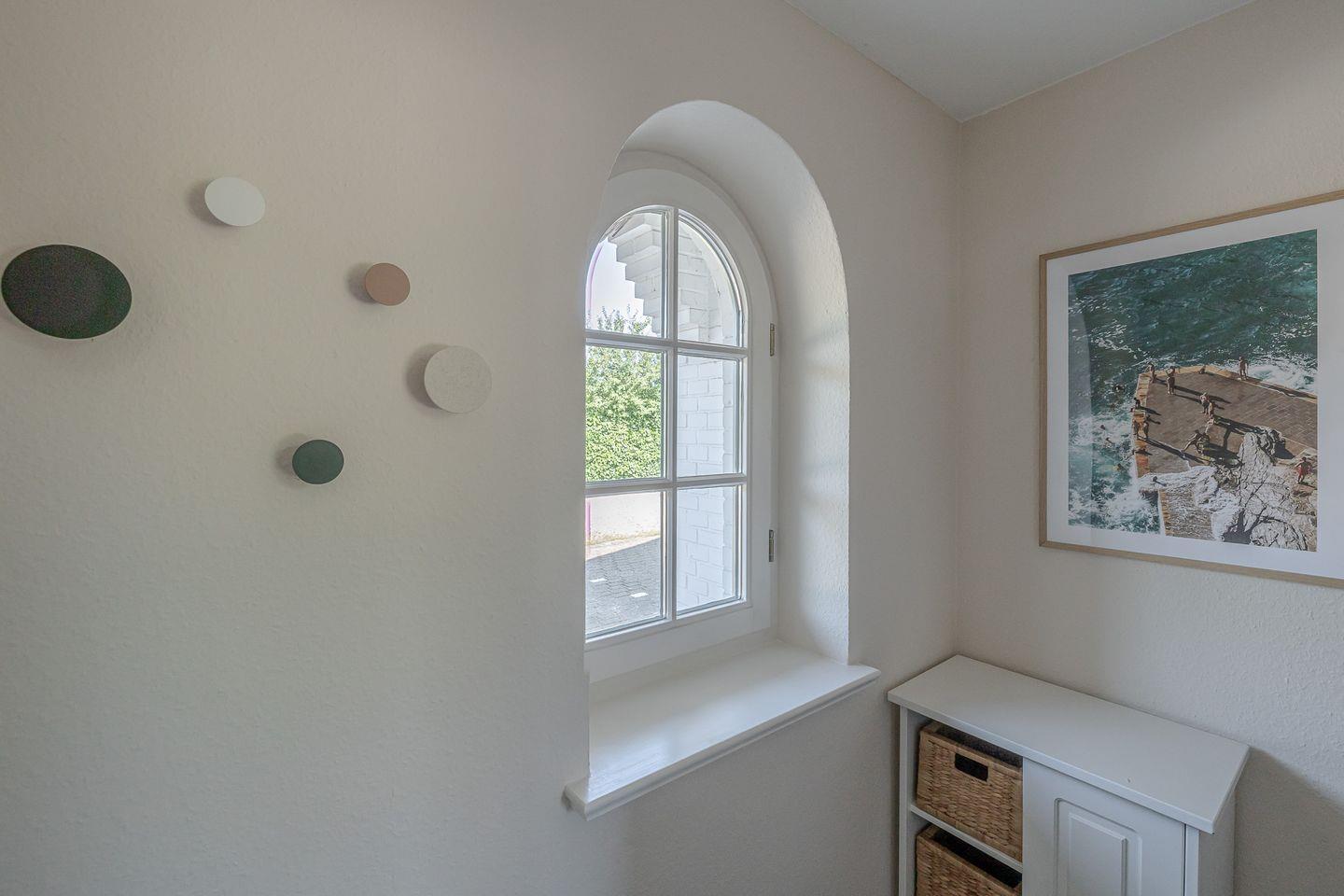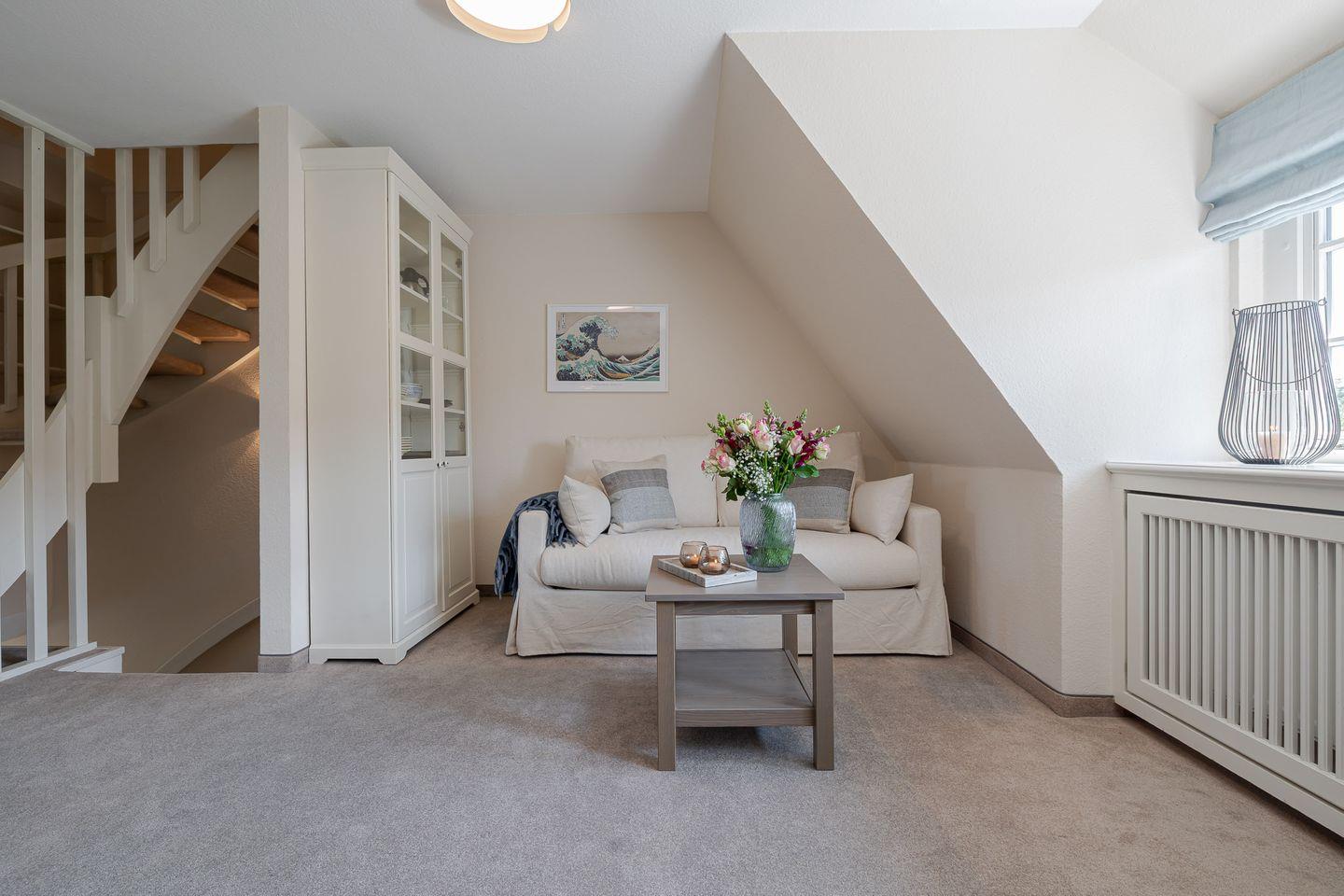 Über eine Treppe gelangen Sie ins behagliche Schlafzimmer im Dachgeschoss. Mit seinen schrägen Wänden, der niedrigen Decke und dem Dachfenster wirkt es fast wie eine kleine Kajüte – ein Platz zum Entspannen, Lesen und Ausschlafen.