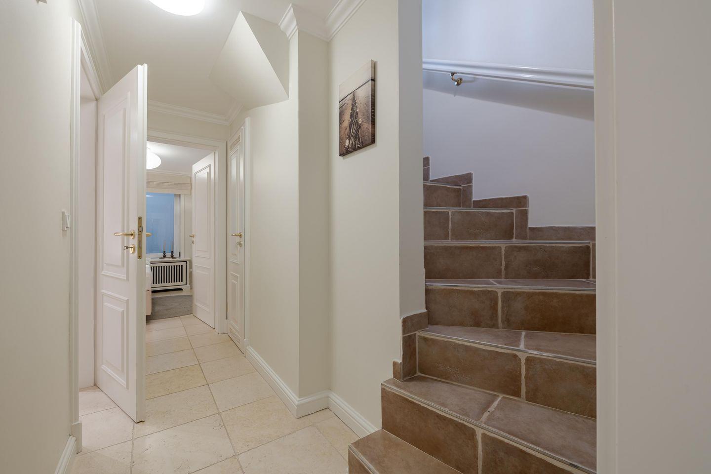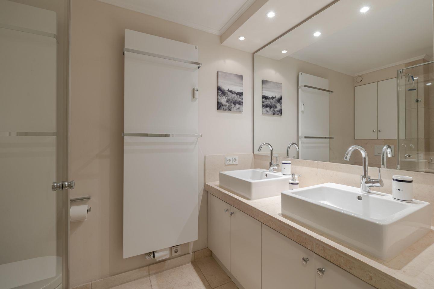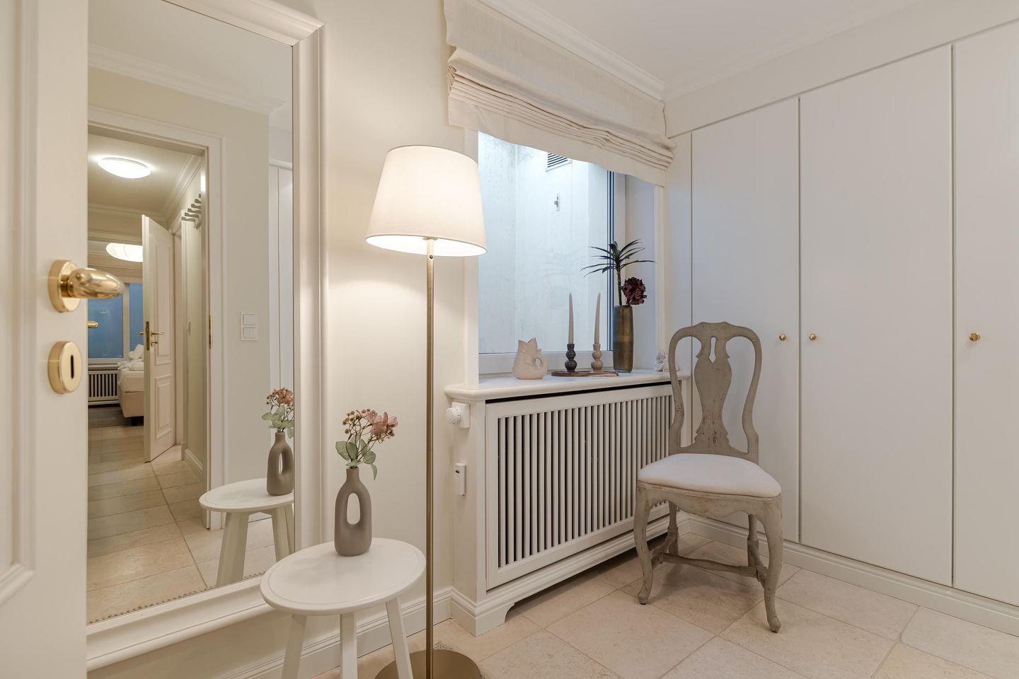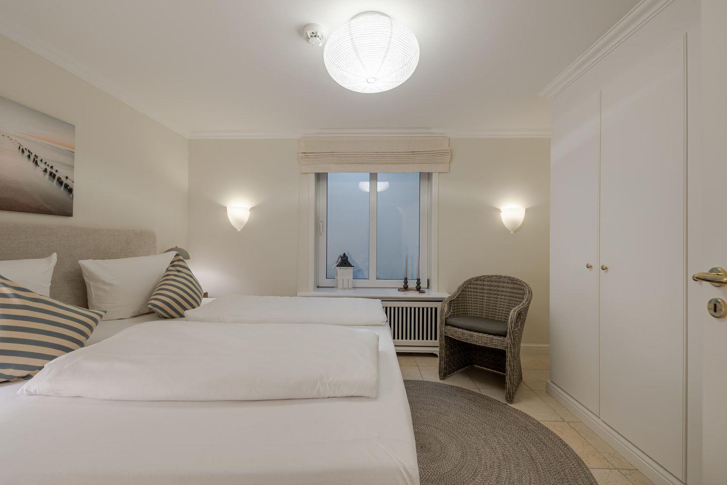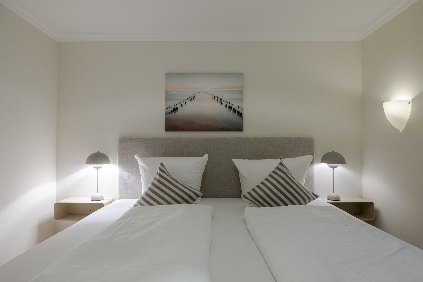 Eine Treppe tiefer liegt das Schlafzimmer mit seinem gemütlichen Boxspringbett. Gleich daneben präsentiert sich das Bad in dem cremefarbener Naturstein die Füße umschmeichelt und ein Doppelwaschtisch ausreichend Platz bietet. Den findet auch die Urlaubsgarderobe, denn es gibt ein großes Ankleidezimmer - wie gesagt, mit Lycka hat man eben Glück!