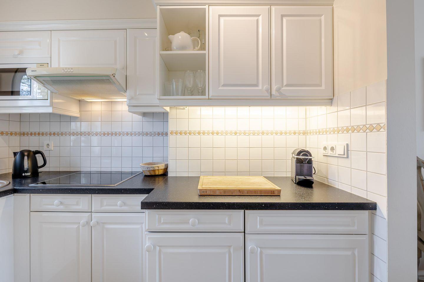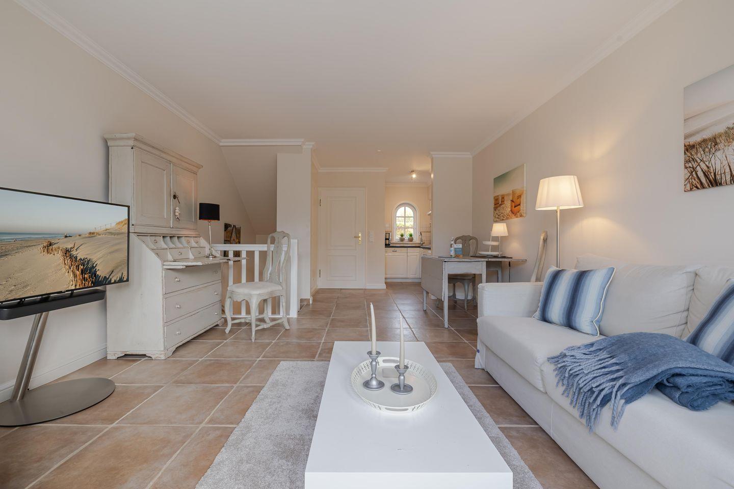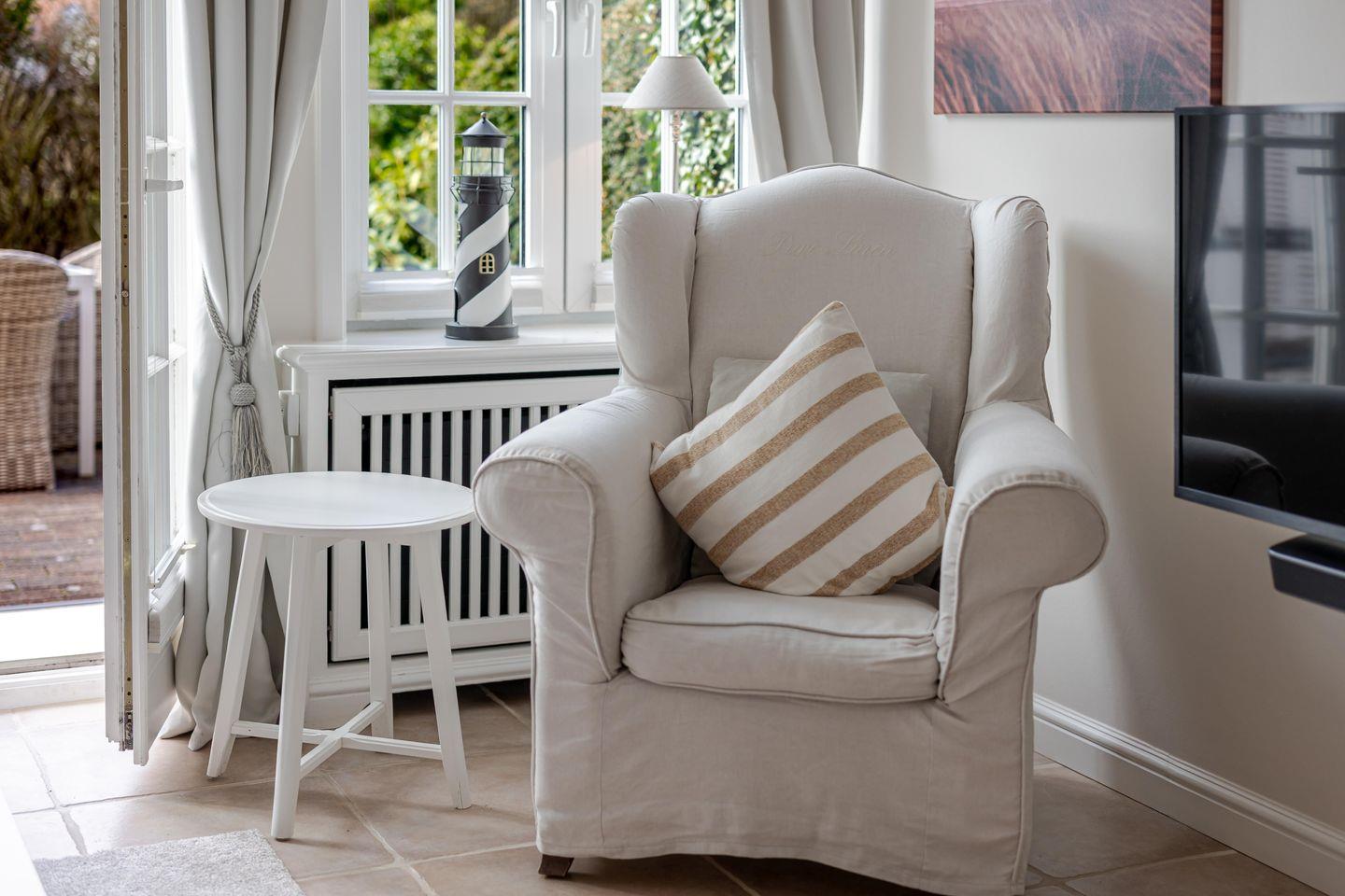 Im Erdgeschoss befinden sich der Wohn- und Essbereich sowie eine kleine aber voll ausgestattete Küchenzeile. Dazu gesellt sich die wunderhübsch begrünte Gartenterrasse inklusive Strandkorb.