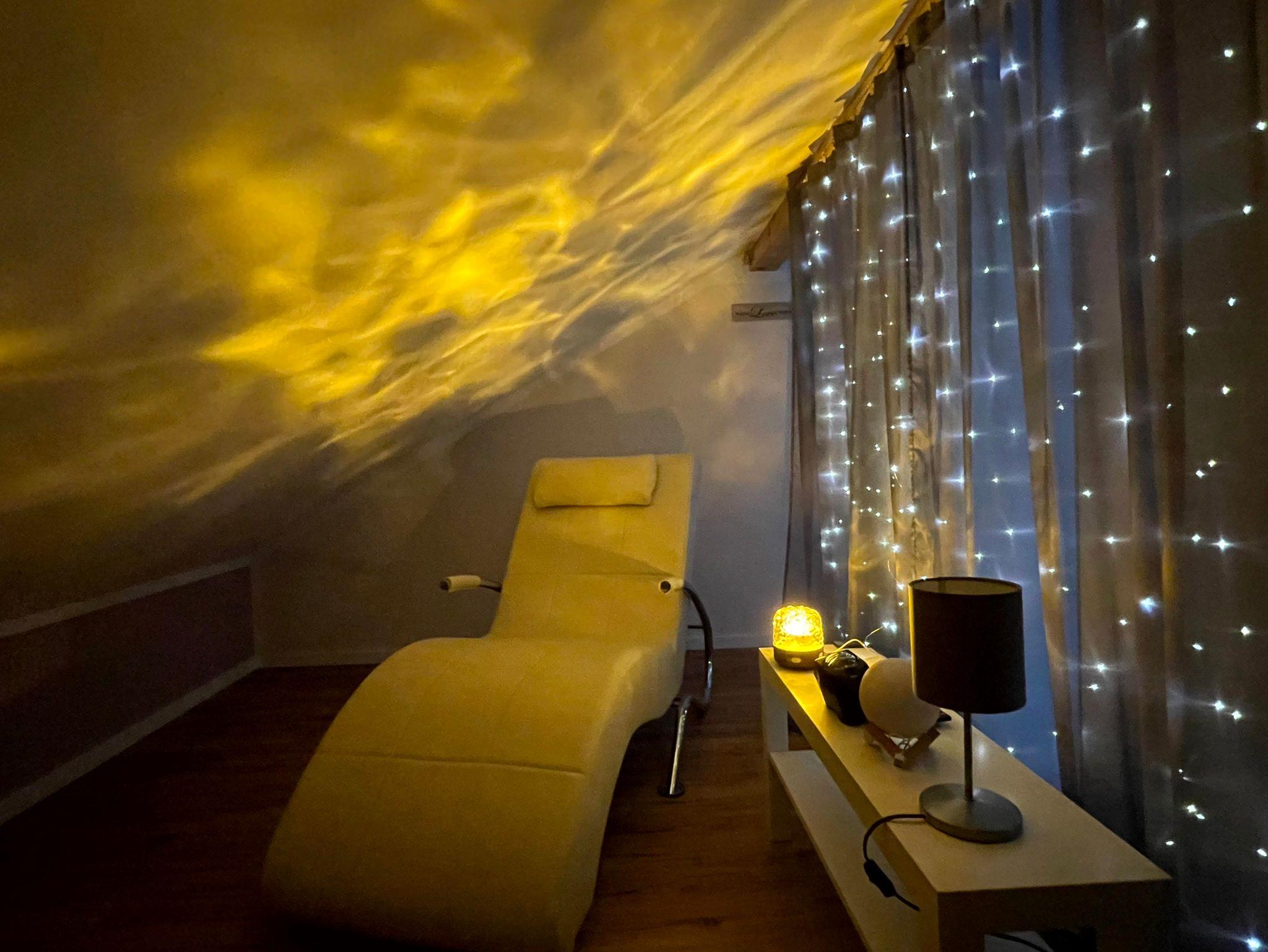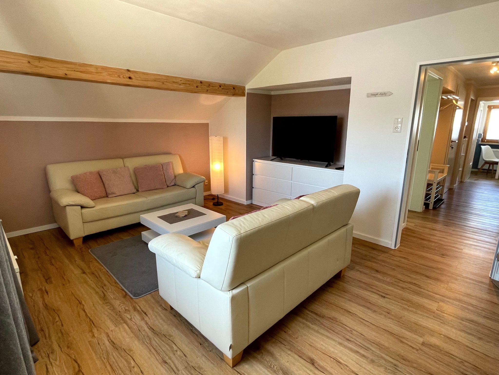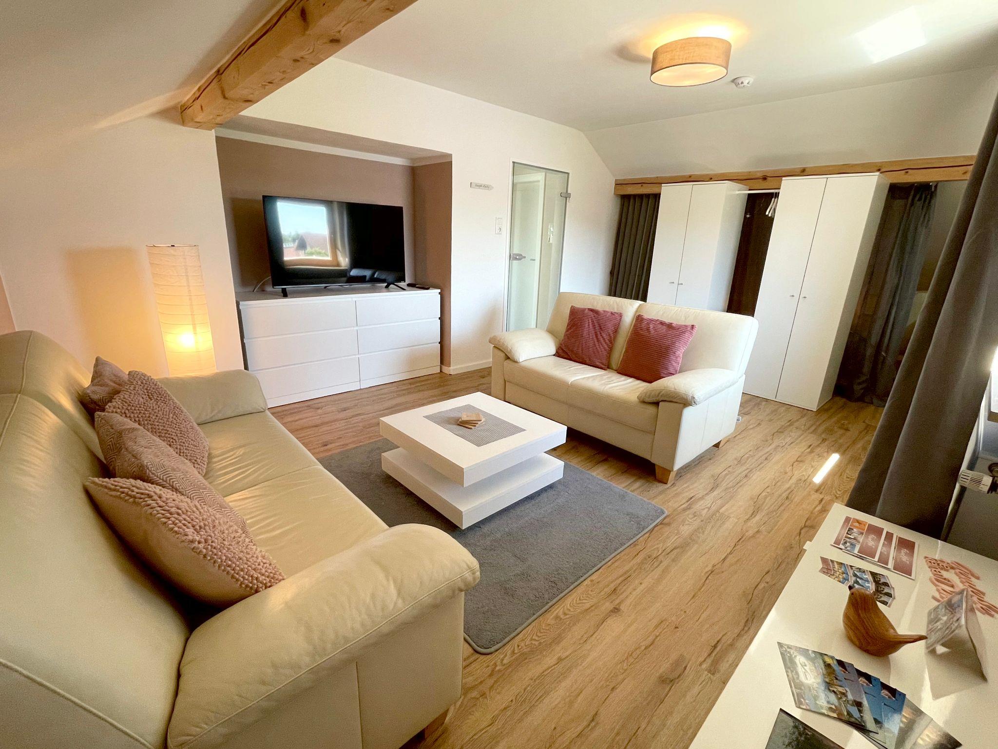 Wohnbereich: 2- und 3-Sitzer-Ledercouch, 50 Zoll-Fernseher, Snoezelen-Bereich mit Relaxliege, große Kommode und 2 Kleiderschränke