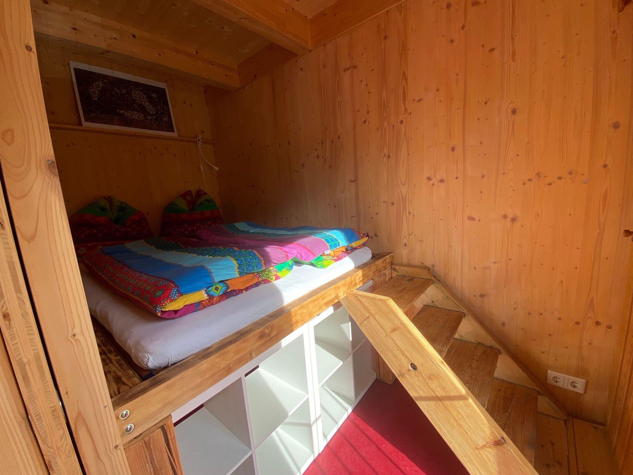 Im Erdgeschoss befinden sich der Koch-Essbereich und ein WC, im Obergeschoss der Wohnbereich, das Bad mit Dusche und ein kleines Schlafabteil mit Doppelbett. Im offenen Dachgeschoss stehen drei Einzelbetten mit Ablagemöglichkeiten.