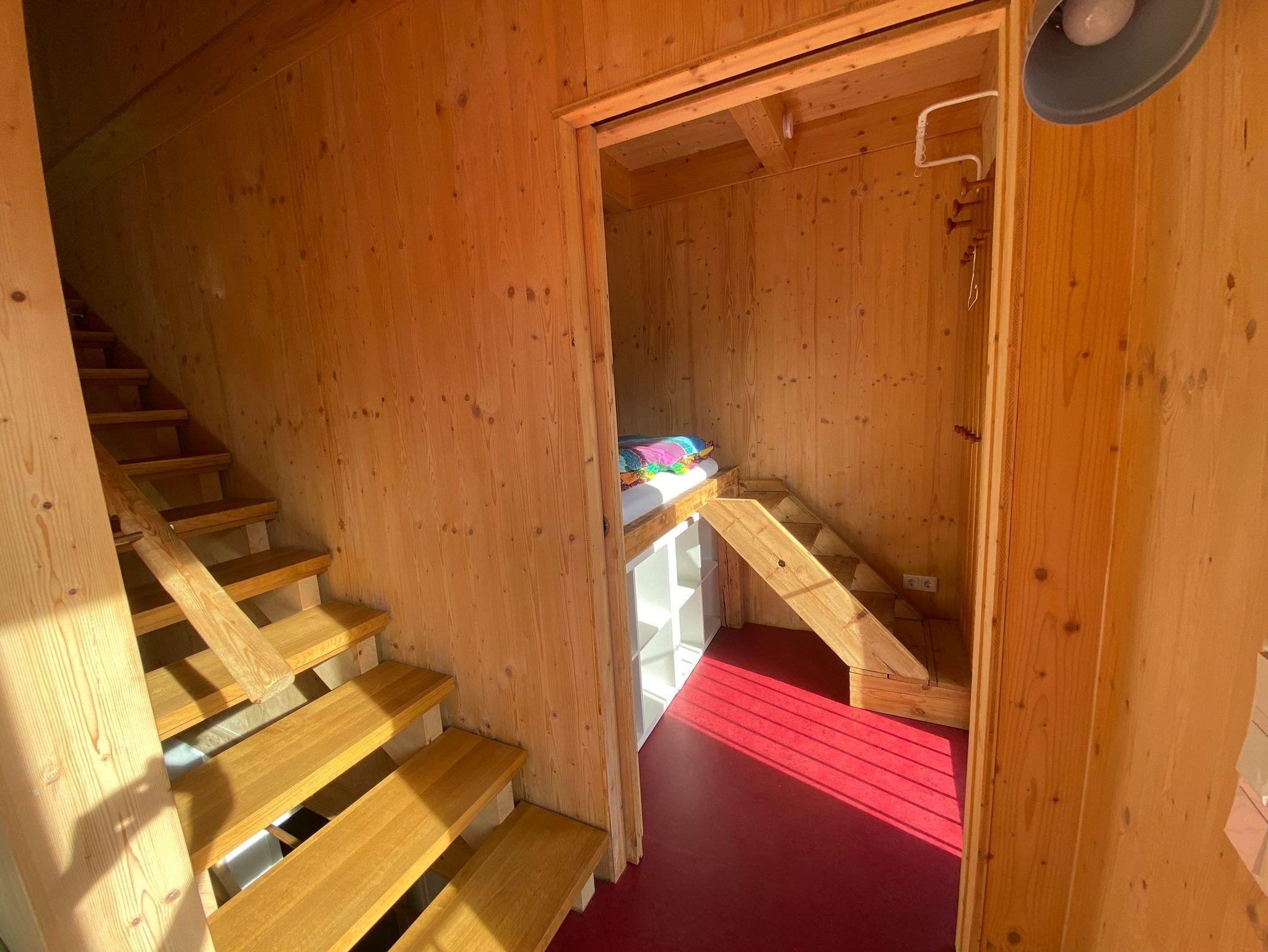 Bitte kleine Kinder wegen der Holztreppen und dem Hochbett innen und der teils unebenen, überwiegend naturbelassenen Außenanlagen verstärkt beaufsichtigen.