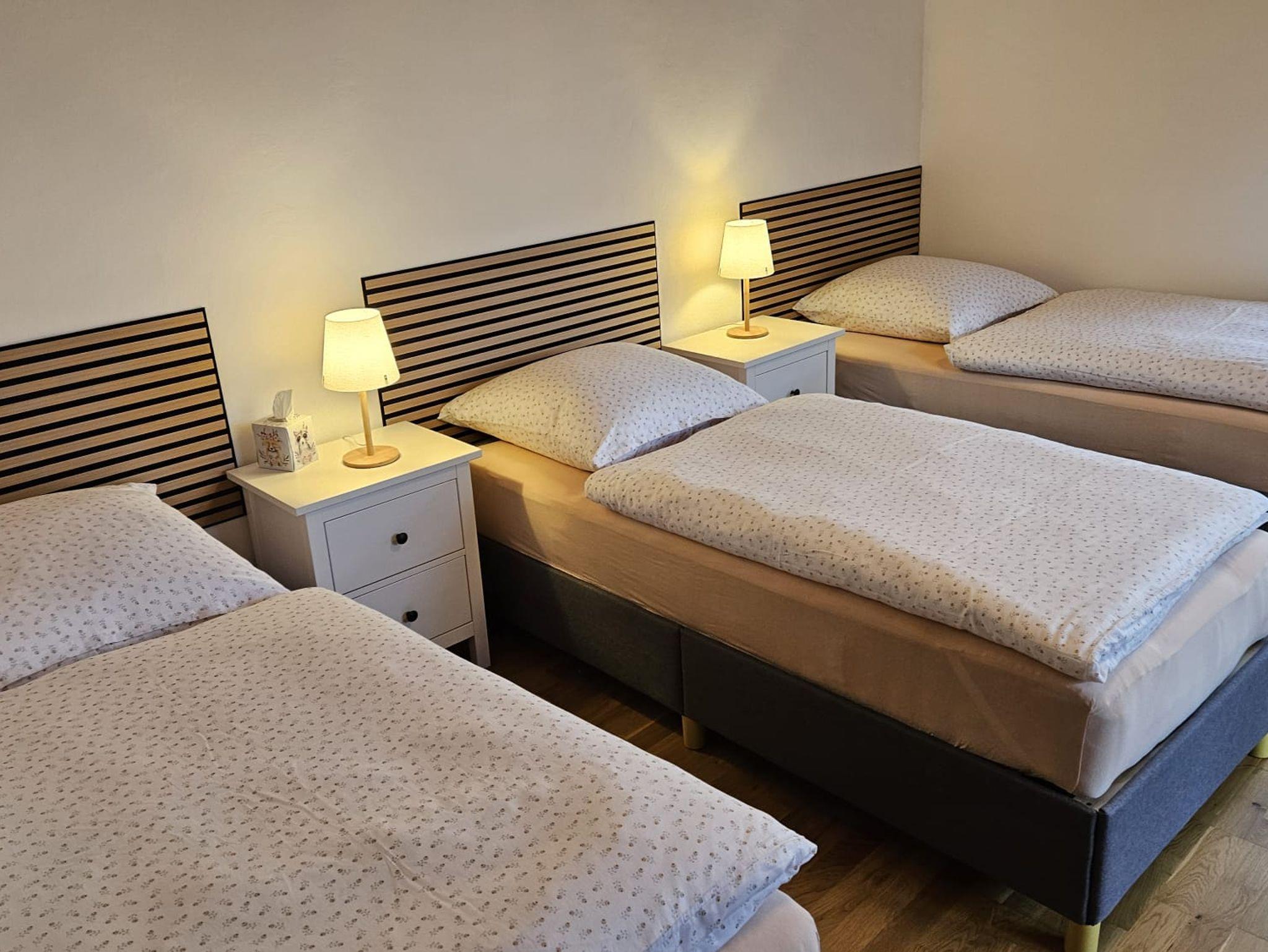 Unsere Ferienwohnung mit ca. 140 m² Wohnfläche bietet Platz für (1-7) Personen. Das gemütliche Wohnzimmer mit Schlafsofa und Flachbild-TV lädt zum Verweilen ein. Die komplett ausgestattete Küche mit Geschirrspüler, Kühlschrank inkl. Gefrierfach, Herd, Backofen, Mikrowelle, Wasserkocher, Toaster und Filterkaffeemaschine lässt keine Wünsche offen. Die Ferienwohnung verfügt über 3 Schlafzimmer (1 Zimmer mit einem Doppelbett, 1 Zimmer mit zwei Einzelbetten und 1 Zimmer mit drei Einzelbetten). Zwei Zimmer haben einen gemeinsamen Zugang zum Balkon. Das geräumige Badezimmer mit Dusche, Badewanne und WC rundet das Gesamtbild ab. Insgesamt sin 3 WC´s vorhanden. Zum Reinigen Ihrer Kleidung stehen eine Waschmaschine und ein Trockner im Haus zur Verfügung. Vor allem im Sommer können Sie entspannte Abende in unserem Garten verbringen. Das WLAN und den Parkplatz vor dem Haus können Sie kostenfrei nutzen.