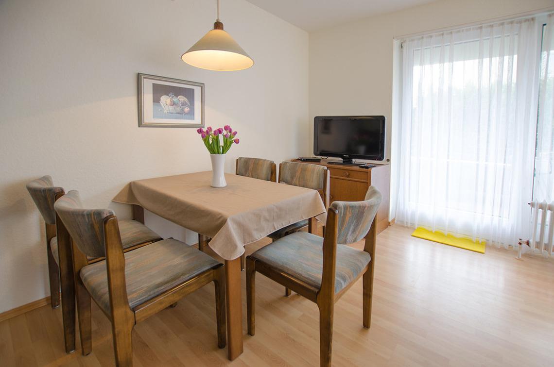 Das Wohnzimmer ist mit Sofa, Couchtisch, 2 Sesseln, Kommode mit TV, Esstisch mit 4 Stühlen und einer integrierten Küche mit Arbeitstresen eingerichtet.