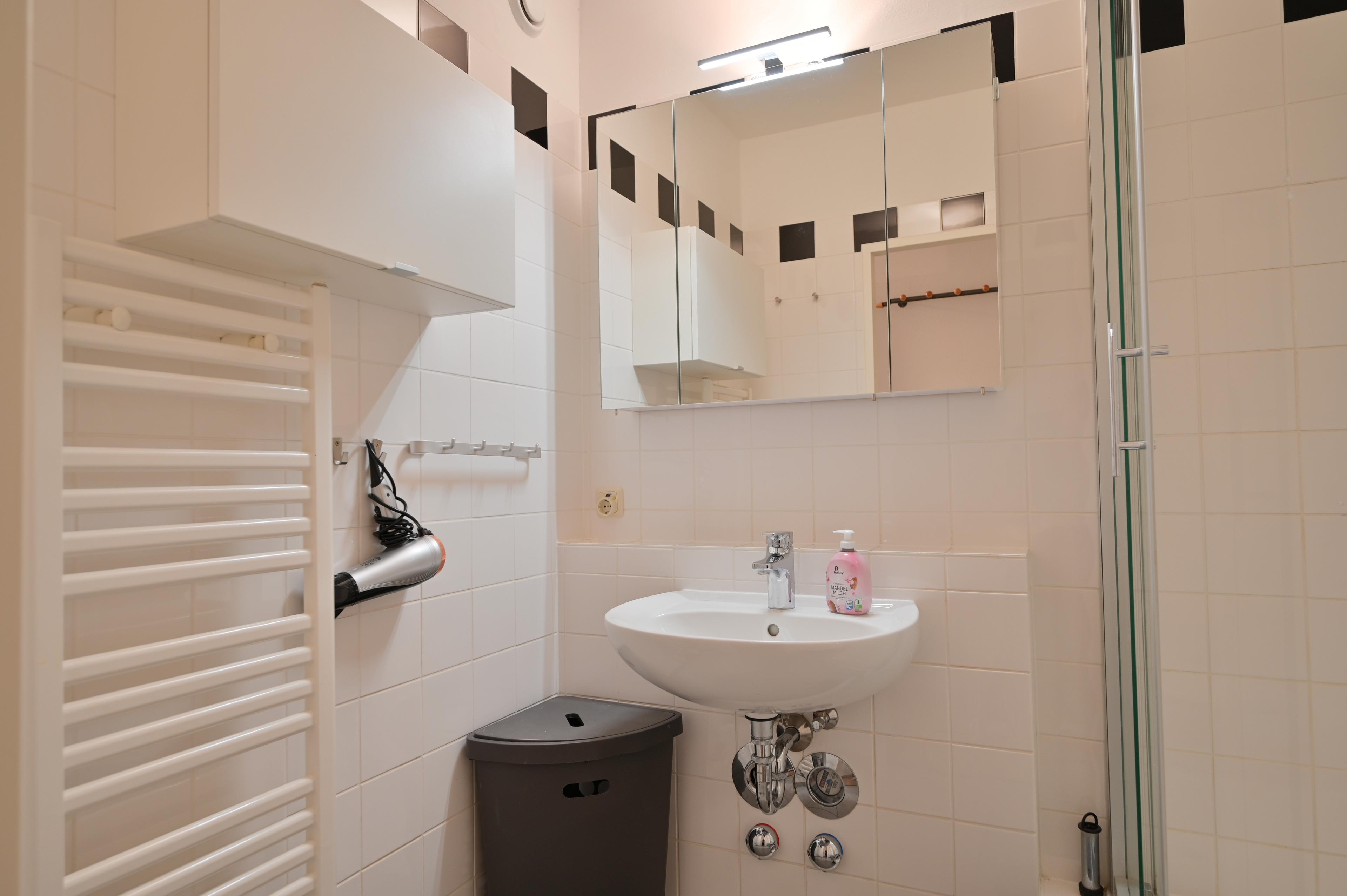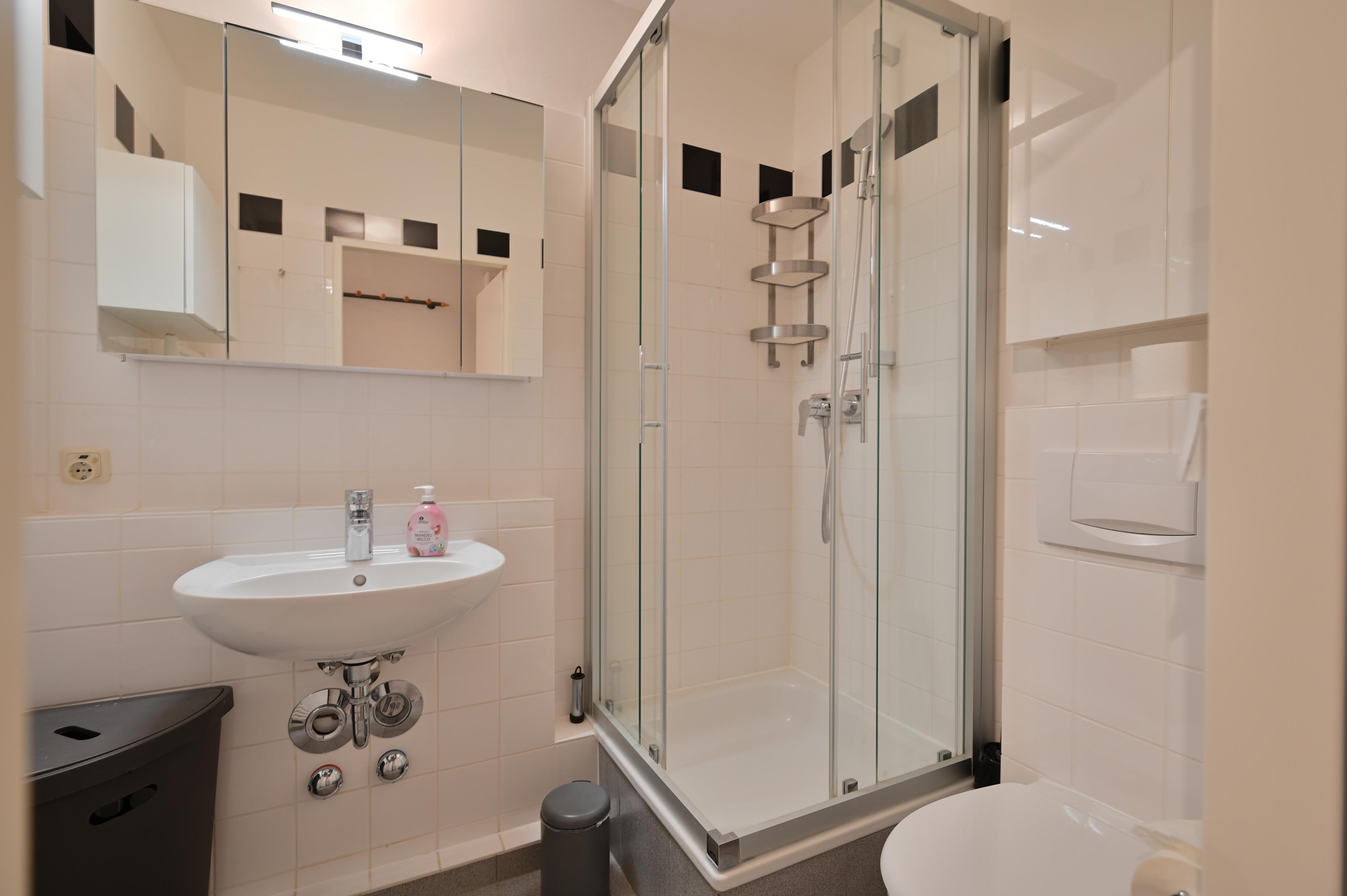 Das Badezimmer verfügt über eine moderne Dusche.