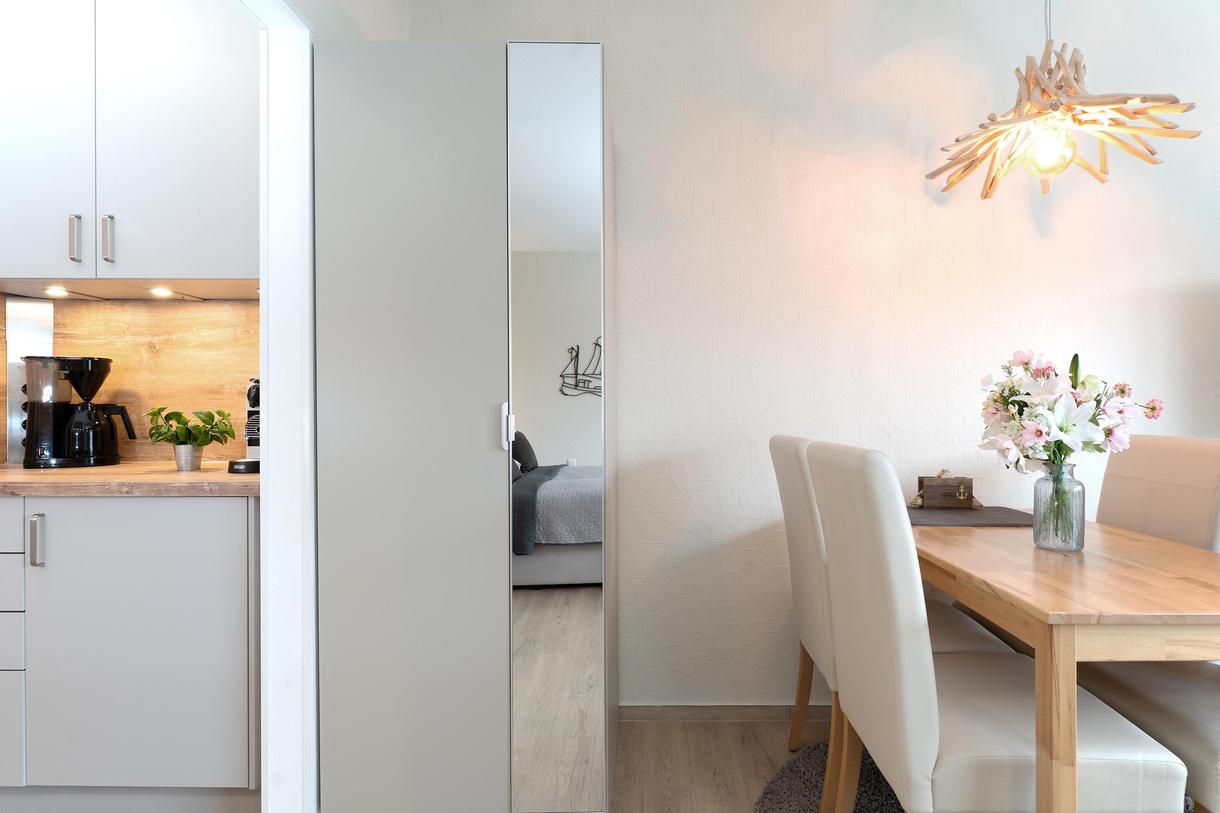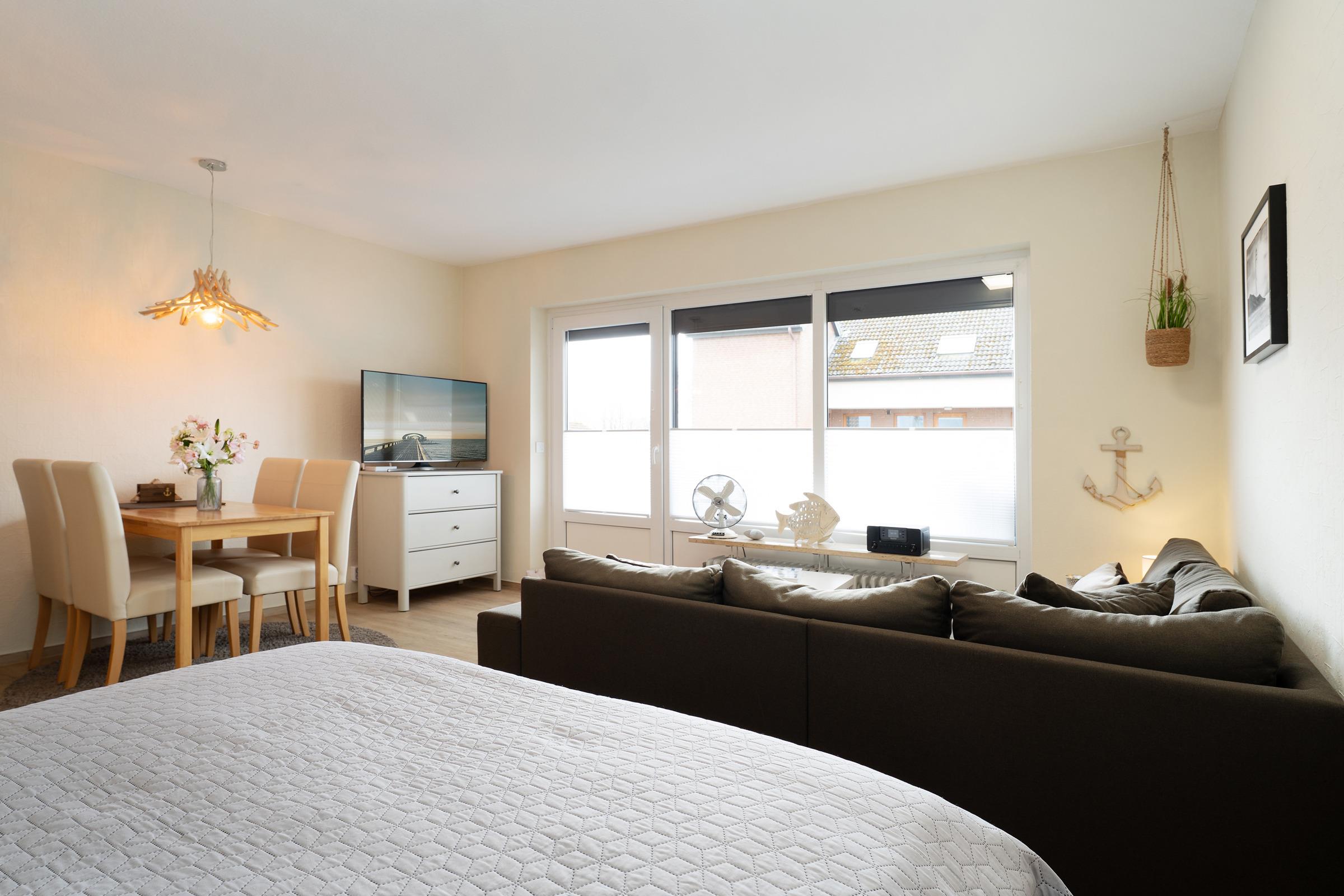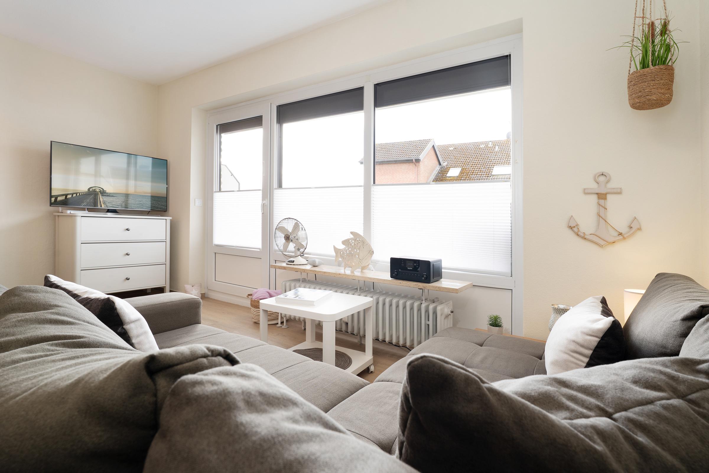 Urlaub total – hinterm Deich in der 2. Reihe. Die kleine, sehr feine Wohnung befindet sich im Haus Deichhof und ist rund 100 Meter vom Strand entfernt. Der Wohnbereich empfängt Sie mit einer wunderbar großzügigen, kuscheligen Sofa-Ecke. Machen Sie es sich hier gemütlich – Ihr Urlaub kann beginnen. Direkt neben dem Sofa geht es raus auf den möblierten Süd-Balkon. Hier können Sie tagsüber das schöne Wetter genießen – oder auch den Abend bei einem Glas Wein ausklingen lassen. Zurück im Wohnbereich: Hier finden Sie auch eine schicke Ess-Ecke für 4 Personen. Die kleine moderne Küche ist zum Wohnzimmer hin offen – und doch in einer separaten Nische. Die Ausstattung kann sich sehen lassen. Eine Espressomaschine, ein Backofen mit integrierter Mikrowelle und weitere Annehmlichkeiten warten auf Sie. Für die Nacht sorgt ein gemütliches Boxspringbett (160 x 200 cm) – und die süßen Träume von der herrlichen Ostsee können beginnen. Das hell gefliestes Badezimmer verfügt über eine bodentiefe Dusche sowie einen Handtuchwärmer und garantiert einen guten Start in den Tag.