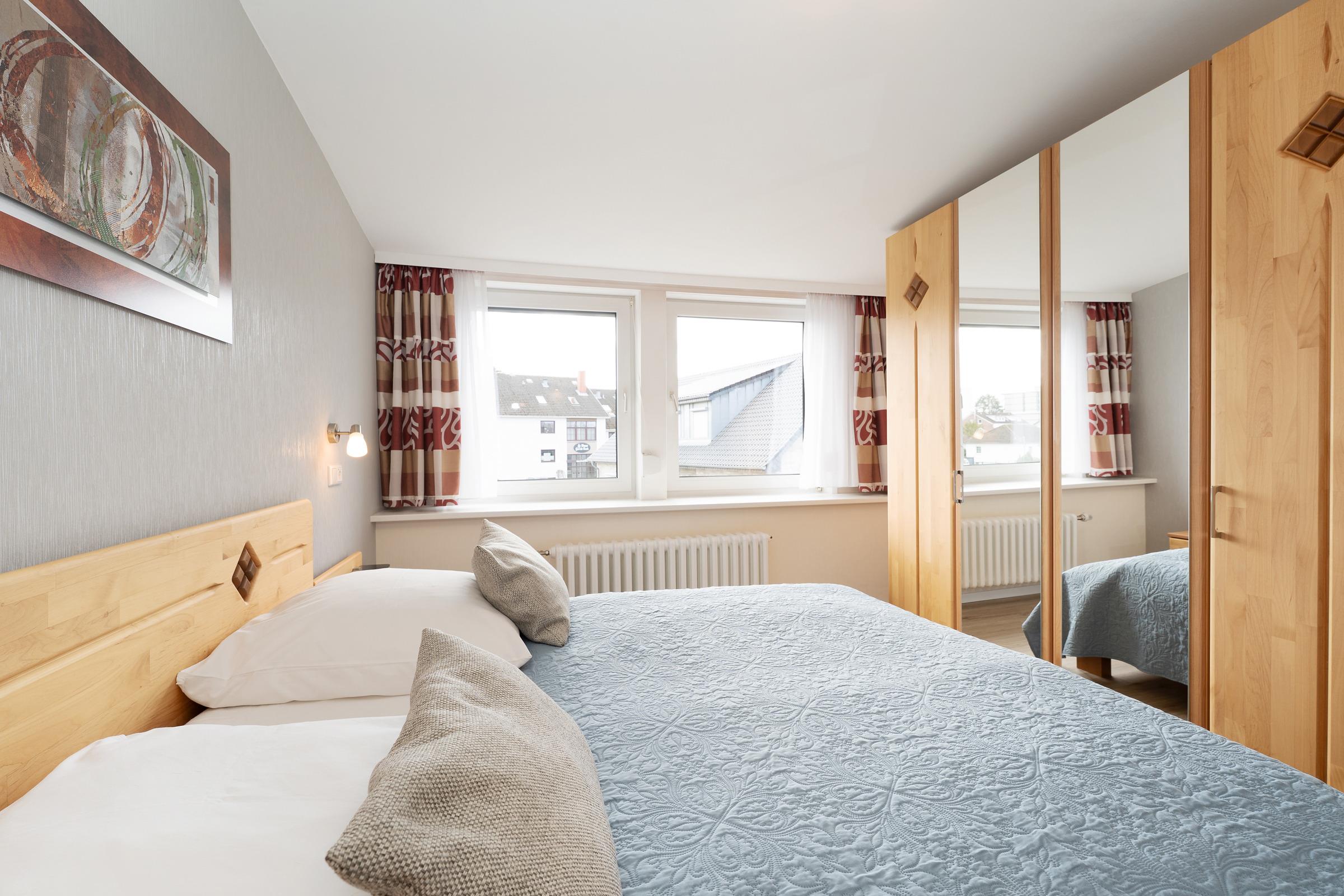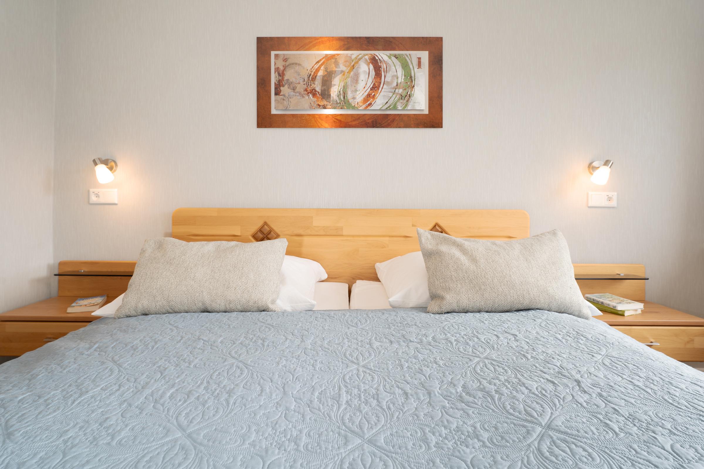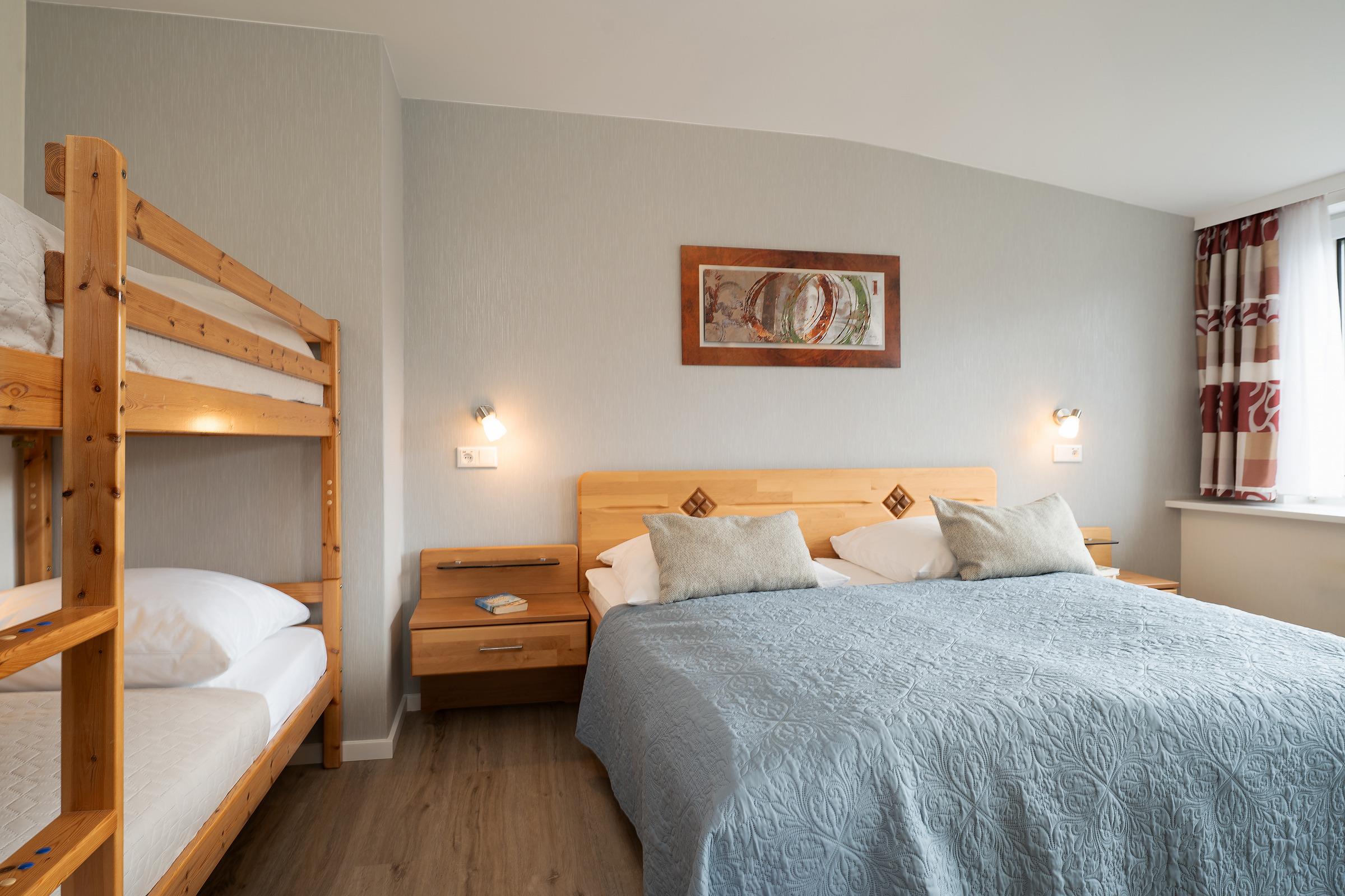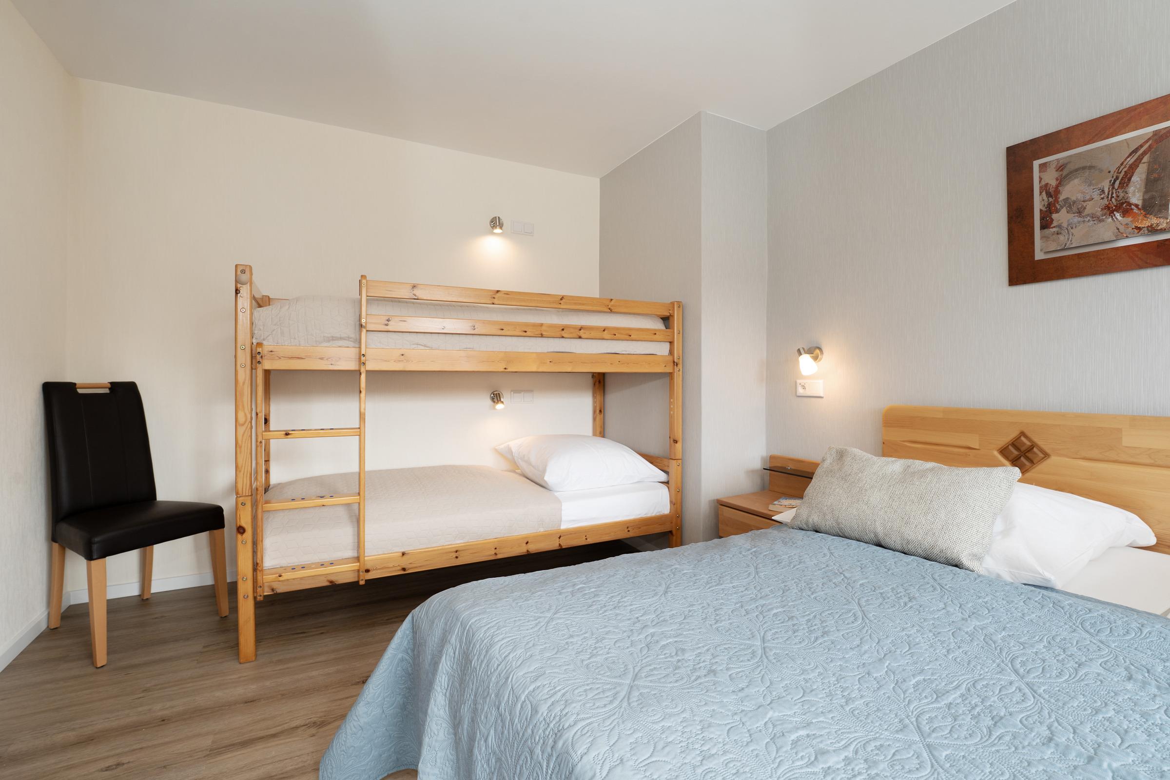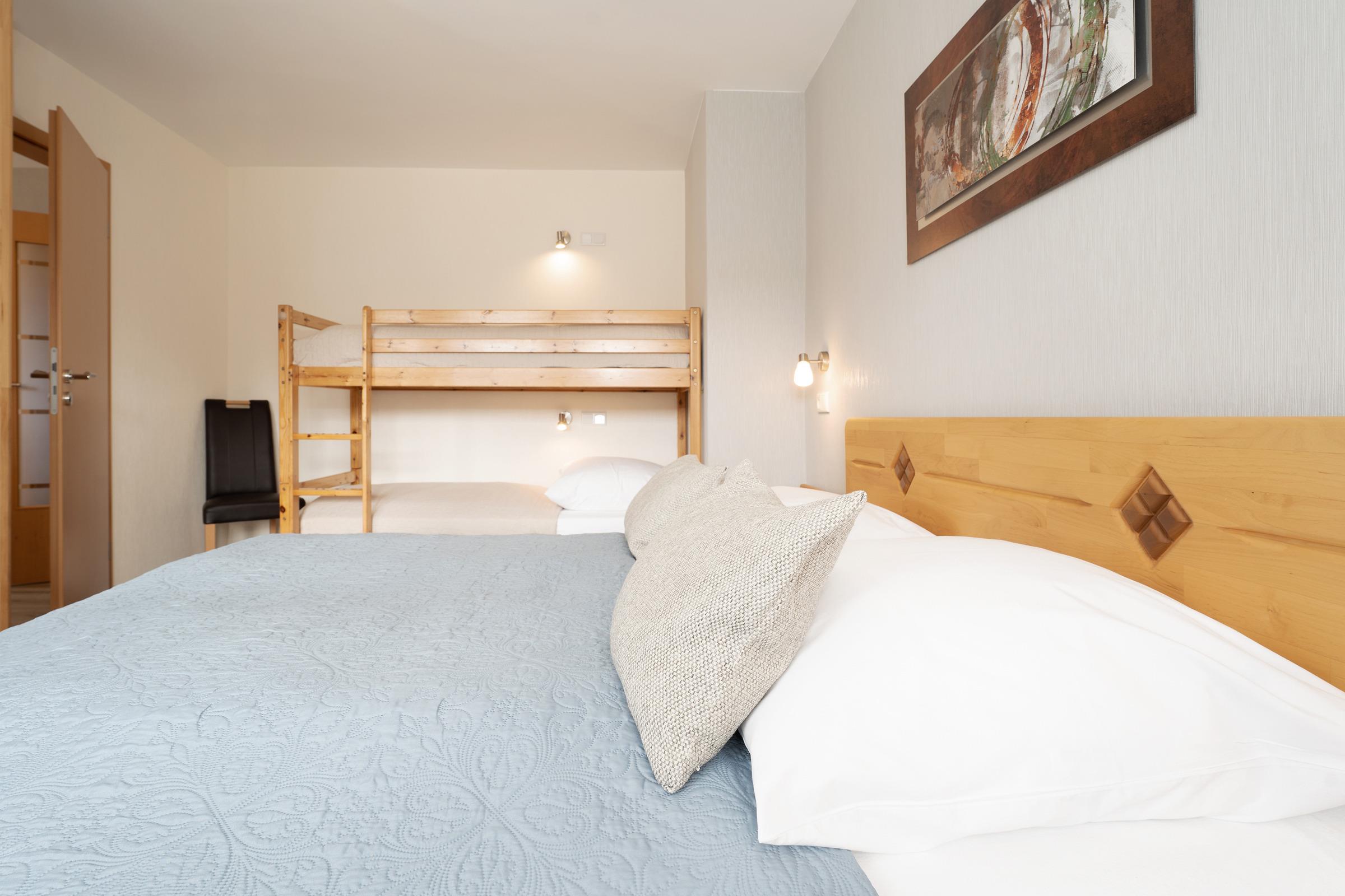 Schlafzimmer: 1 Doppelbett (2x 90x190 cm), 1 Etagenbett (2x 80x190 cm), Kleiderschrank, Verdunkelung (Rollläden), Platz für Babybett