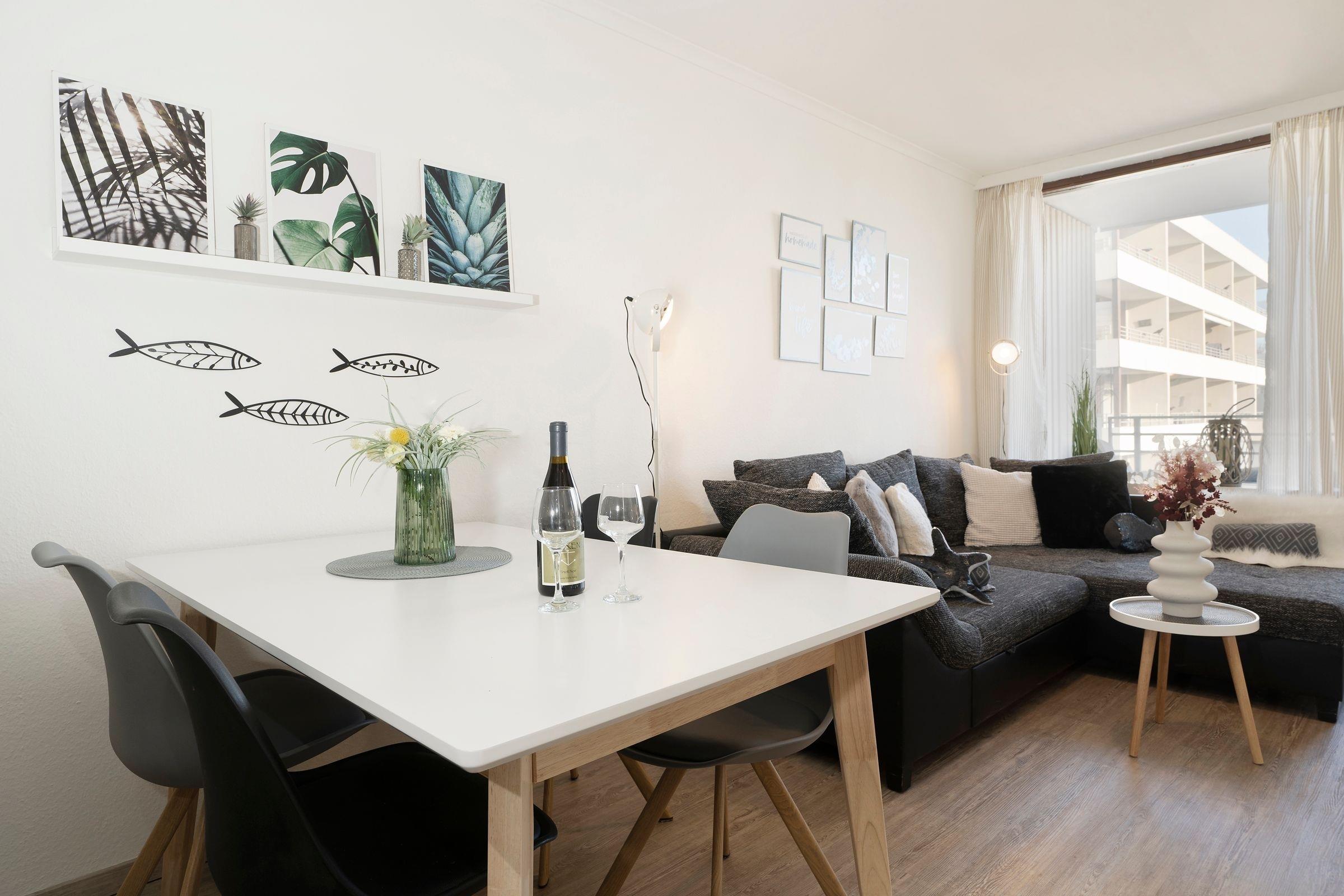 Charmantes Feriendomizil in bester Lage von Kellenhusen: Die 2-Zimmer-Ferienwohnung StrandGeflüster mit Balkon und seitlichem Meerblick bietet auf ca. 42 m² Wohnfläche Platz für bis zu 4 Personen.