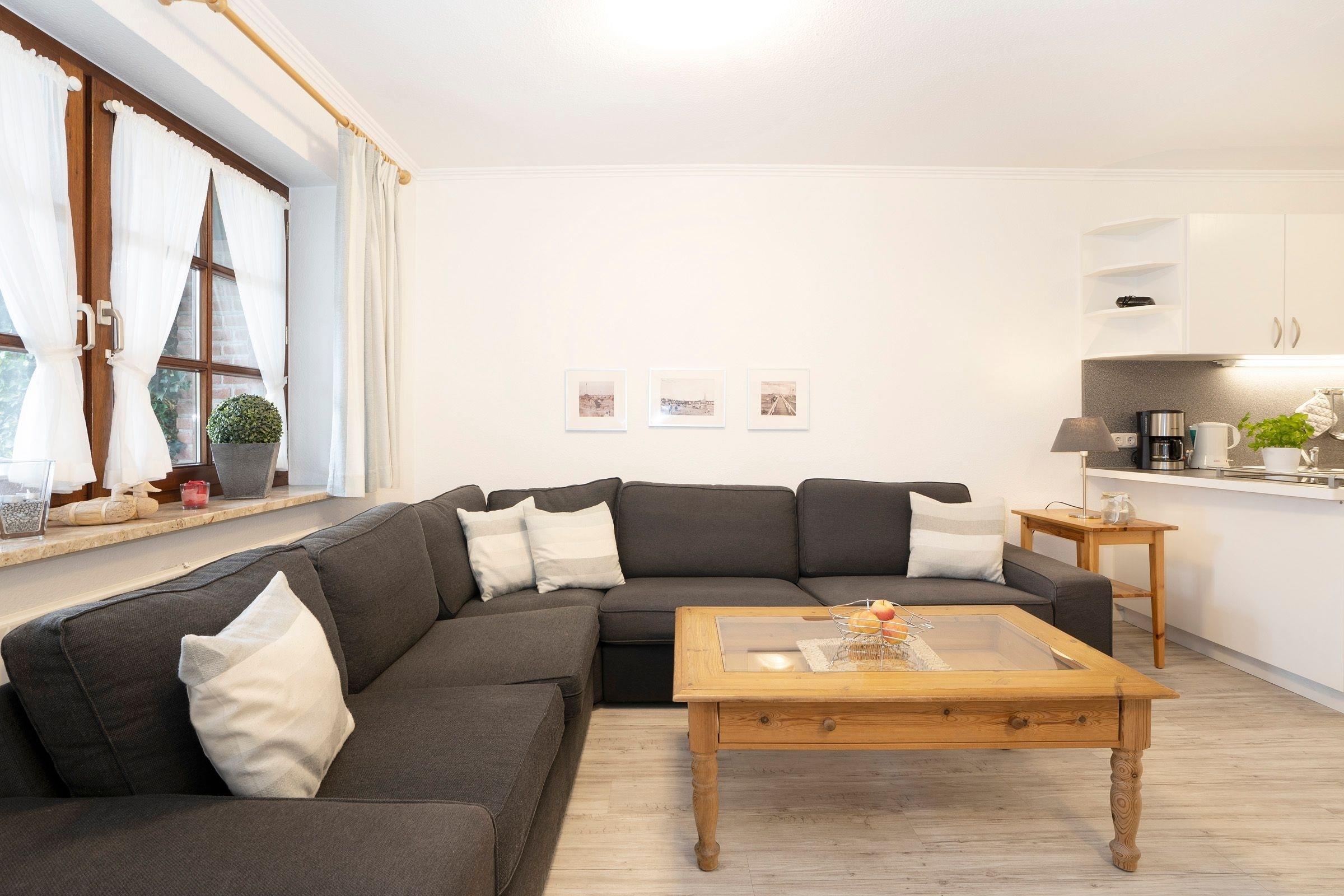 Kommen Sie herein – Ihr Urlaub kann beginnen. Auf der großen, kuscheligen Sofalandschaft findet jeder seinen Lieblingsplatz, um gemütlich vor dem TV-Gerät zu entspannen. Auch die Essecke bietet viel Platz und lädt zu lustigen Spiele-Abenden ein. Vom Wohnbereich aus haben Sie direkten Zutritt auf die möblierte Südterrasse. Hier können Sie wunderbar auf Ihre wohlverdiente Auszeit anstoßen und das gute Wetter genießen. Die moderne Küche verfügt über eine Spülmaschine und ist in den Wohnraum integriert. Sie bietet sämtliche Annehmlichkeiten, die man zur Eigenversorgung im Urlaub braucht. Eine erholsame Nacht versprechen die beiden Schlafzimmer: In dem einen Raum steht ein Doppelbett (180x200 cm), in dem anderen 2 einzelne Betten (90x200 cm und 90x170 cm). In beiden Zimmern befindet sich zudem jeweils ein Kleiderschrank für Ihre Urlaubsgarderobe. Das gepflegte Duschbad ist hell gefliest.