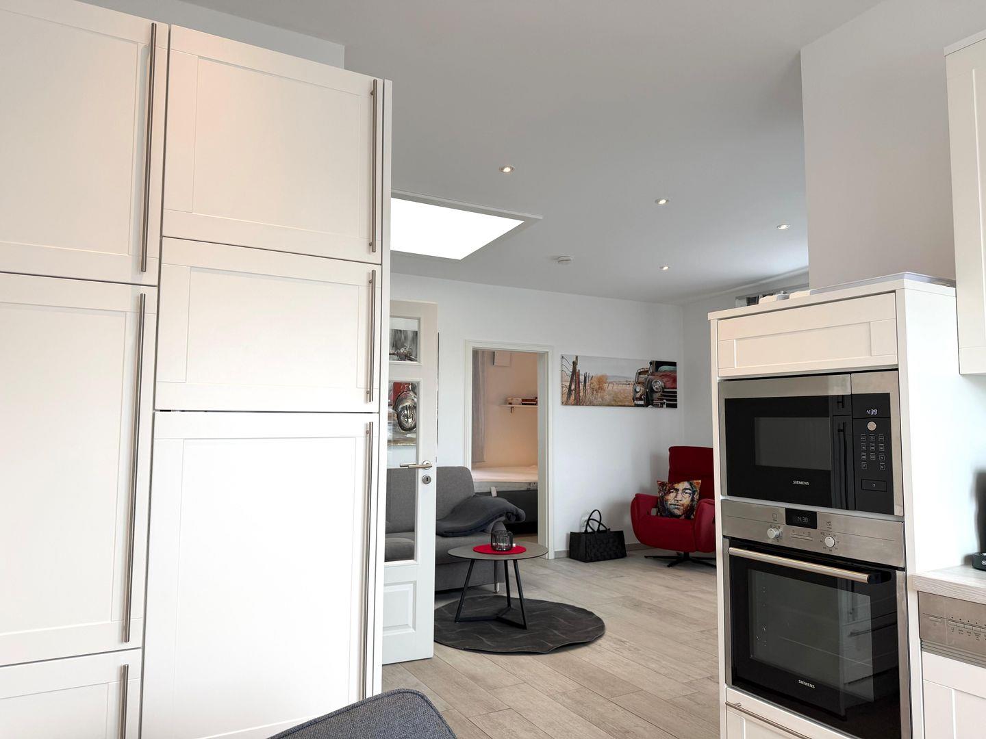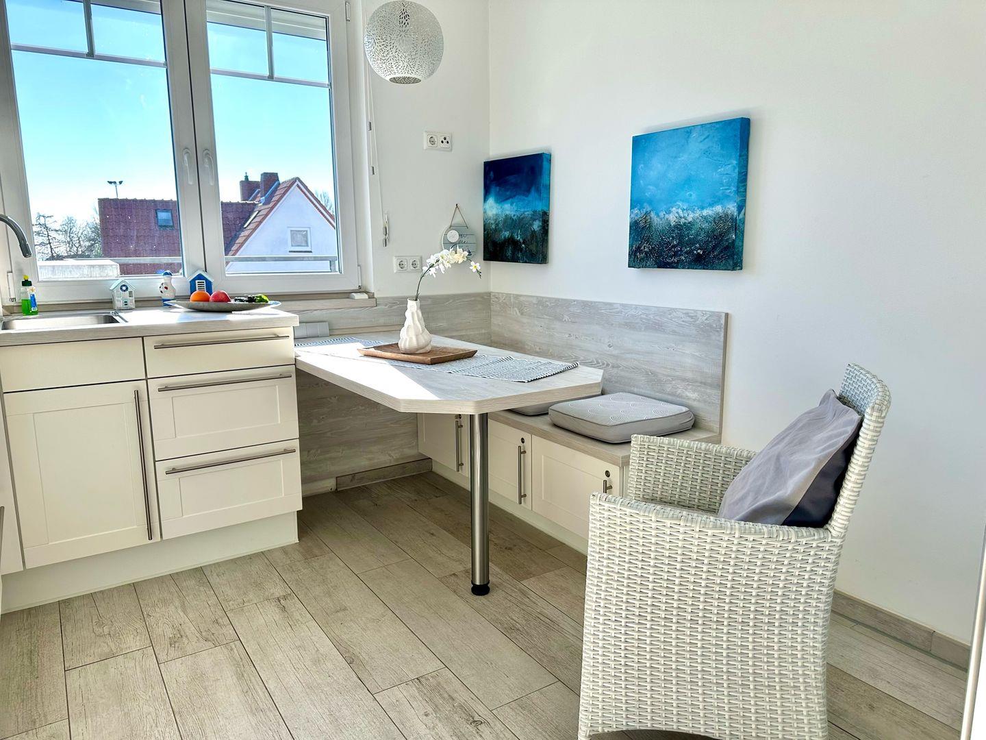 In der voll ausgestatteten Küche können Sie gemütlichen Mahlzeiten zubereiten und die frischen, regionalen Produkte genießen, die Sie in den nahegelegenen Einkaufsmöglichkeiten erwerben können. Der Blick Richtung Meer kann vom Essplatz aus genossen werden Eine Spülmaschine, ein Backofen, das Cerankochfeld und zahlreiche kleine Küchengeräte wie Toaster und Wasserkocher machen das Kochen zum Vergnügen. Nach einem langen Tag am Strand können Sie auf Ihrer großzügigen Terrasse mit Möbeln und Strandkorb entspannen, während Sie den herrlichen Blick auf das Meer genießen.