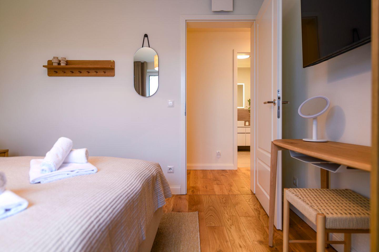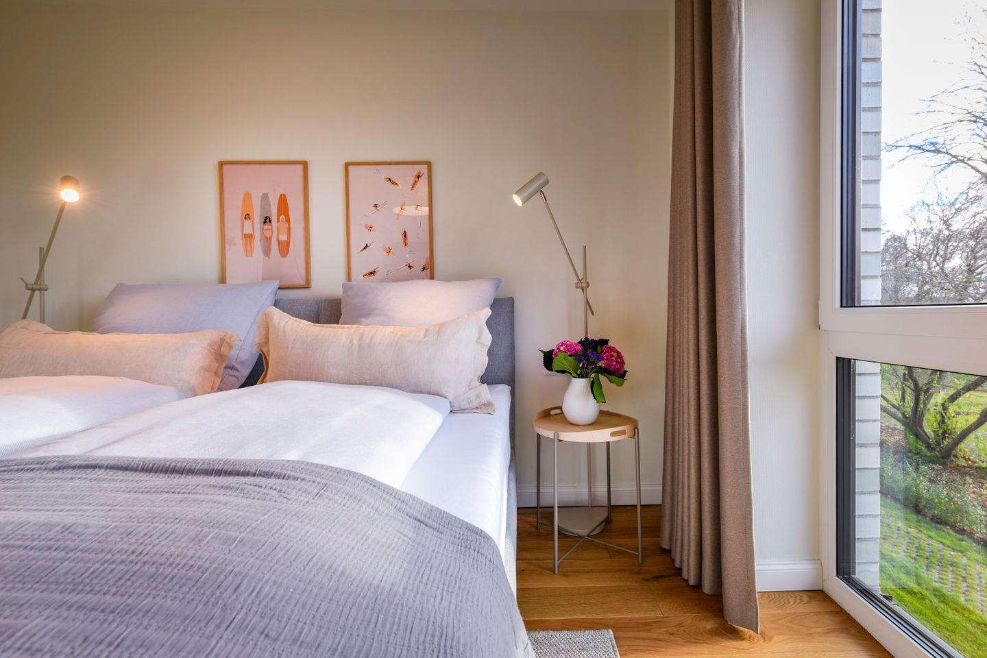 Zwei geschmackvoll eingerichtete Schlafzimmer mit komfortablen Doppelbetten, Smart-TV und Verdunkelungsmöglichkeiten bieten dir Raum für erholsame Nächte. Das ruhige Farbkonzept und die hochwertigen Materialien sorgen für Harmonie und Behaglichkeit. Im Wohnbereich steht zusätzlich ein Schlafsofa (1,80 × 2,00 m) für zwei weitere Gäste bereit.