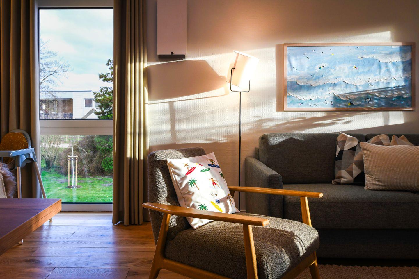 Dein privater Spa-Moment beginnt direkt in der Wohnung: Das großzügige Bad begeistert mit einer ebenerdigen Regendusche und einer großen, vollverglasten Sauna. Hier kannst du nach einem Strandtag oder einer Fahrradtour die Wärme genießen, abschalten und neue Energie tanken.