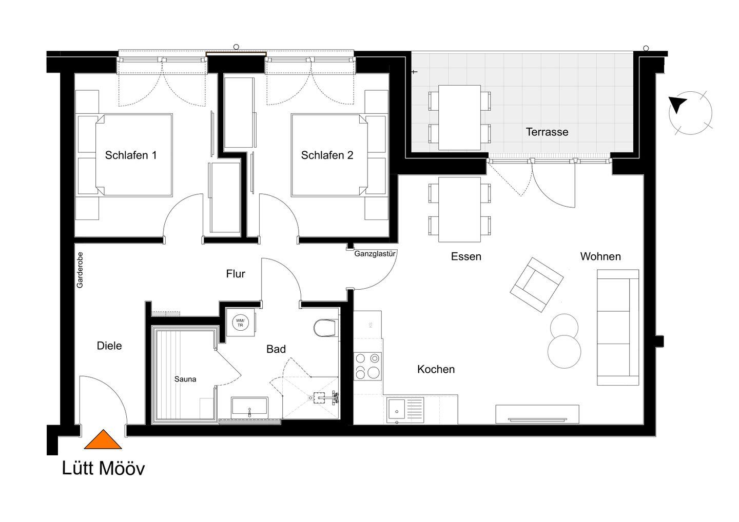 Nur 100?m vom feinsandigen Strand entfernt liegt die stilvolle Ferienwohnung Lütt Mööv. Mit zwei Schlafzimmern, privater Sauna und überdachter Terrasse bietet sie dir perfekten Komfort – ideal für deinen Urlaub zu zweit, mit Familie oder Freunden – das ganze Jahr über.