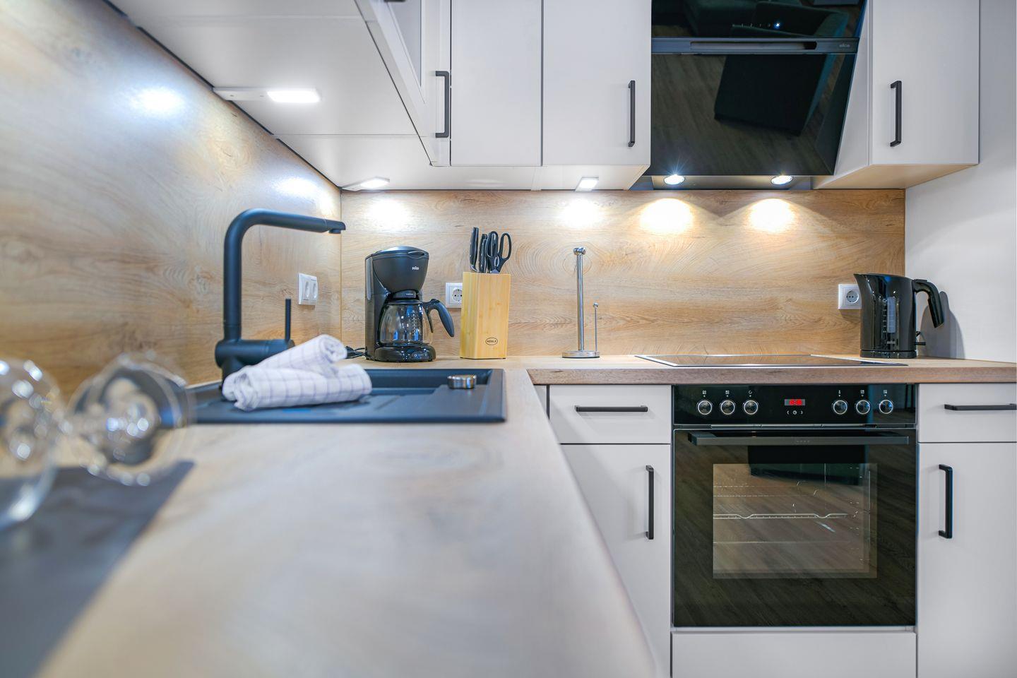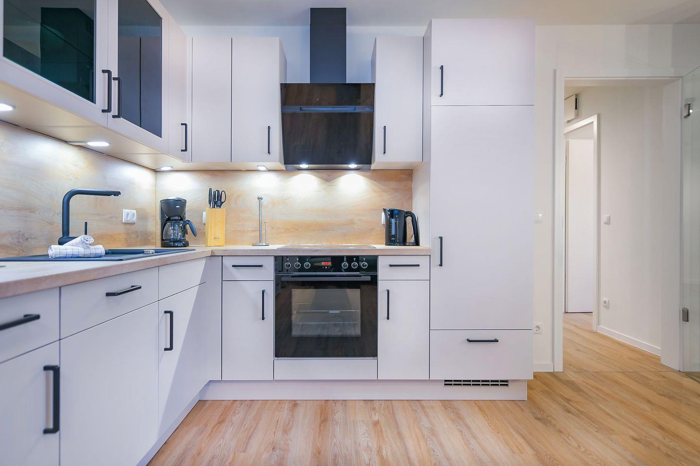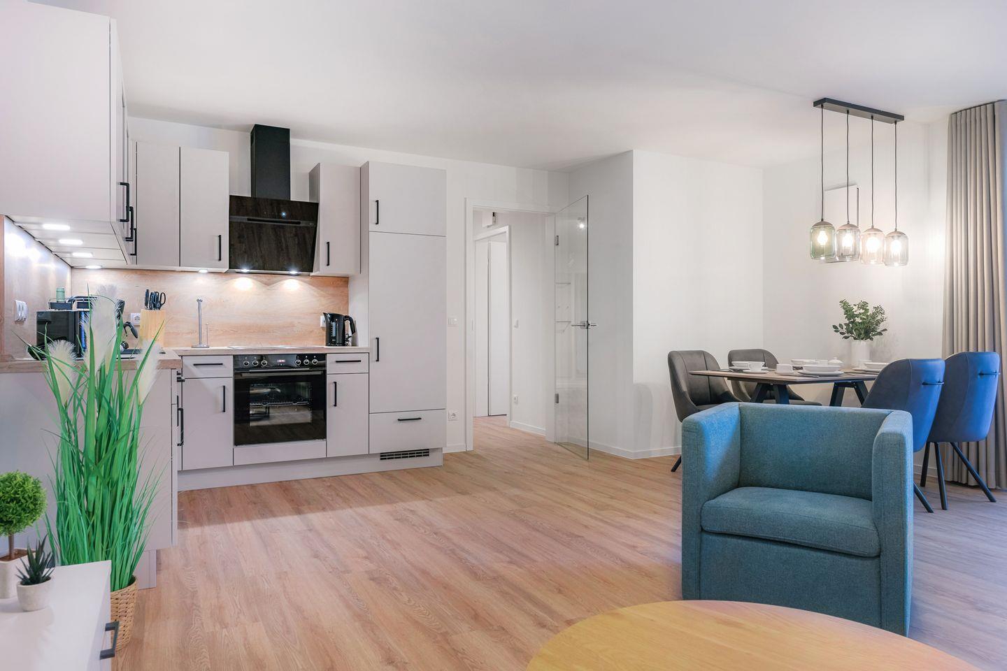 Der großzügige Wohnbereich lädt zum Ankommen und Entspannen ein. Die Sofalandschaft mit Sessel bietet dir viel Komfort für ruhige Abende, ein Buch oder einen Film auf dem Smart-TV. Bodentiefe Fenster sorgen tagsüber für Licht, Vorhänge am Abend für Privatsphäre. Die offene, modern ausgestattete Küche mit Essbereich ist harmonisch integriert – ideal für gemeinsame Mahlzeiten und entspannte Stunden am Tisch.
