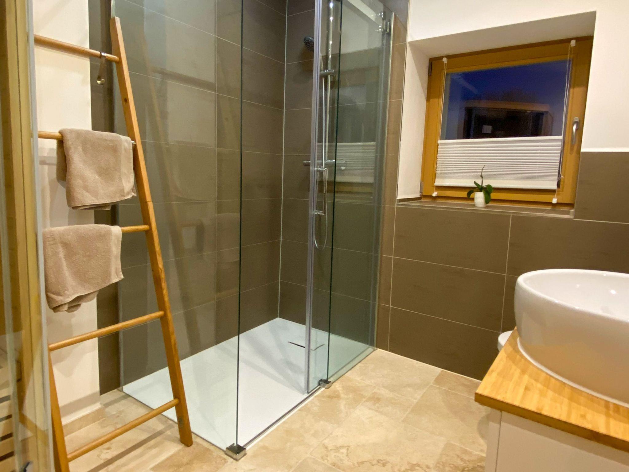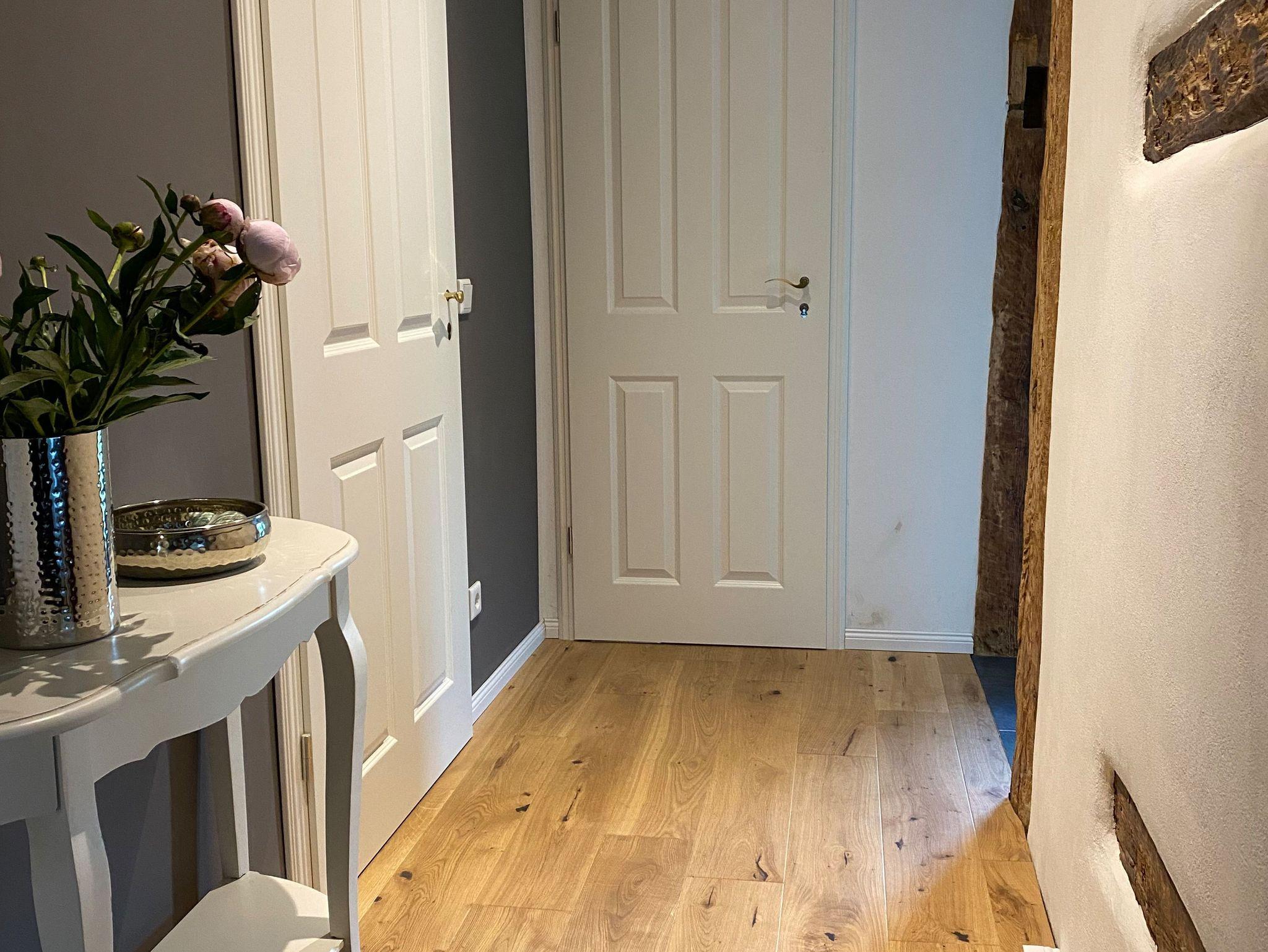Sie erreichen Ihre 50 m² Ferienwohnung über im EG über den herrlichen Eingang des Gutshauses. Ihre Ferienwohnung bietet Ihnen einen wunderschönen offenen Wohn- und Küchenbereich mit einer neu eingerichteten Küche inkl. Spülmaschine und Backofen für bis zu 4 Personen. Ein komfortables Sofa, das auch noch als Schlafsofa (140x200) umfunktioniert werden kann, lädt zu gemütlichen Abenden ein. Über zwei Stufen erreichen Sie einen kleinen Flur, von wo aus das Badezimmer mit Dusche und WC und eine Sauna sowie das romantische Schlafzimmer mit Doppelbett (160x200) erreichbar ist. Auch hier erwarten Sie altes Fachwerk mit lehmverputzten Wänden und moderne Einrichtungselemente. Im Badezimmer steht Ihnen eine ebenerdige Dusche zur Verfügung sowie Tageslicht. Die Sauna lädt zur Entspannung ein. Genießen sie die schönen Stunden am Kaminfeuer des Kaminofens.