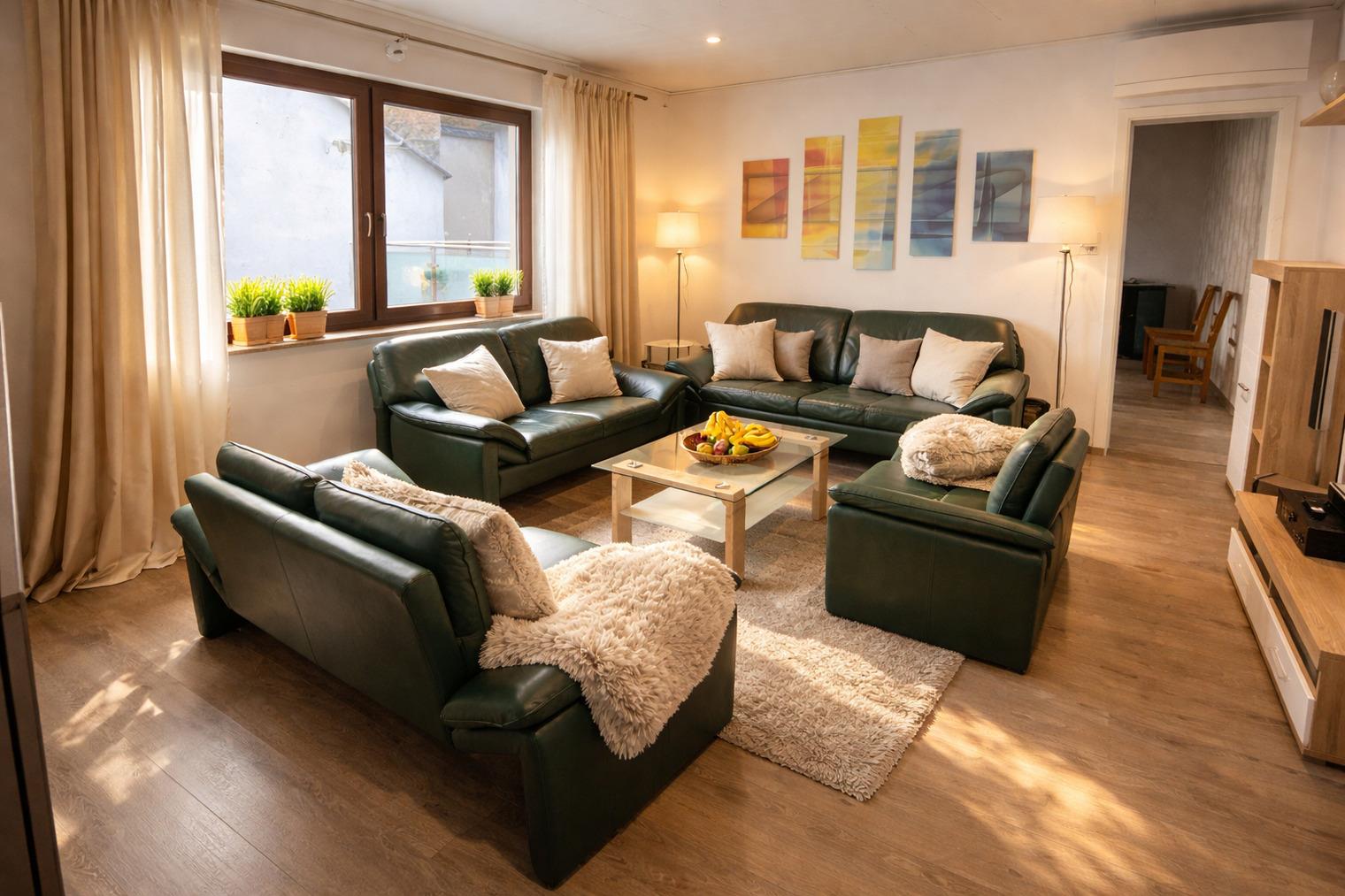 - Ein großzügiges Wohnzimmer mit Kamin – für gemütliche Abende mit Rheinromantik