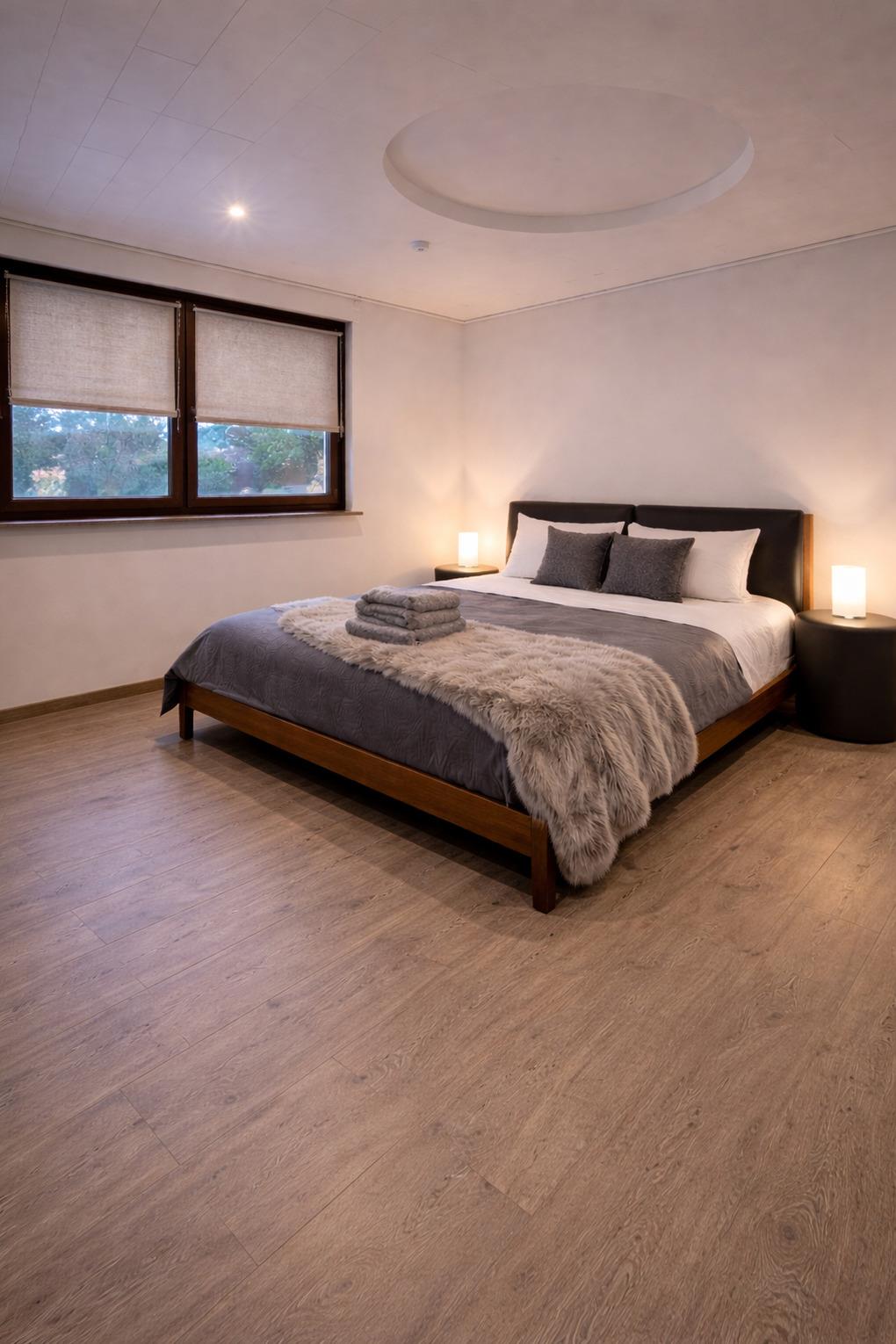 - Zwei elegante Schlafzimmer mit komfortablen Polsterbetten, eines davon elektrisch verstellbar.
