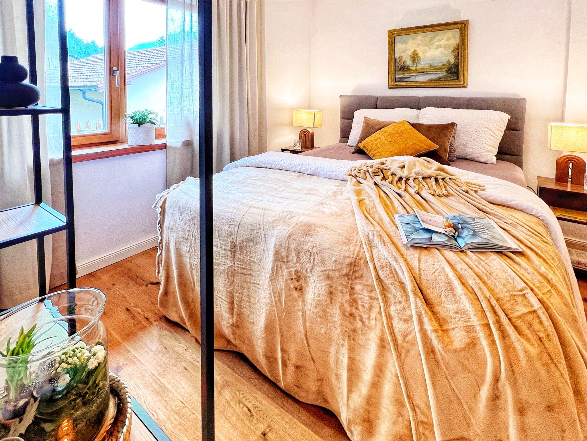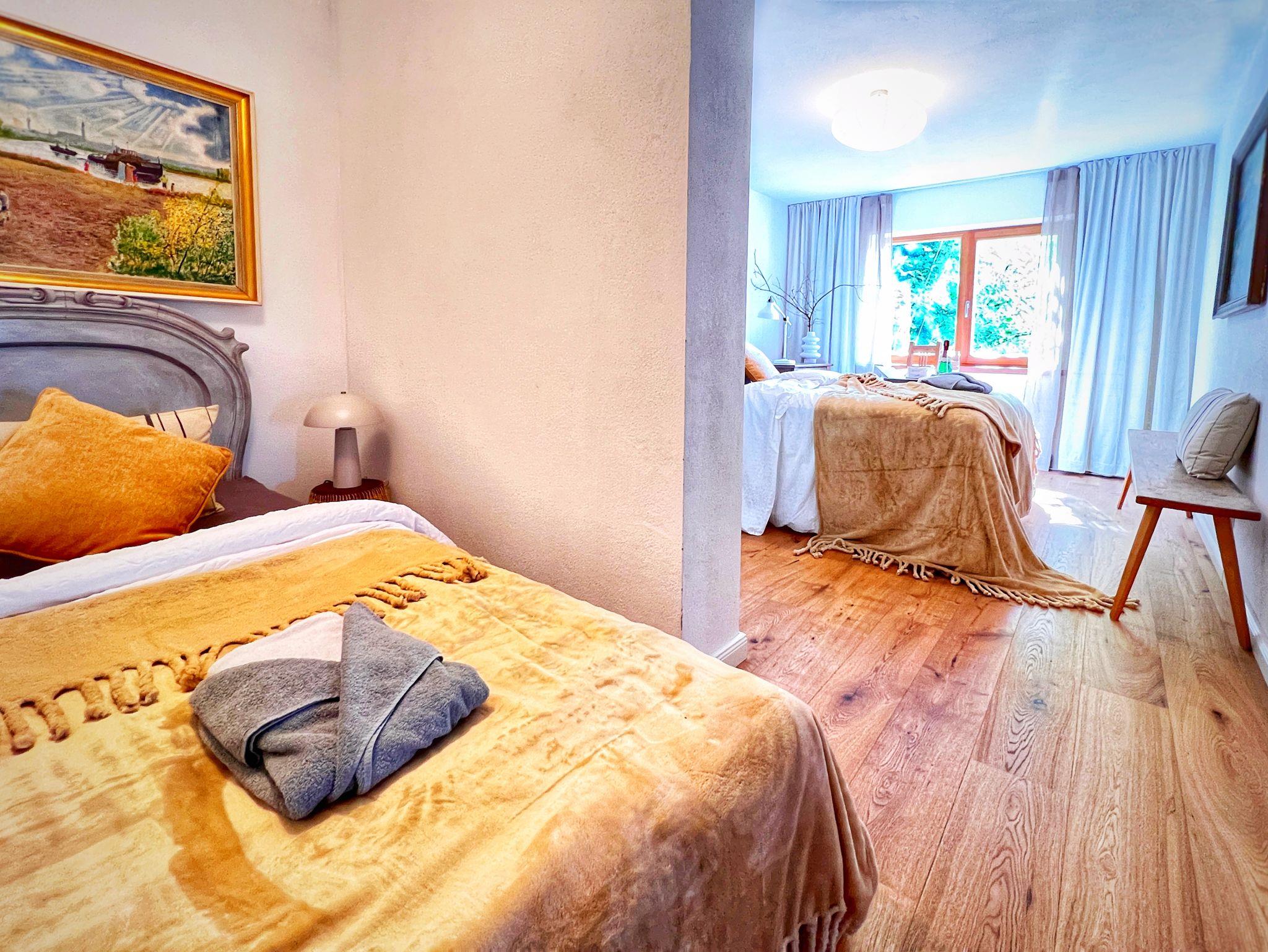 Alle 3 Schlafzimmer sind mit Boxspringbetten 160 x 200 ausgestattet. In einem der Schlafzimmer befindet sich in einen weiteres Einzelbett in Überlänge 90 x 220 und ein Arbeitsplatz. Alle Betten verfügen über Qualitätsmatratzen . Die Bettwäsche ist in Komfortgröße 155 cm x 220 cm genäht. Auf Wunsch kann ein Schlafraum mit Kinderreisebett oder Matratzenbett ergänzt werden.