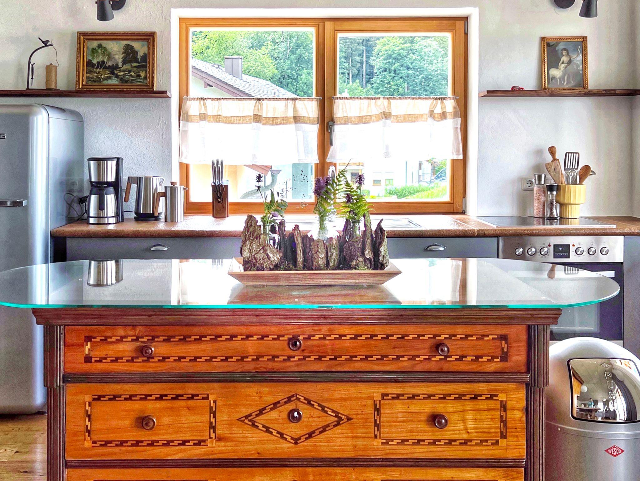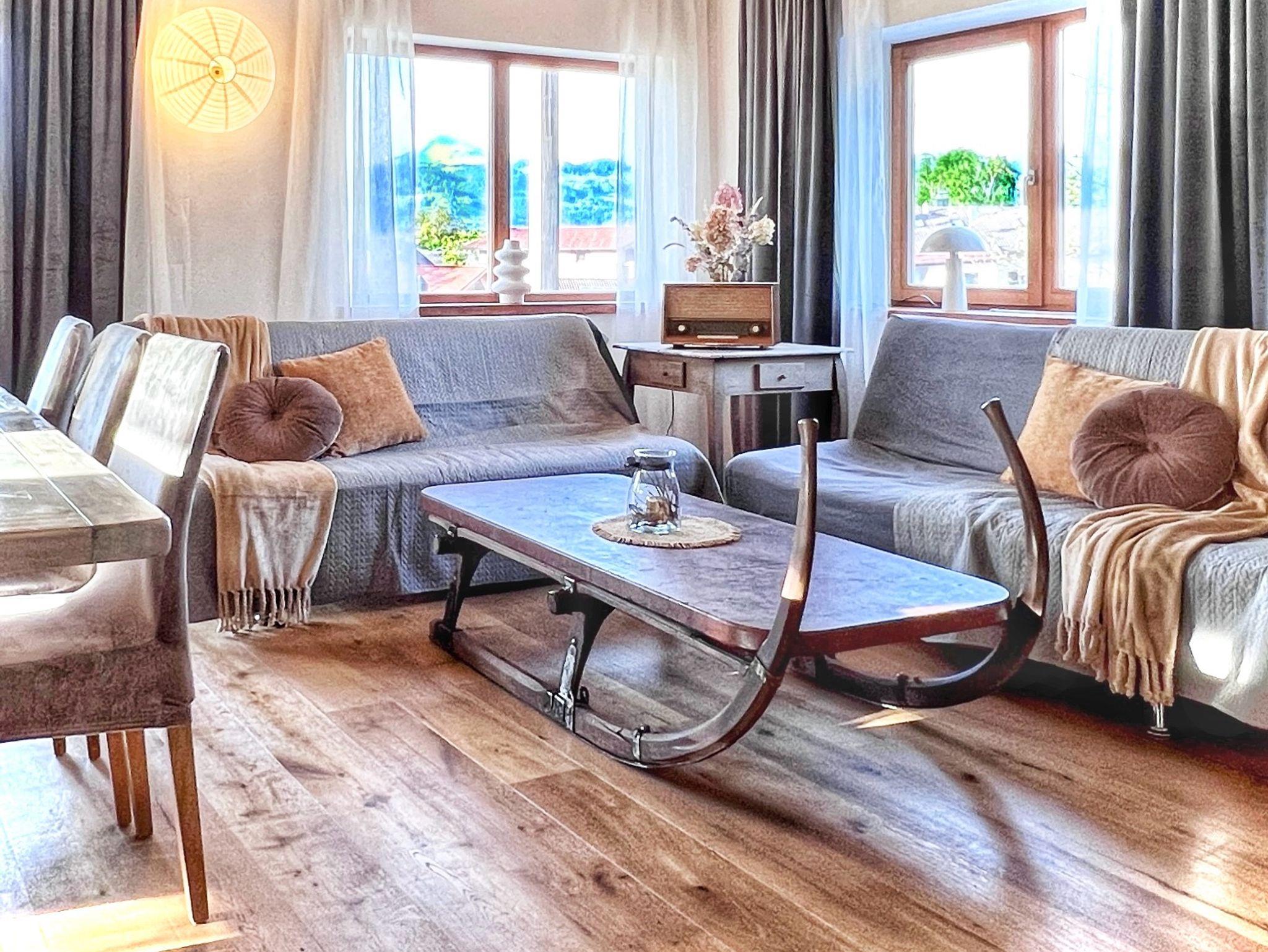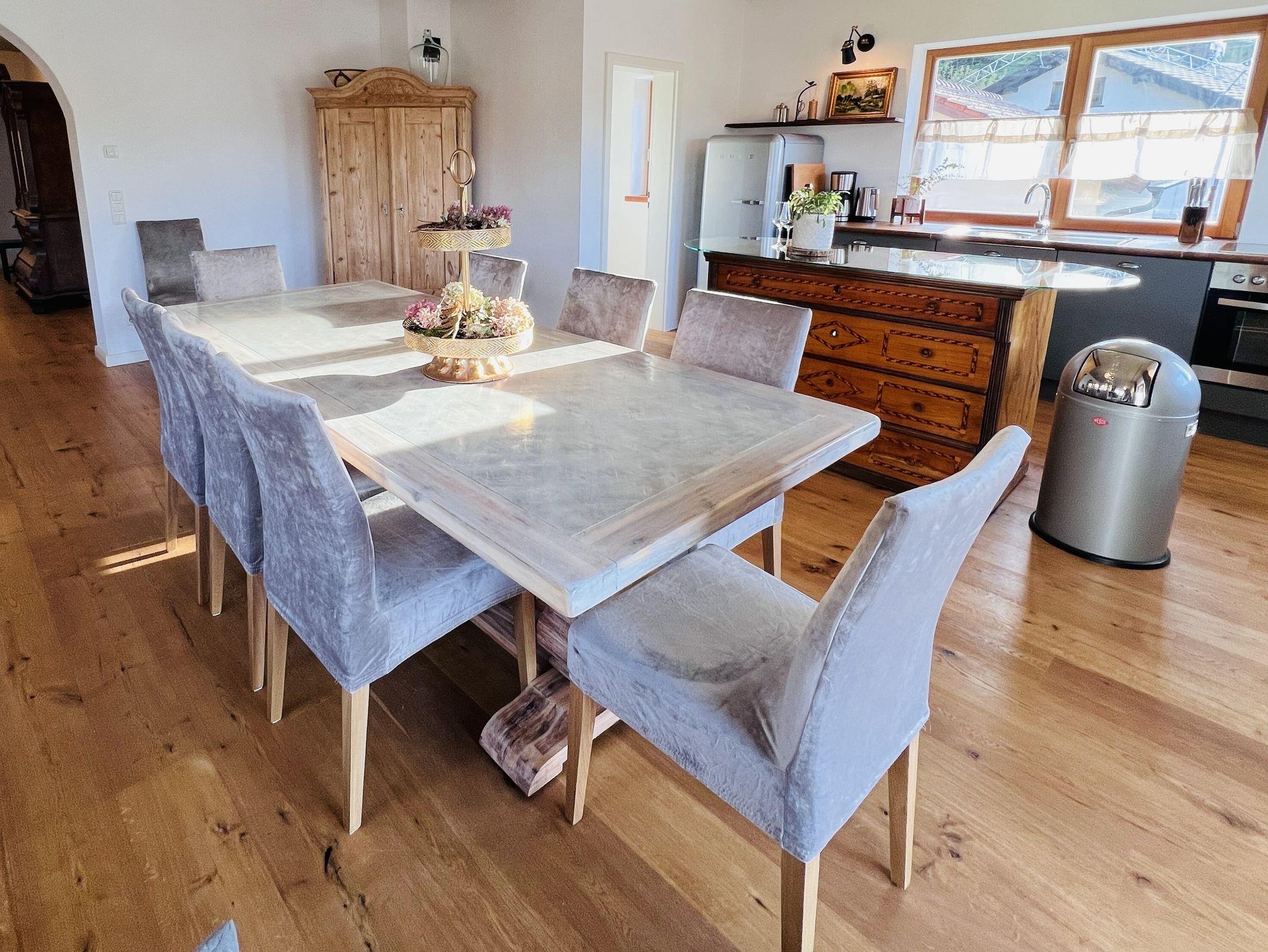 Der Wohnbereich, mit seinem großzügigen Tisch mit 10 Polsterstühlen (2,50 x 0,95) im Zentrum, lädt zum geselligen Miteinander ein. Dort angrenzend befindet sich die moderne, gut ausgestattete Küchenzeile. Sie ist mit Geschirrspülmaschine, Backofen, Ceranfeld, Toaster, Wasserkocher und Kaffeeautomat ausgestattet. Ein antike Kommode wurde als Küchenblock umgestaltet und ergänzt nun als Kontrapunkt die moderne Küche. Im Wohnbereich laden zwei große Sofas zum Verweilen ein. Bei Bedarf können diese auch als Schlafplätze genützt werden.