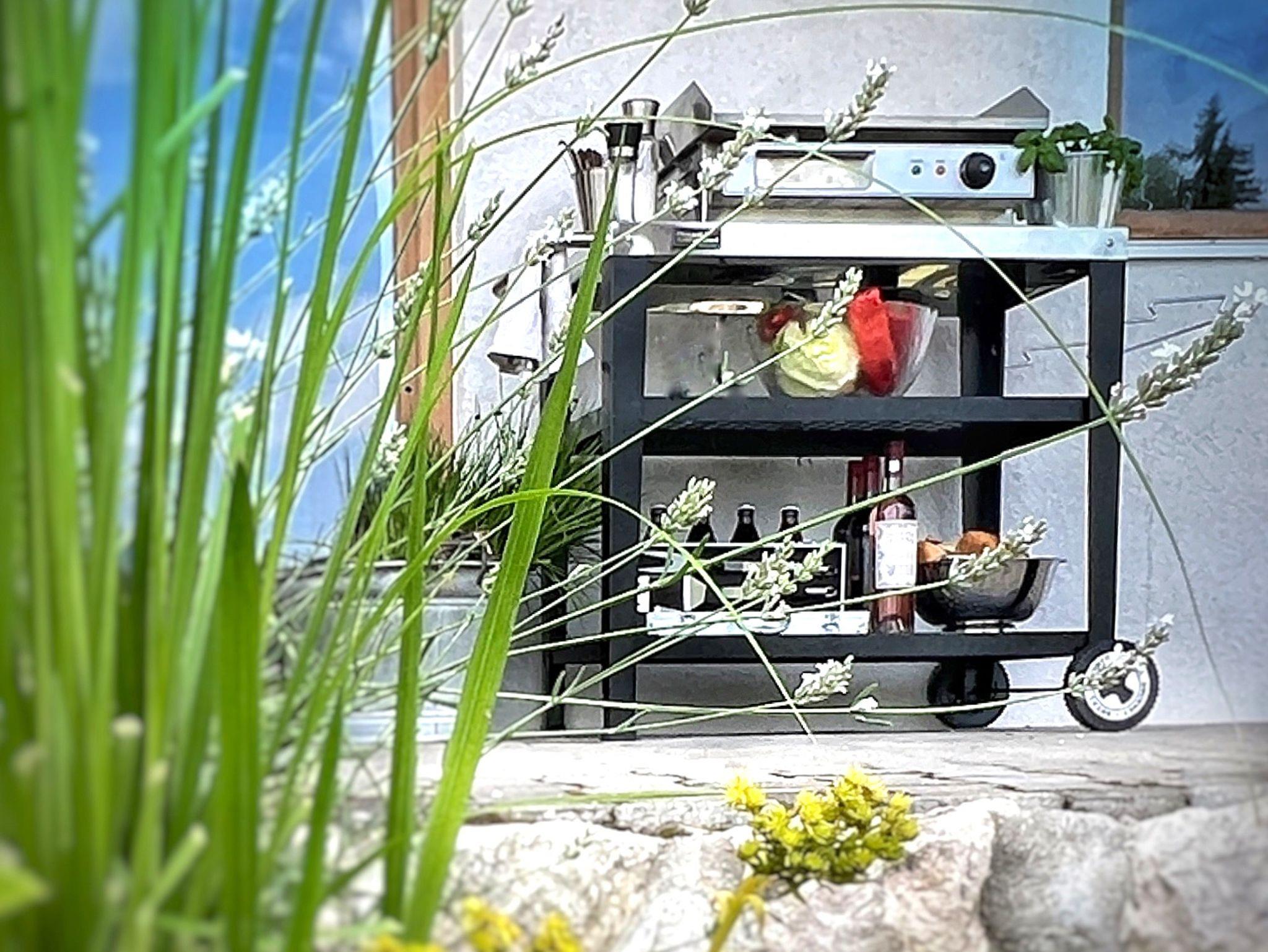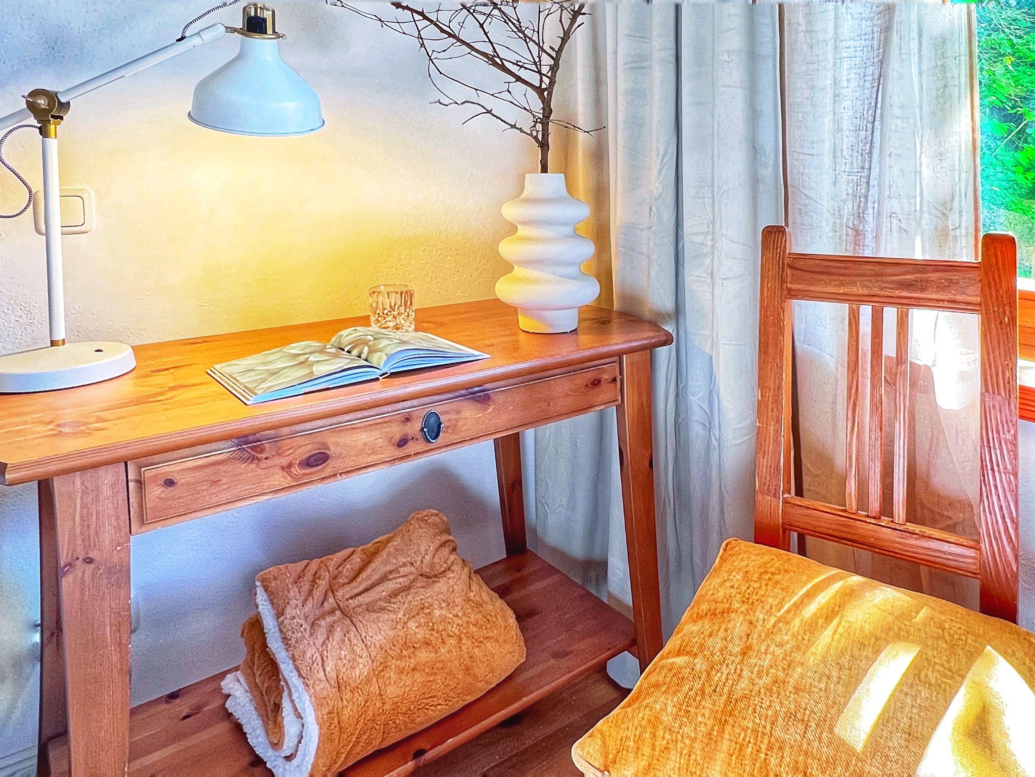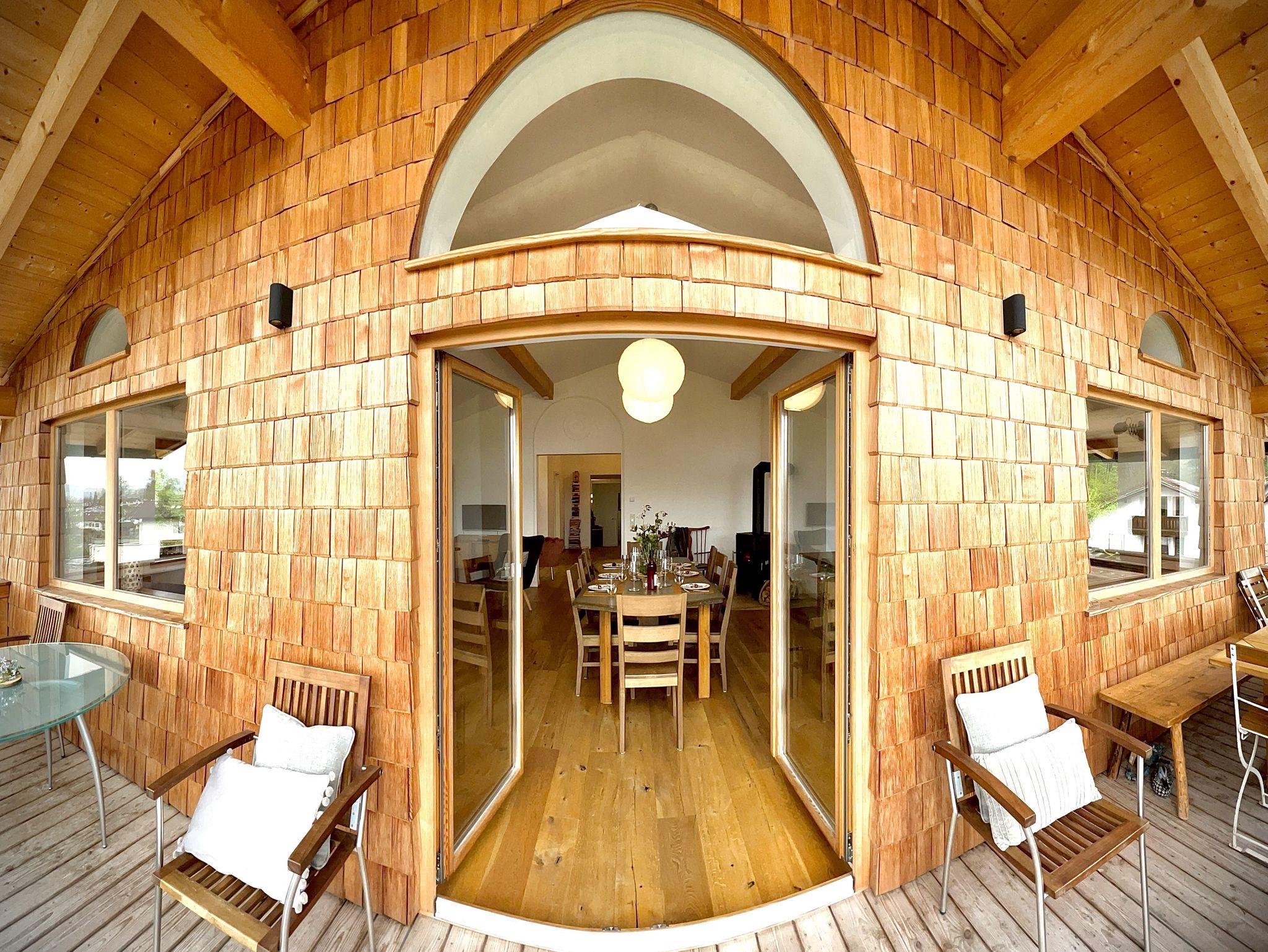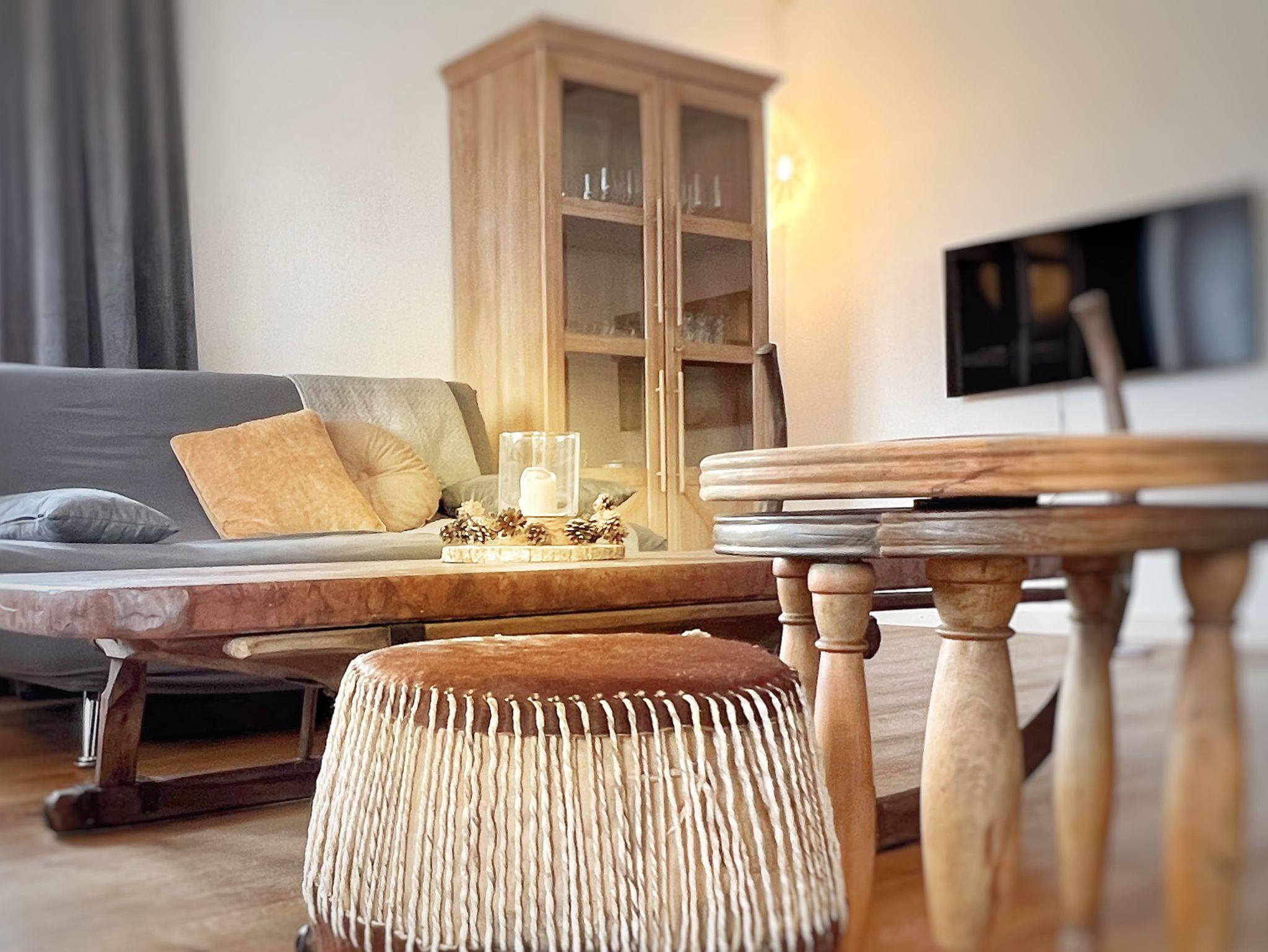 Der Wohnbereich, mit seinem großzügigen Tisch mit 10 Polsterstühlen (2,50 x 0,95) im Zentrum, lädt zum geselligen Miteinander ein. Dort angrenzend befindet sich die moderne, gut ausgestattete Küchenzeile. Sie ist mit Geschirrspülmaschine, Backofen, Ceranfeld, Toaster, Wasserkocher und Kaffeeautomat ausgestattet. Ein antike Kommode wurde als Küchenblock umgestaltet und ergänzt nun als Kontrapunkt die moderne Küche. Im Wohnbereich laden zwei große Sofas zum Verweilen ein. Bei Bedarf können diese auch als Schlafplätze genützt werden.