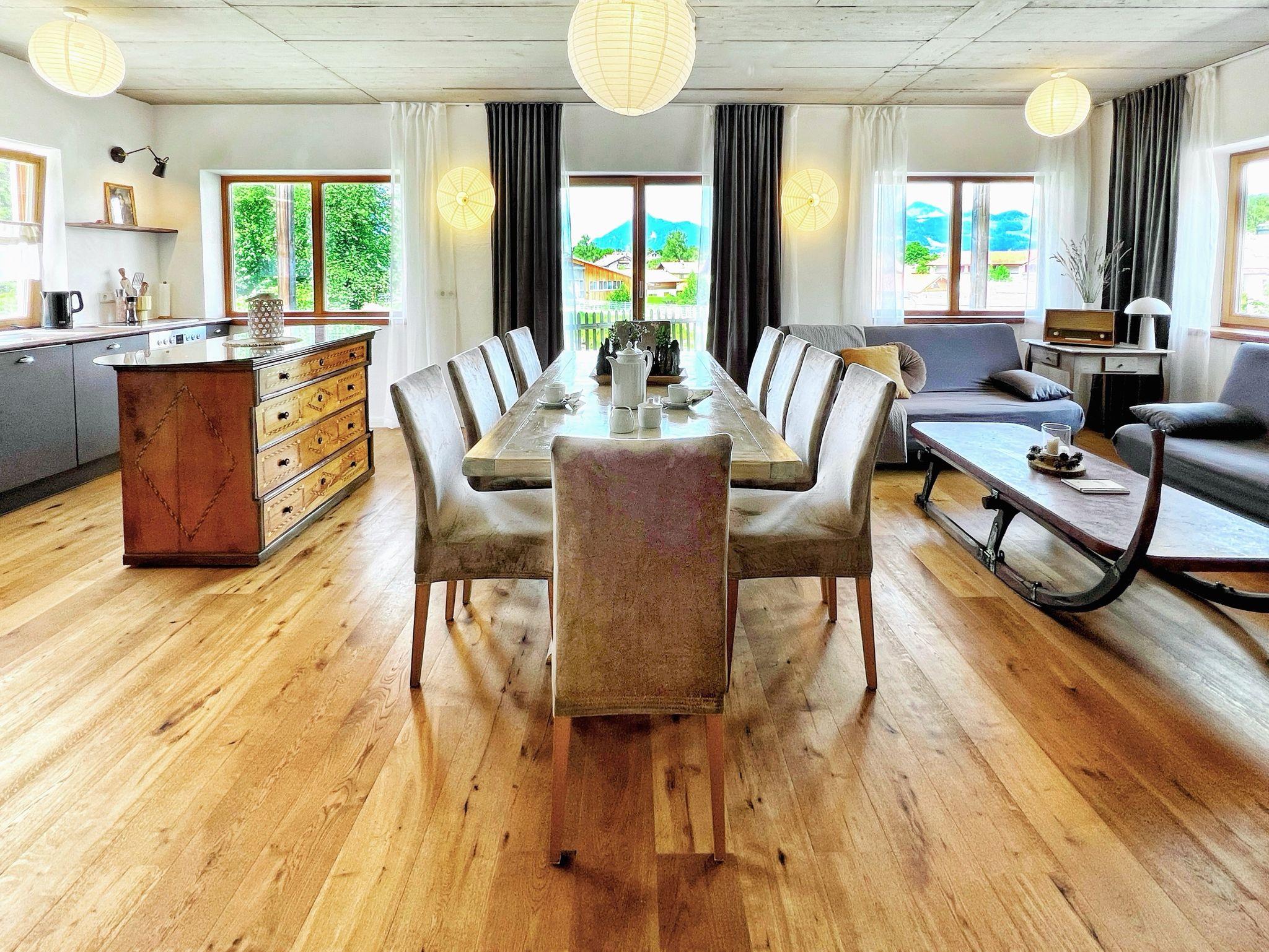 Wir haben eine großzügige Wohnung, die durch ihre zentrale und gleichzeitig naturnahe Lage als Top-Angebot für Alltag und Freizeit in allen Bereichen punktet. Planen Sie einen Skiurlaub mit Freunden oder Wanderurlaub mit der befreundeten Familie oder mit den Großeltern – hier in den Bergen und am Wasser, in unserem liebevollen Alpen-Domizil, findet ein jeder Abstand vom hektischen Alltag. Im Winter auf die Skipisten oder die Loipe starten oder daheim mit Bergblick entspannen. Das Ferienhaus hat zwei Ferienwohnungen mit separatem Eingang. Eine Ferienwohnung mit 150m² mit großem Balkon mit Panoramablick befindet sich im Obergeschossun d eine Ferienwohnung mit 140m² mit Terasse und Bachblick befindet sich im Erdgeschoss.