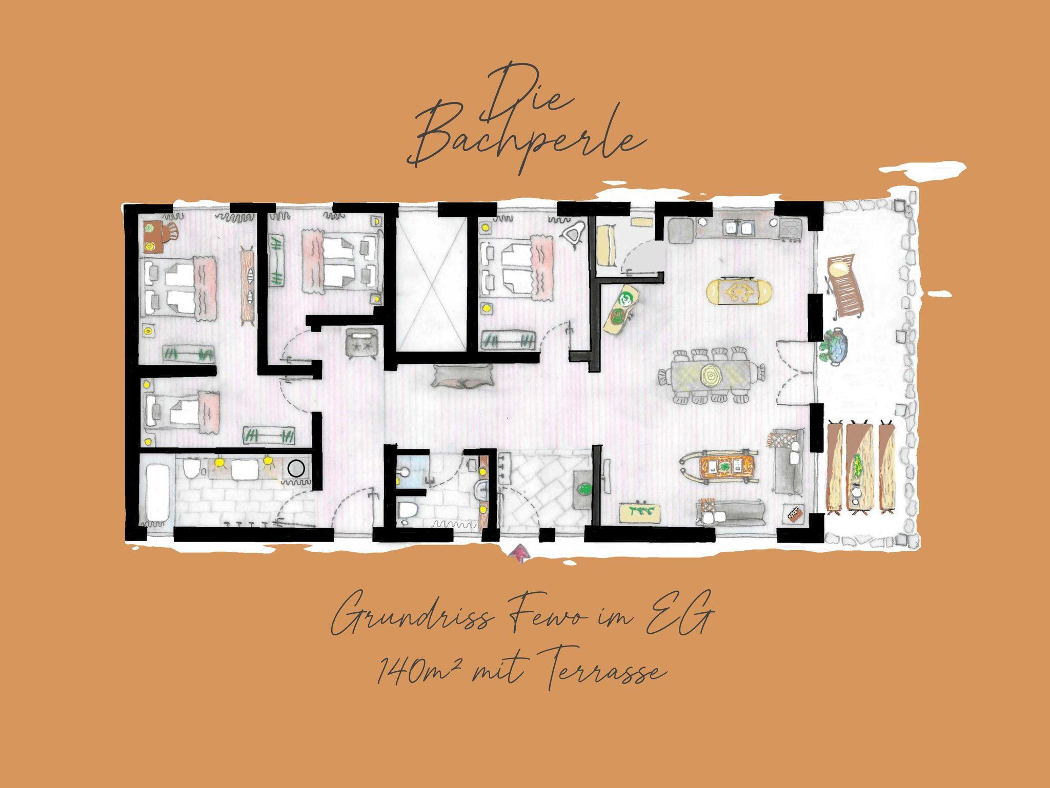 Die Fewo Bachperle mit Terrasse erstreckt sich auf das gesamten Erdgeschoss und ist für bis zu 9 Personen buchbar. im gleichen Ferienhaus im Obergeschoss befindet sich eine zweite Fewo Bachperle mit Balkon, die für bis zu 10 Personen extra zu buchen ist. So finden bis zu 19 Personen bequem im Ferienhaus Bachperle Platz. Jede Fewo hat einen eigenen Eingang, sodass sich das Ferienhaus ideal für gemeinsam reisende Familien oder Freunde eignet, die trotzdem Wert auf eine eigene Privatsphäre legen. Das Haus ist ideal für Familien-, Freundesgruppen und Firmen für Schulung oder Teambuilding bis max. 19 Personen. In dieser zentral gelegenen Unterkunft sind Geschäfte, Restaurants und Schwimmbad in der Nähe, und zugleich können Sie Wanderungen, Radtouren und Badeausflüge direkt vor der Haustür starten.