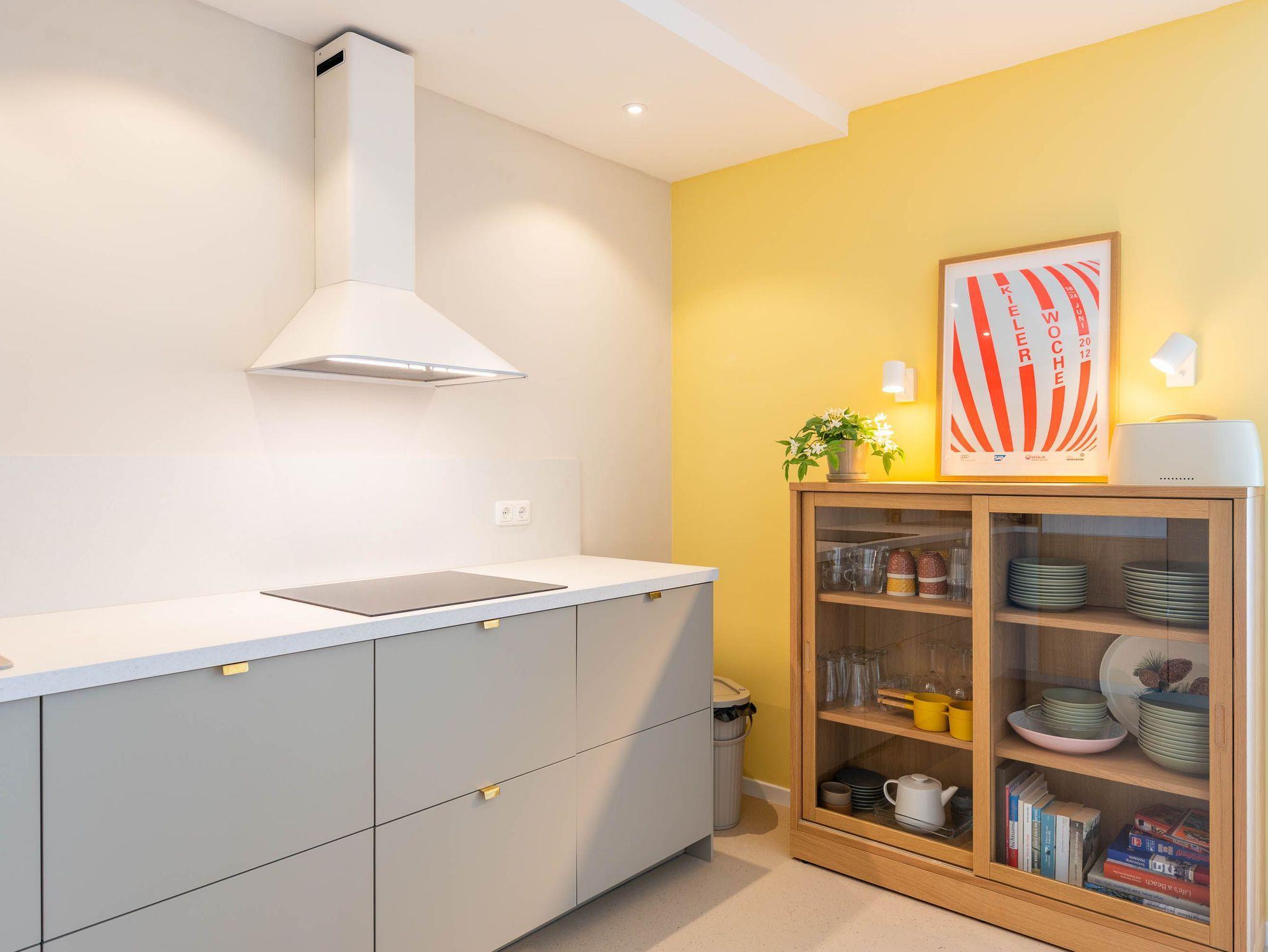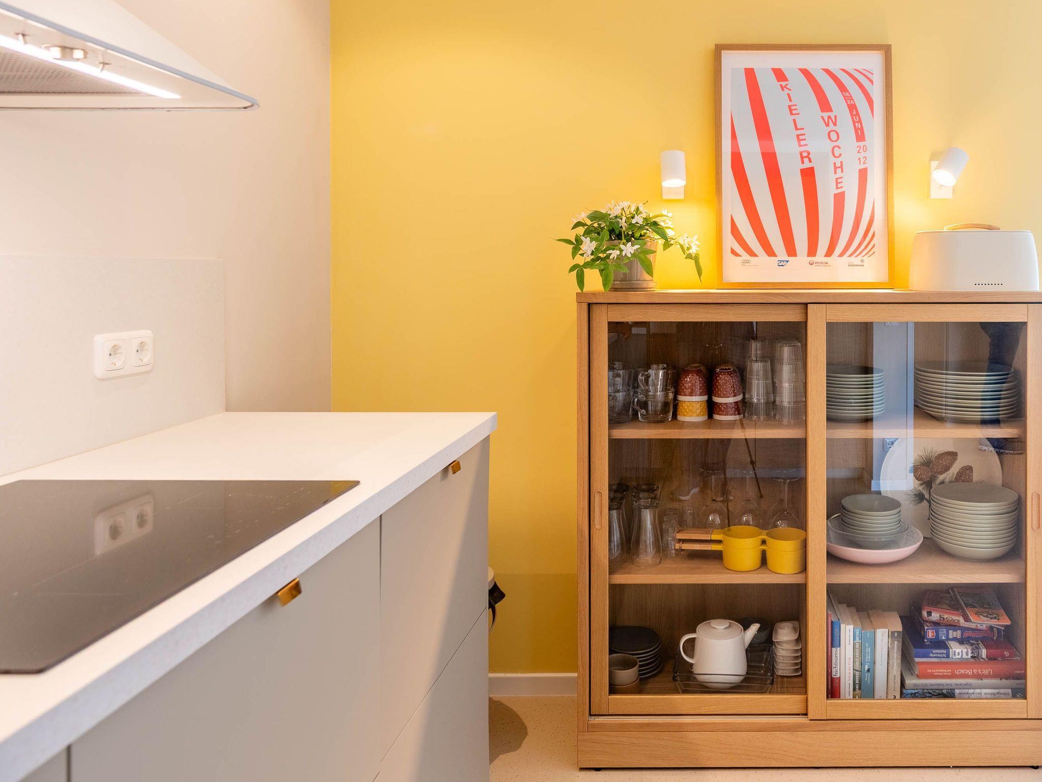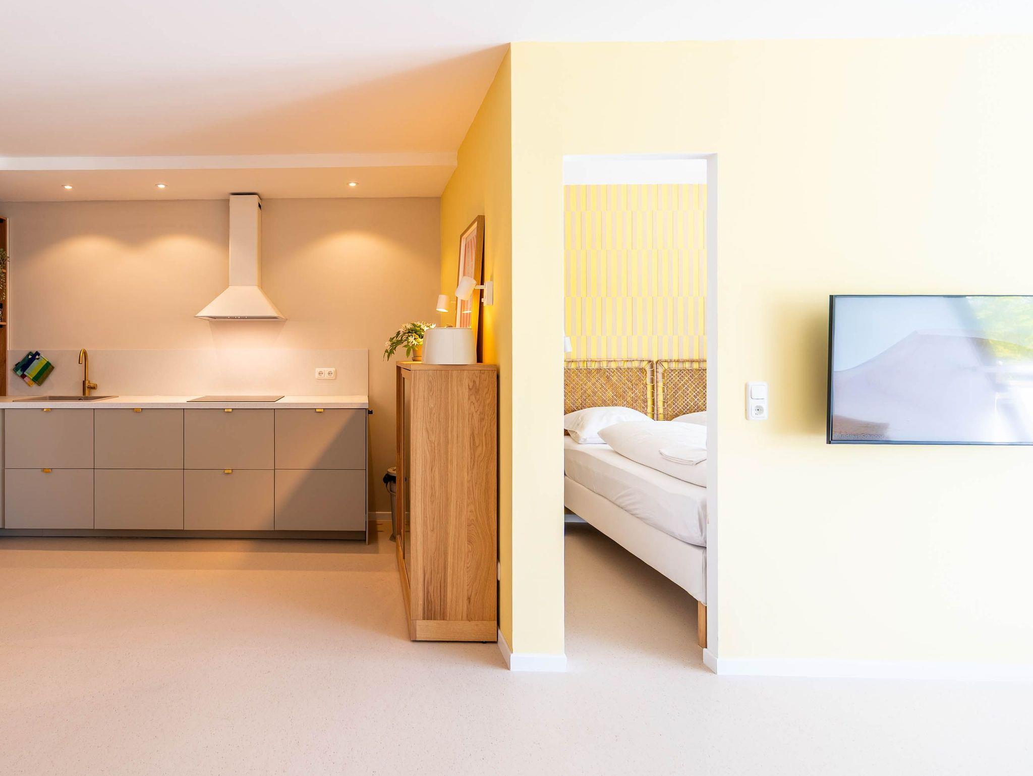 Im gesamten Appartment ist ein Design Fußboden verlegt worden. Die Ferienwohnung ist mit einer Wohnküchenzeile ausgestattet. Neben der Grundausstattung wie einem Backofen, Cerankochfeld, Wasserkocher, einer Kaffeemaschine und ausreichend Geschirr, ist auch eine Geschirrspülmaschine vorhanden. Mit dieser Ausstattung steht einer selbstgemachten Mahlzeit nichts mehr im Wege. Ebenso befindet sich eine Waschmaschine in der Küchenzeile.