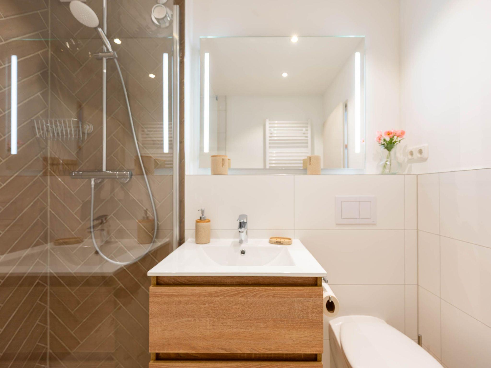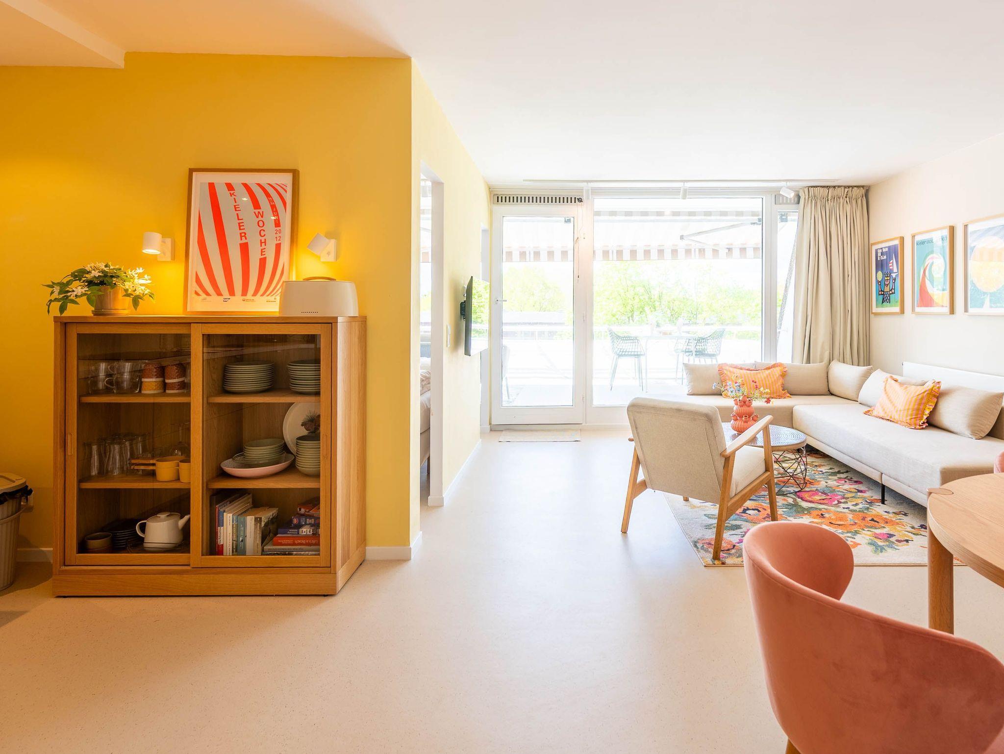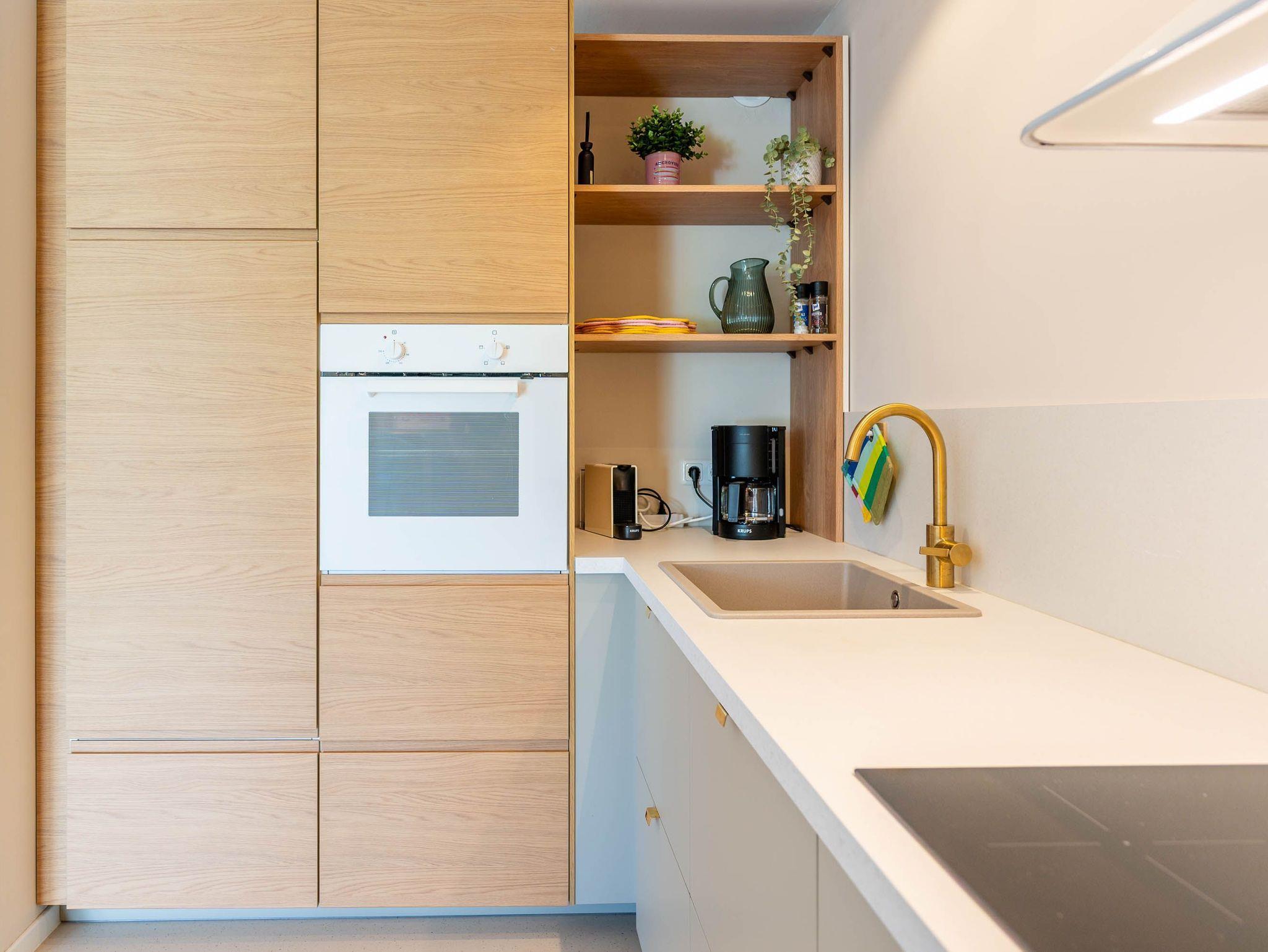 Im gesamten Appartment ist ein Design Fußboden verlegt worden. Die Ferienwohnung ist mit einer Wohnküchenzeile ausgestattet. Neben der Grundausstattung wie einem Backofen, Cerankochfeld, Wasserkocher, einer Kaffeemaschine und ausreichend Geschirr, ist auch eine Geschirrspülmaschine vorhanden. Mit dieser Ausstattung steht einer selbstgemachten Mahlzeit nichts mehr im Wege. Ebenso befindet sich eine Waschmaschine in der Küchenzeile.