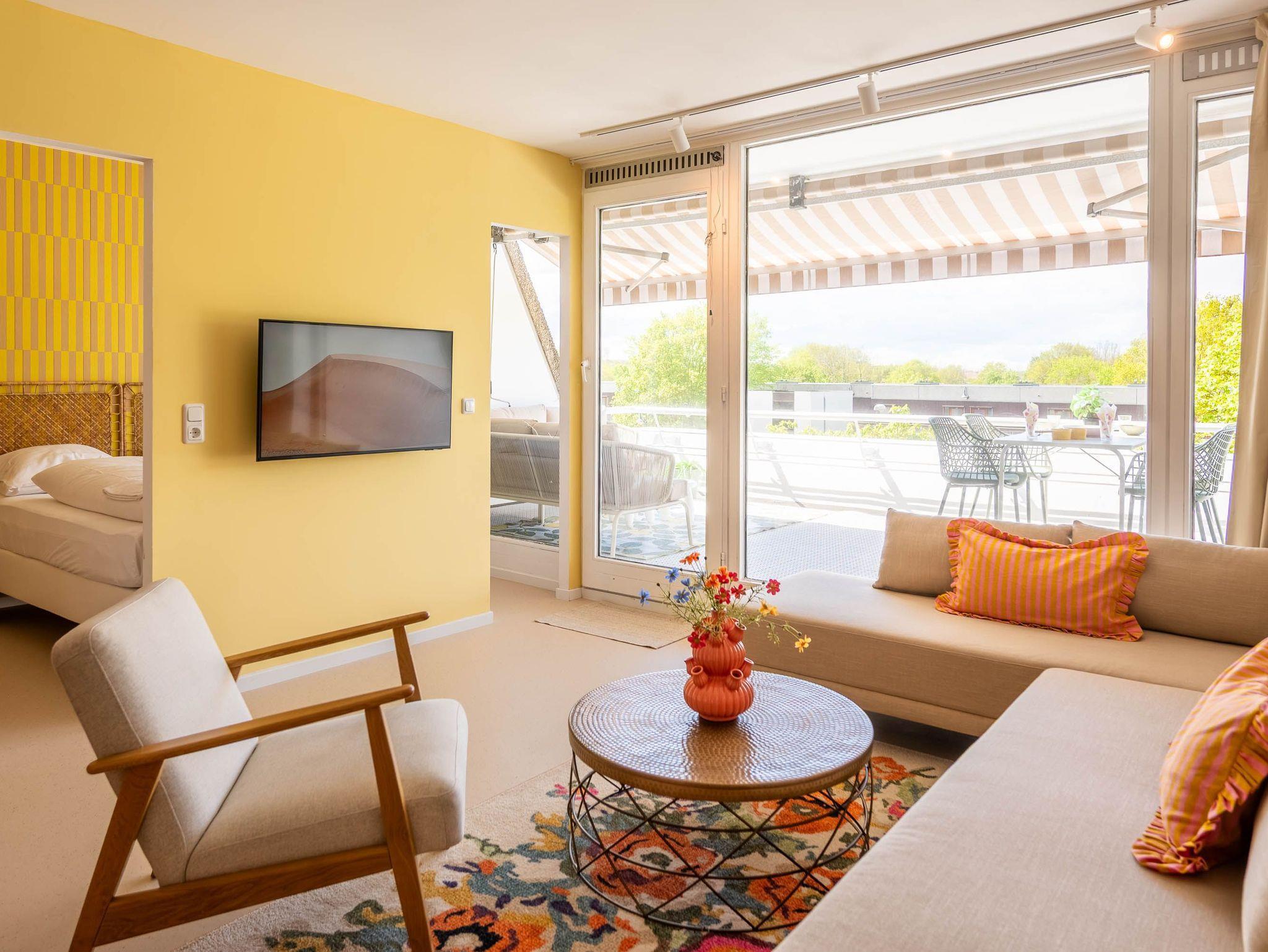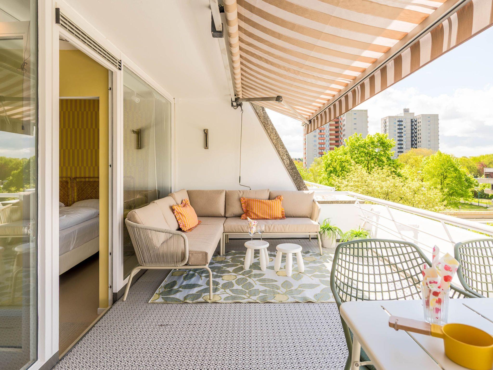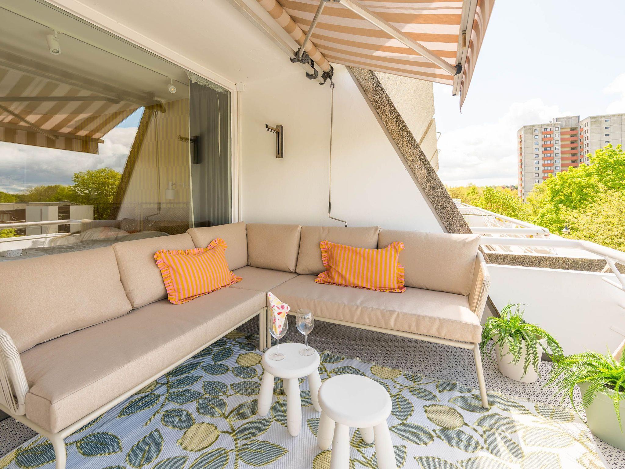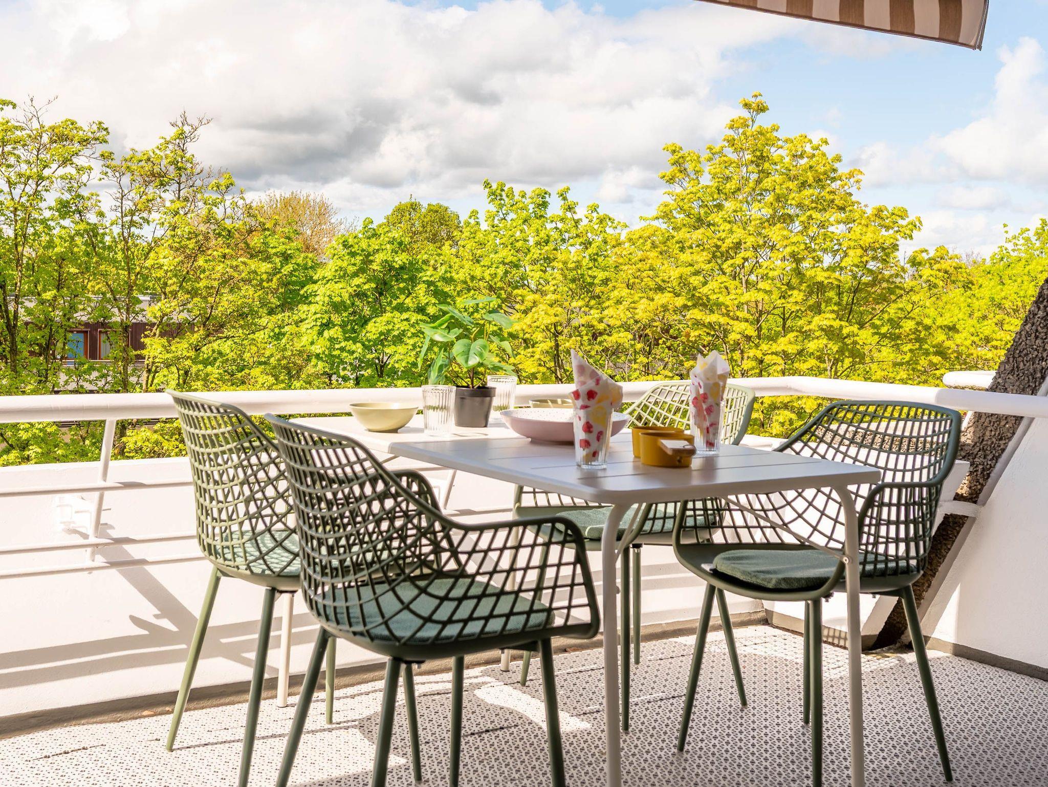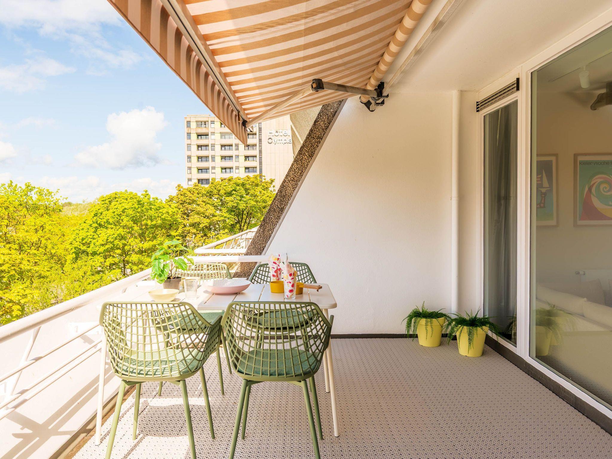 Vom Flur aus gelangen Sie in das 1,5-Zimmerappartment. Die Ferienwohnung verfügt in ganzer Breite über eine bodentiefe Fensterfront und einen dementsprechend langen Balkon. Die südwestliche Ausrichtung des Balkons mit Blick ins Grüne lässt Sie fast den ganzen Tag über Sonne haben. Eine Markise, sowie Gartenmöbel stehen Ihnen zur Verfügung. So kann auch bis in die Abendstunden hinein der Tag und die Sonne auf dem Balkon genossen werden.