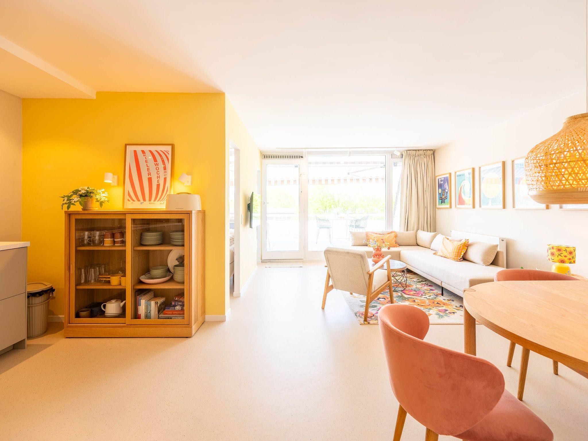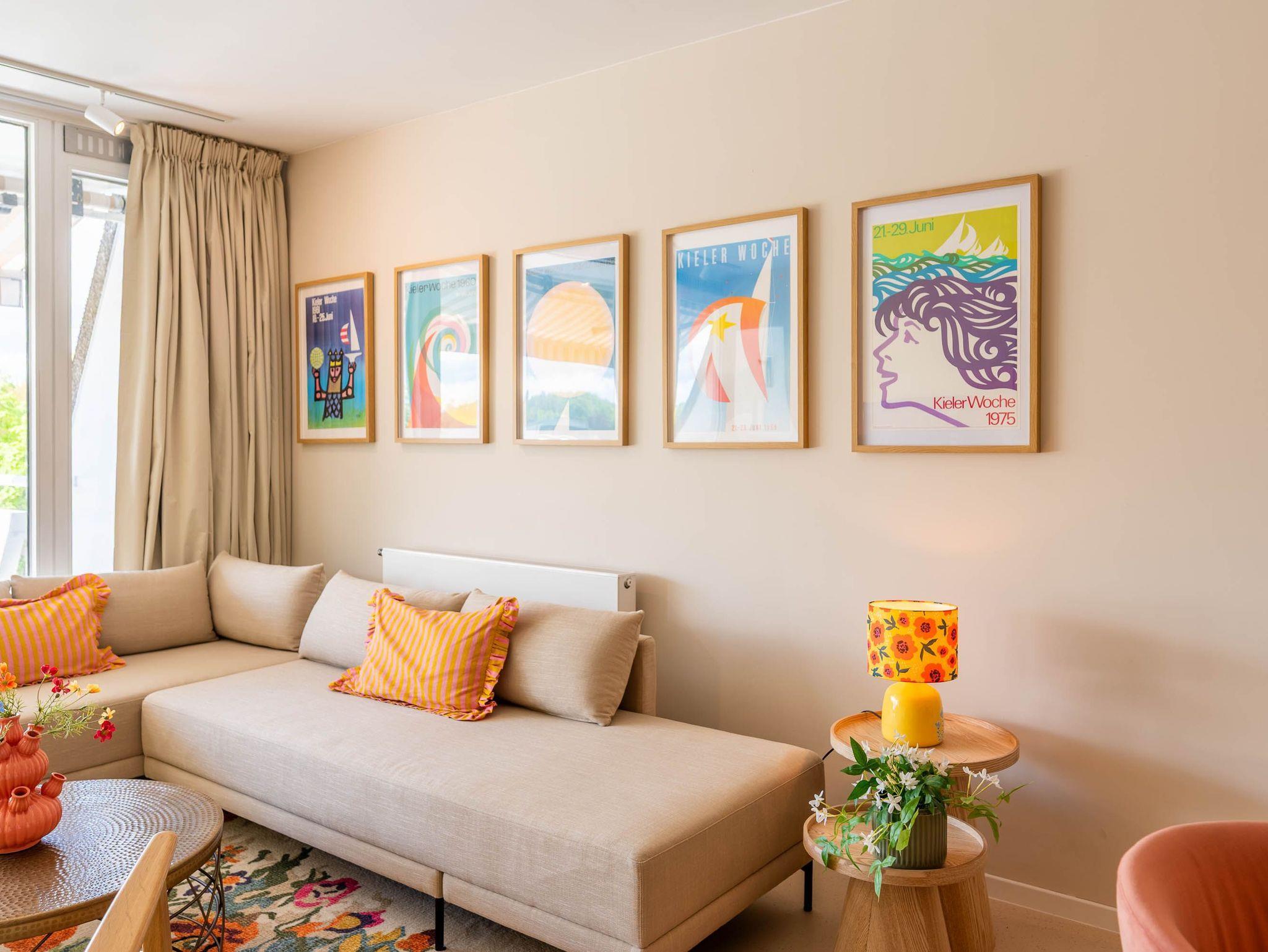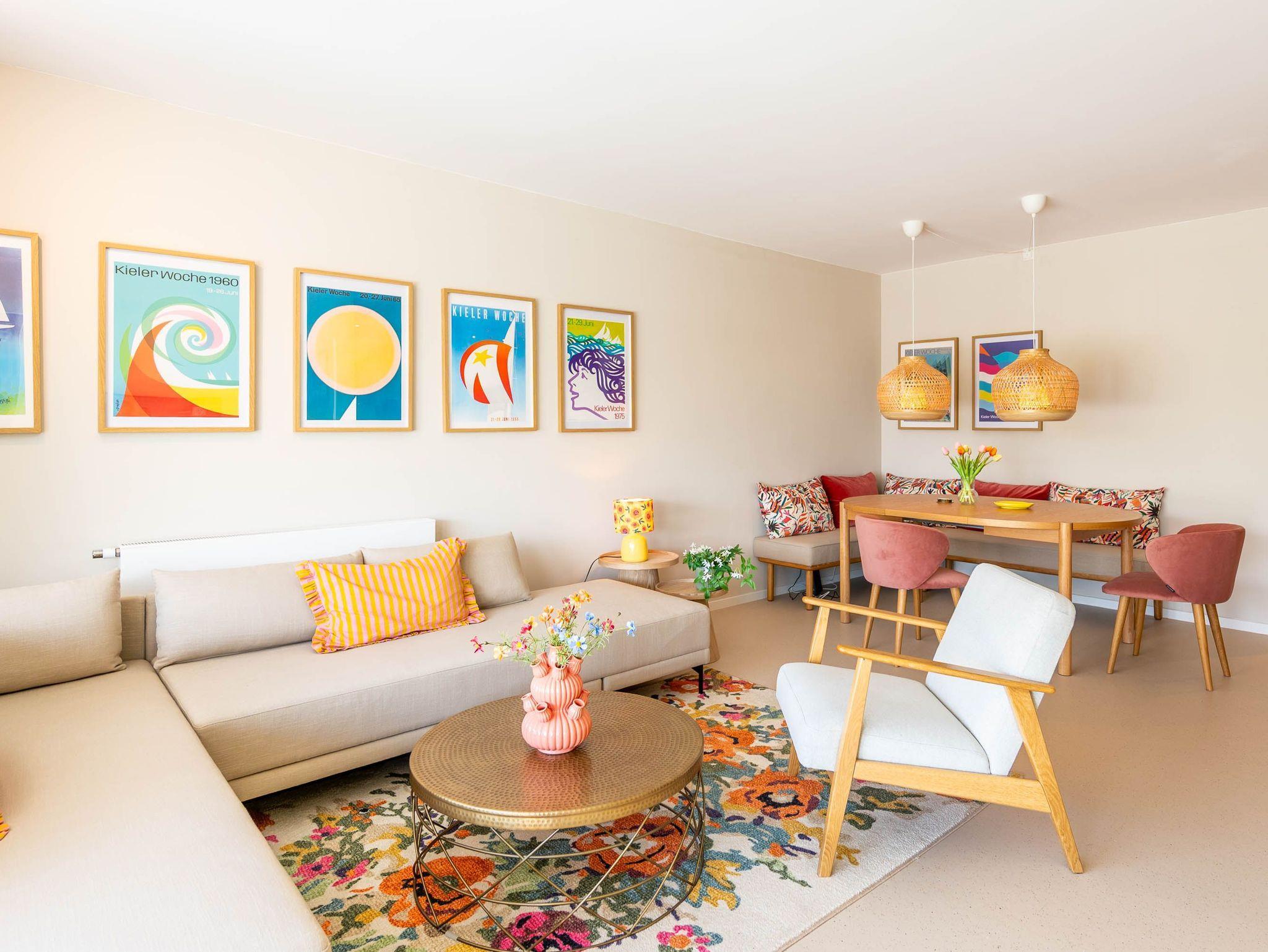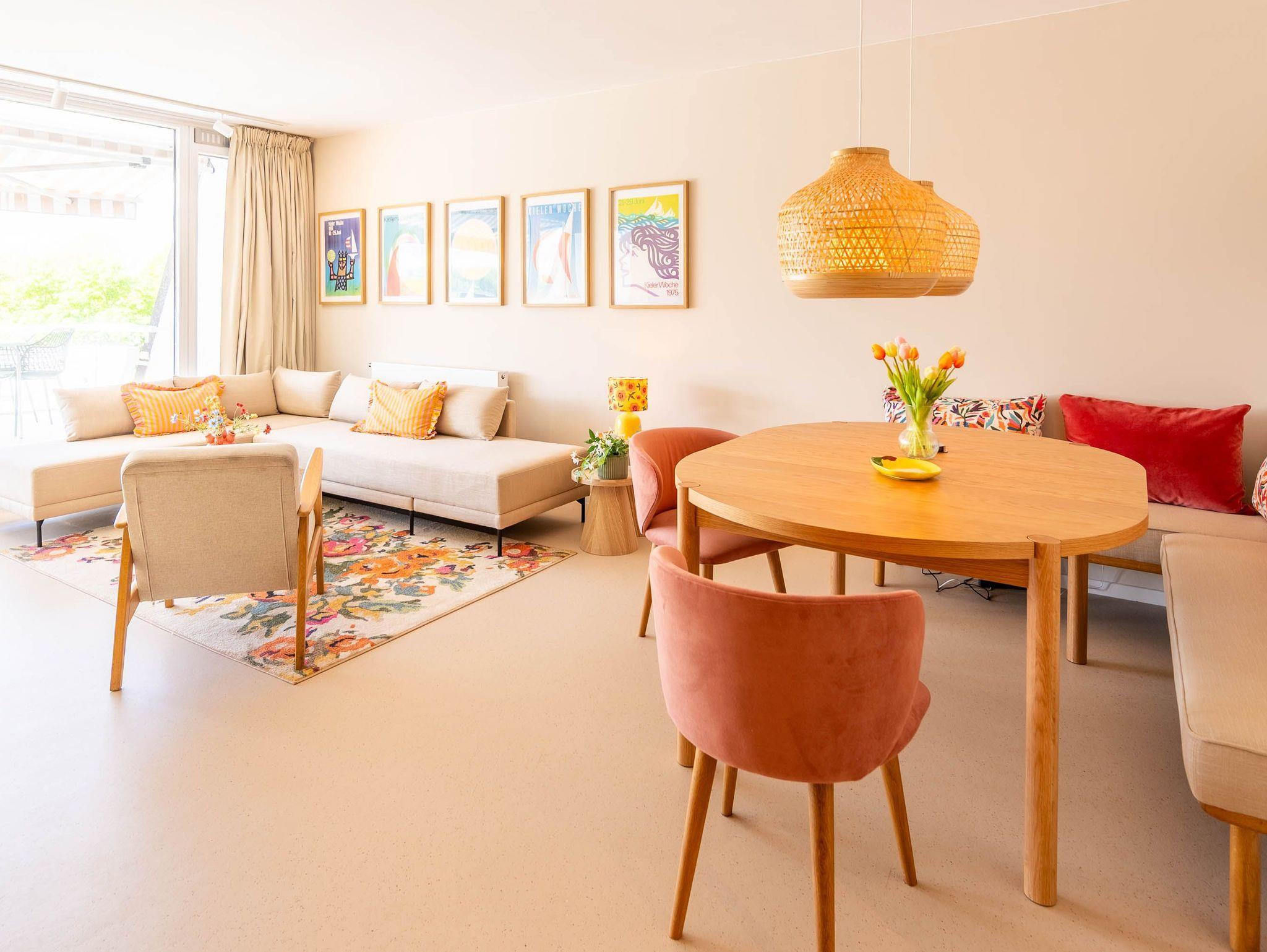 Direkt am Fenster befindet sich ein bequemer Sessel, sowie eine Couch, die mit wenigen Handgriffen als Schlafmöglichkeit für eine dritte und vierte Person umfunktioniert werden kann. Schöne Couchbezüge, sowie ein großer Couchtisch und ein Fernseher tragen zum Wohlfühlfaktor dieser Wohnung bei.