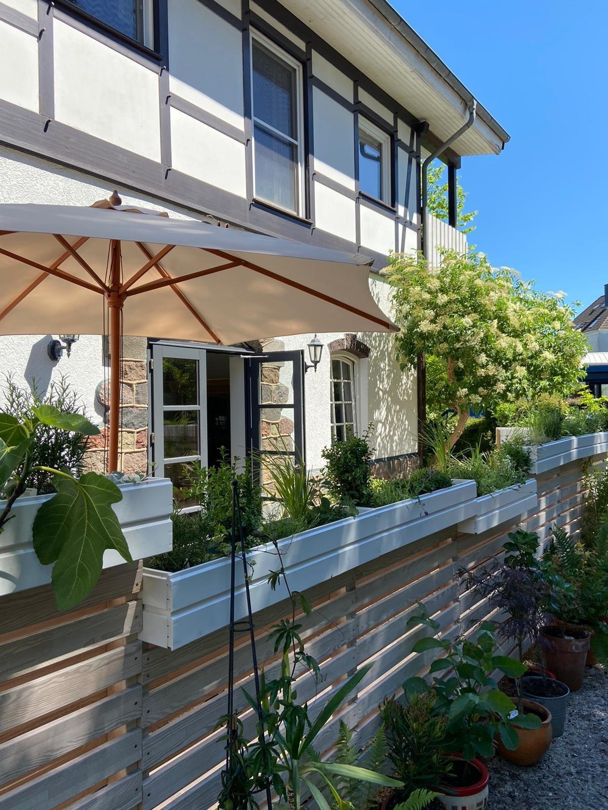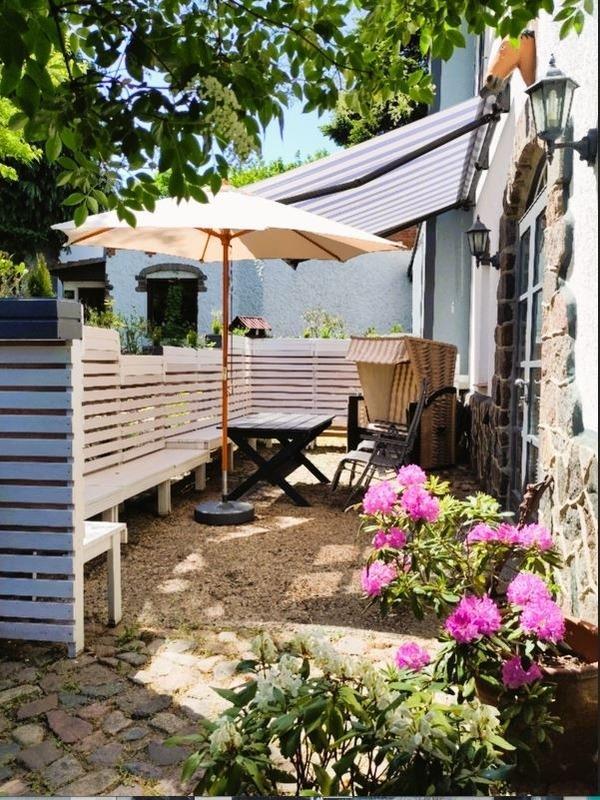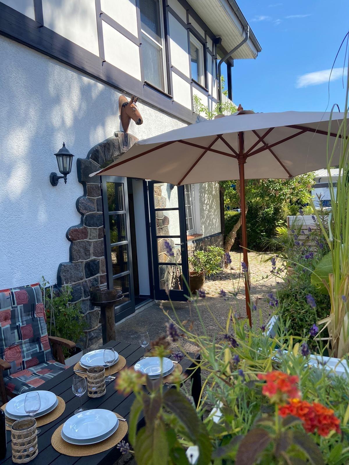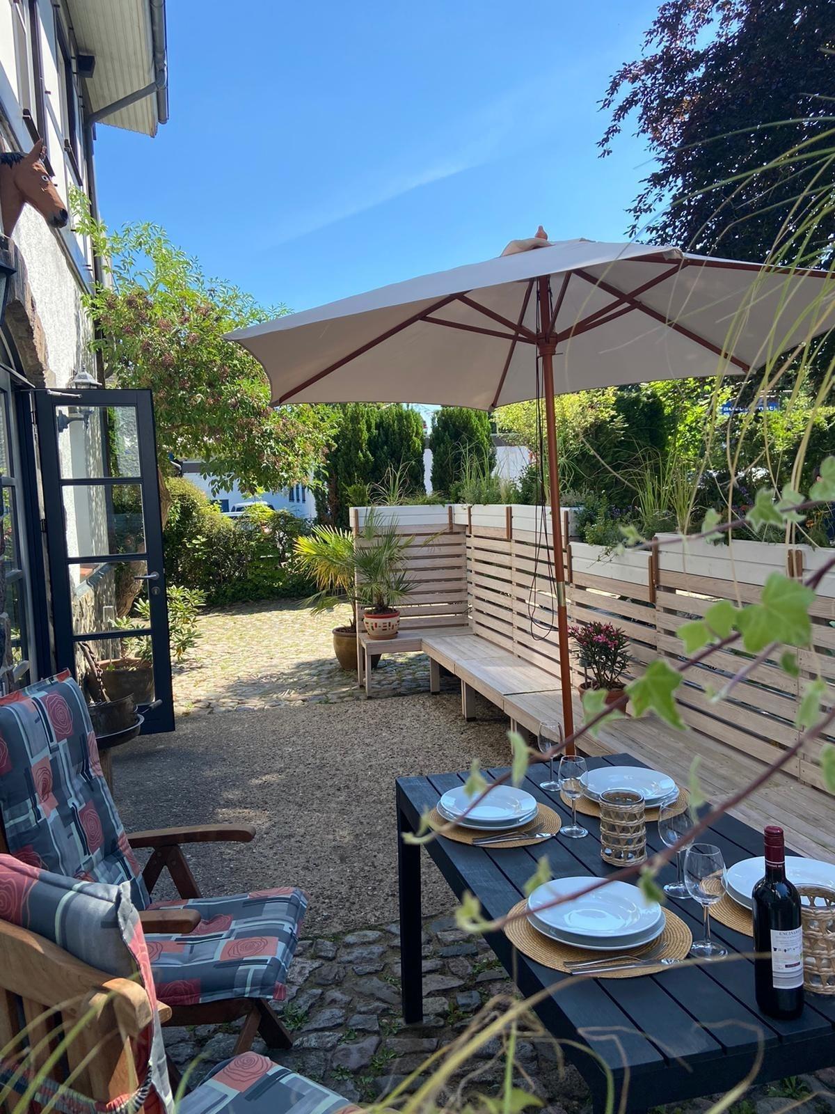 Vor der Wohnung, angrenzend an einen großen Vorgarten, ist auf einer ca. 25m² großen Terrasse Platz zum gemütlichen Sitzen, Sonnen im Strandkorb, Grillen etc.