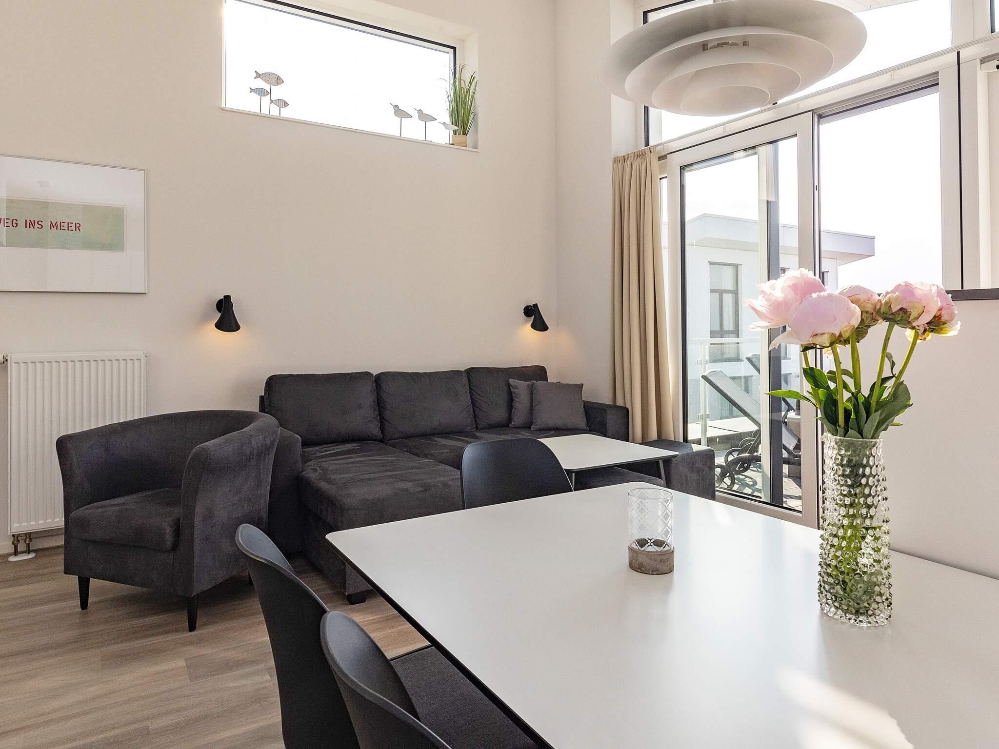 Den moderne og komfortabelt indrettede lejlighed består af et kombineret køkken- og opholdsområde, hvorfra der er adgang til den store tagterrasse. Det er muligt at låne en kikkert på servicekontoret. Ud over komfuret er der også en WOK-kogeplade. Der er 2 soveværelser med dobbeltseng og fladskærms-tv. De to andre sovepladser findes i form af en sovesofa i stuen. Desuden er der et badeværelse med regnskovseffektbruser med dampfunktion samt gulvvarme. Der er et tv med Blu-Ray-afspiller og en soundbar med Bluetooth-forbindelse. Bioethanolpejsen sørger for hygge.