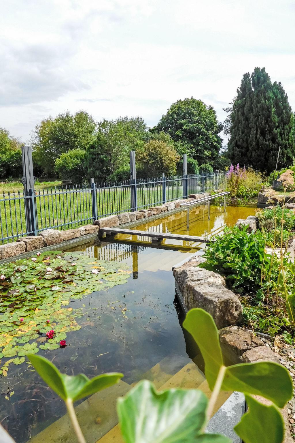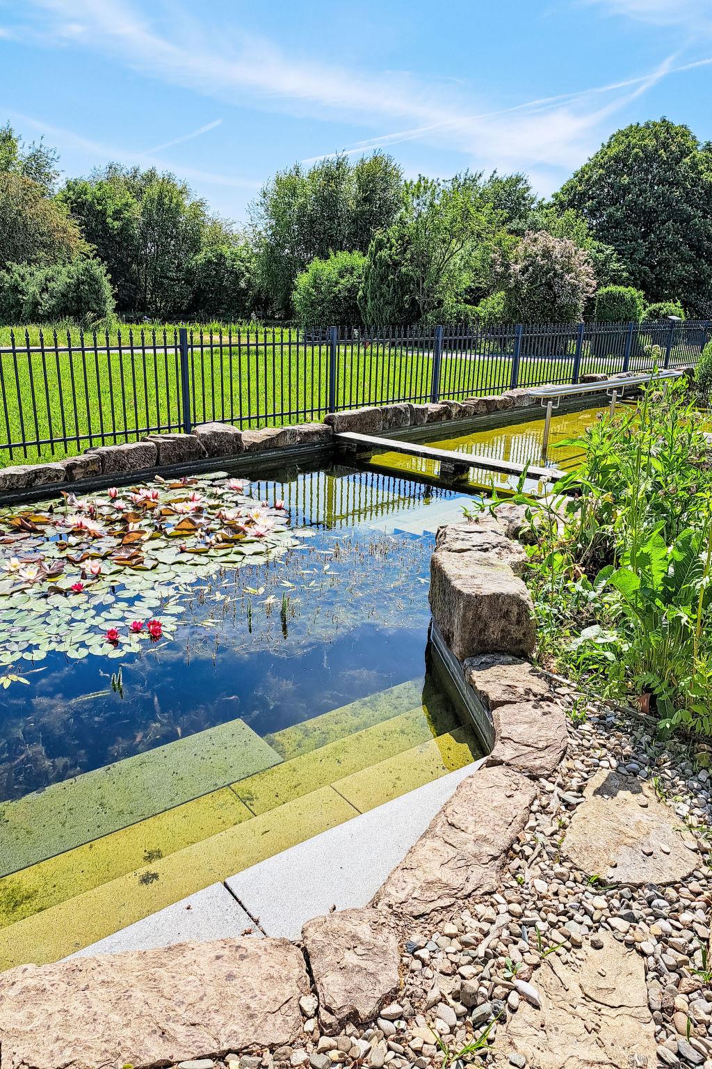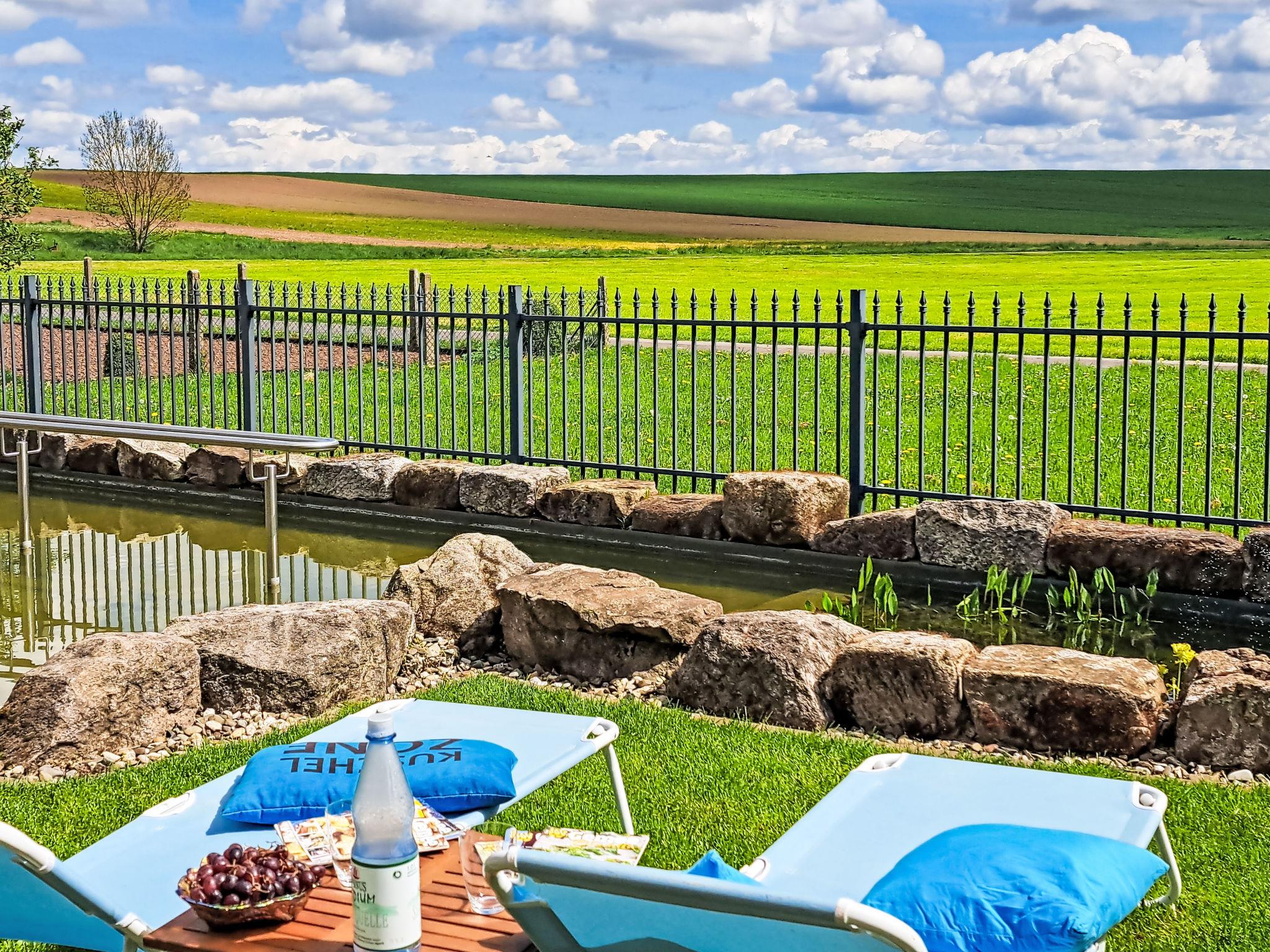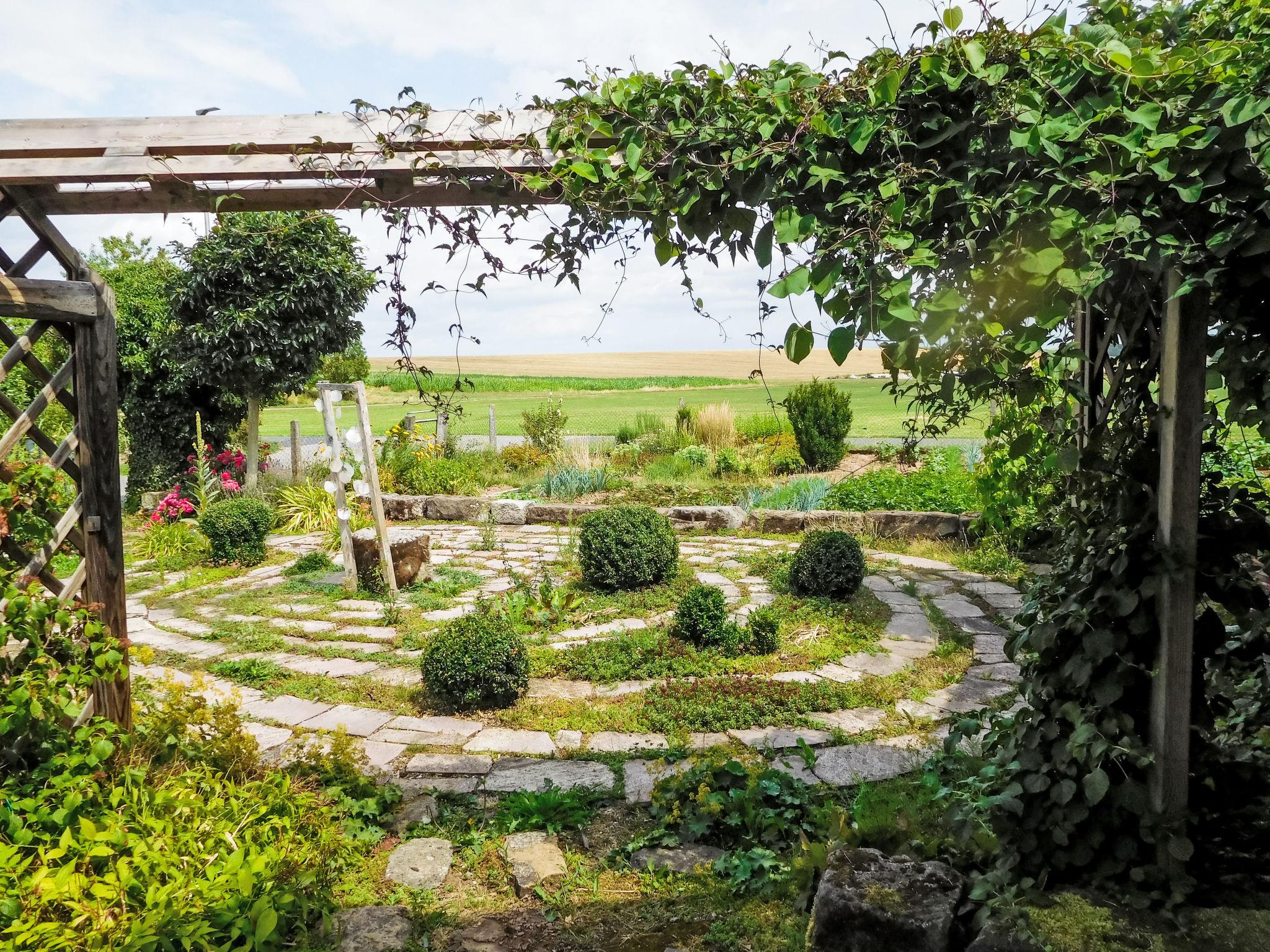 Prayer labyrinth, garden tables with seating and appropriate cushions, 2 x barbecue, enough deckchairs for everyone, 2 meadows, gardens, Kneipp facility with sauna and natural pool with treading, arm-diving and sunbathing areas in the water... particularly quiet location on the edge of the small village